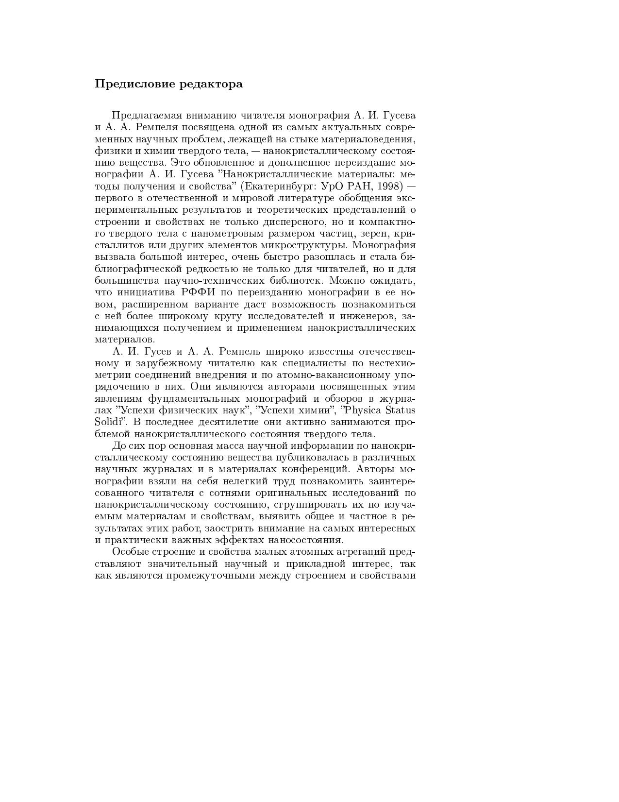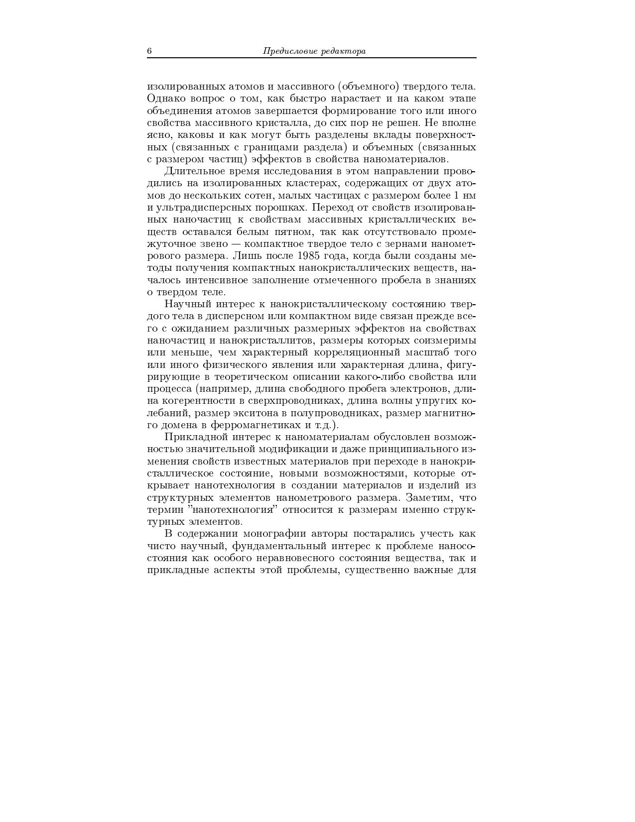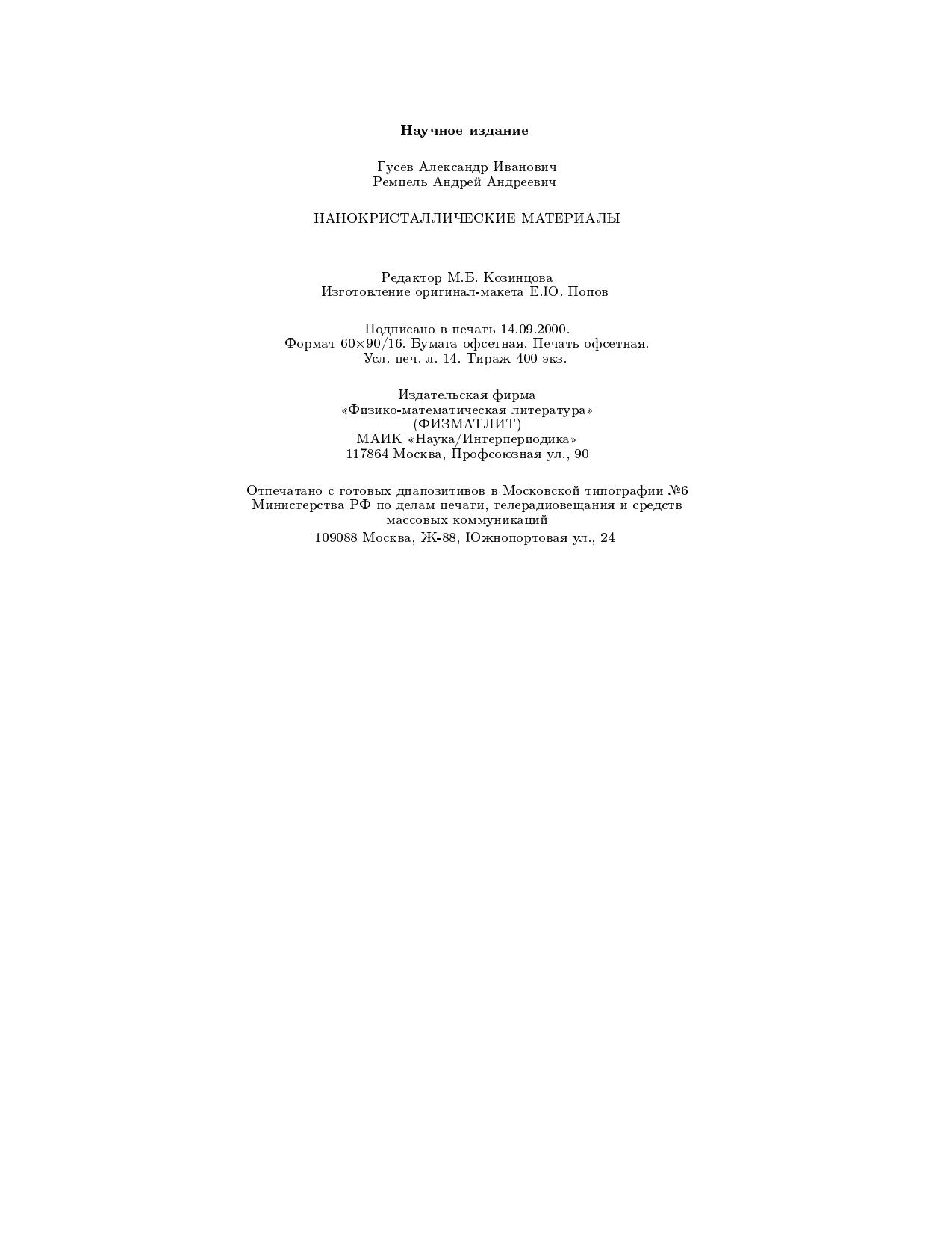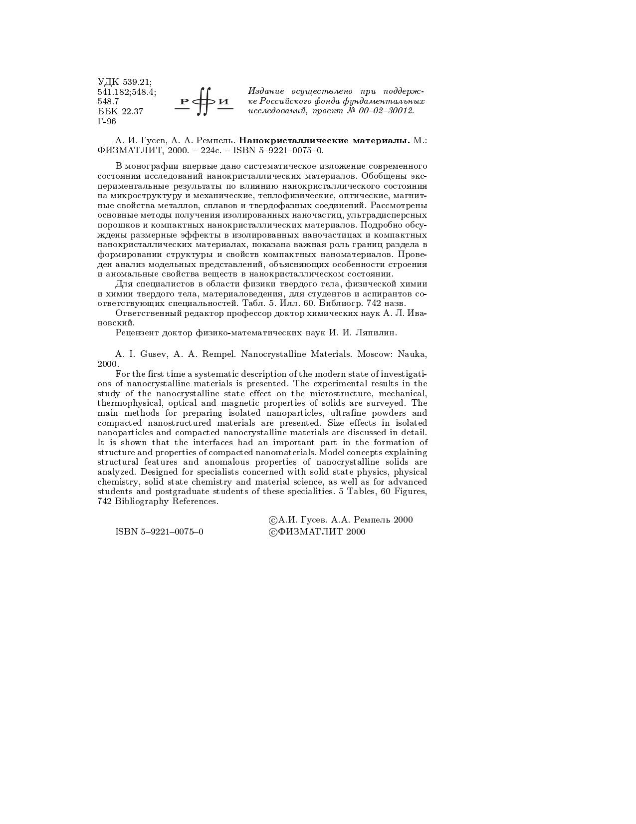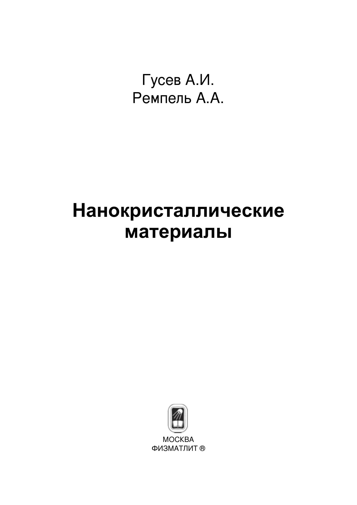 Дано систематическое изложение современного состояния исследований нанокристаллических материалов. Обобщены экспериментальные результаты по влиянию нанокристаллического состояния на микроструктуру и механические, теплофизические, оптические, магнитные свойства металлов, сплавов и твердофазных соединений. Рассмотрены основные методы получения изолированных наночастиц, ультрадисперсных порошков и компактных нанокристаллических материалов.