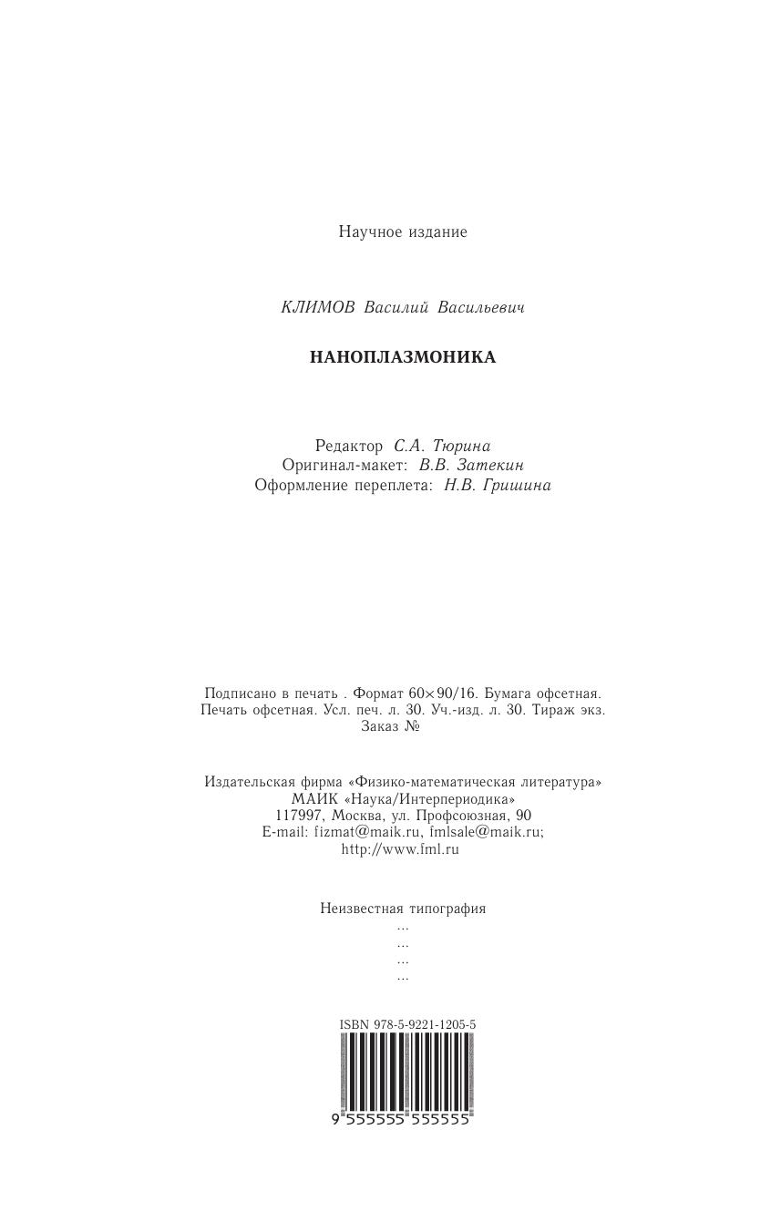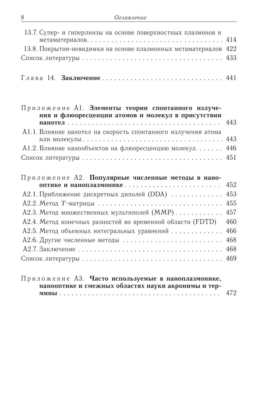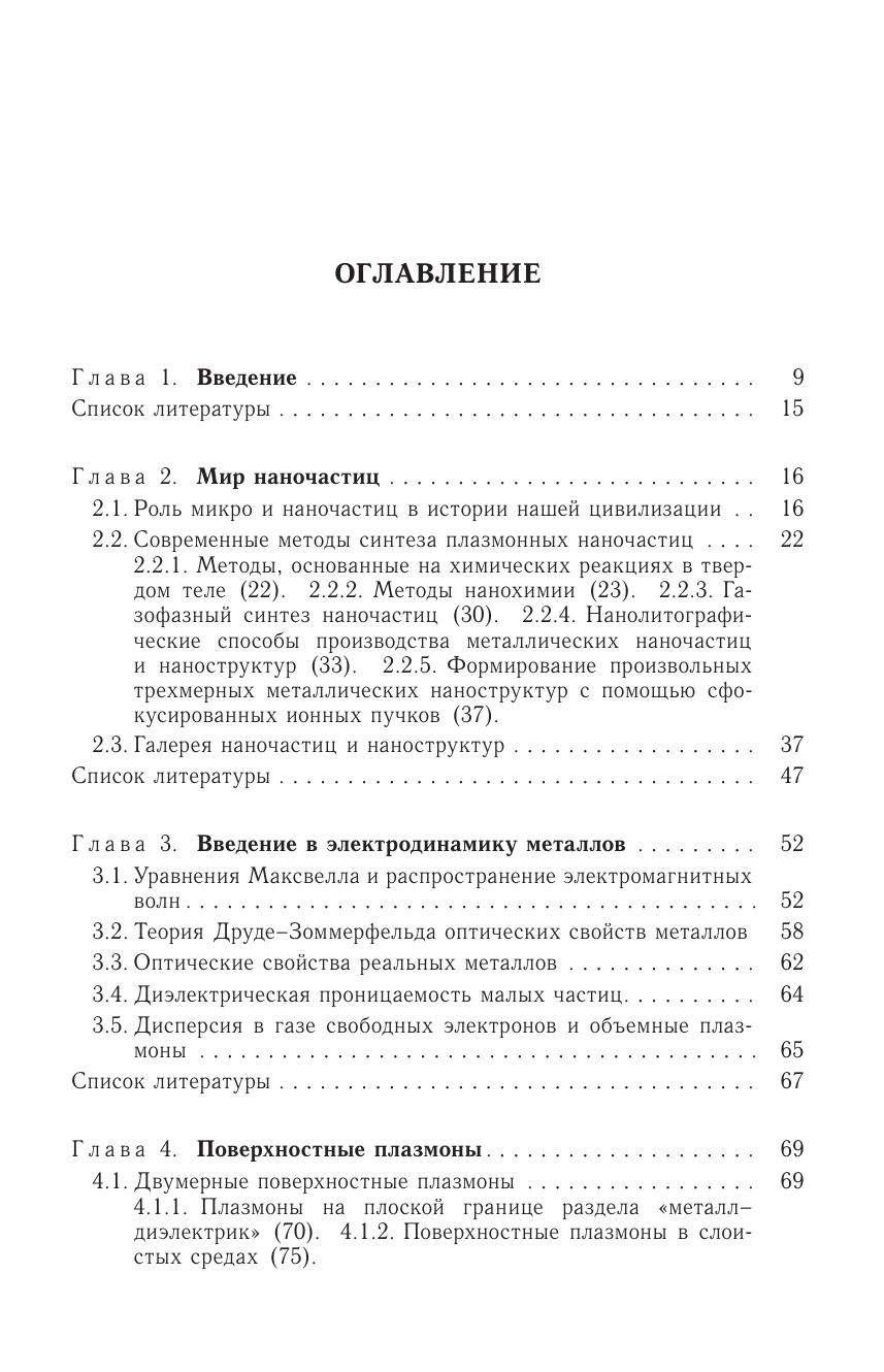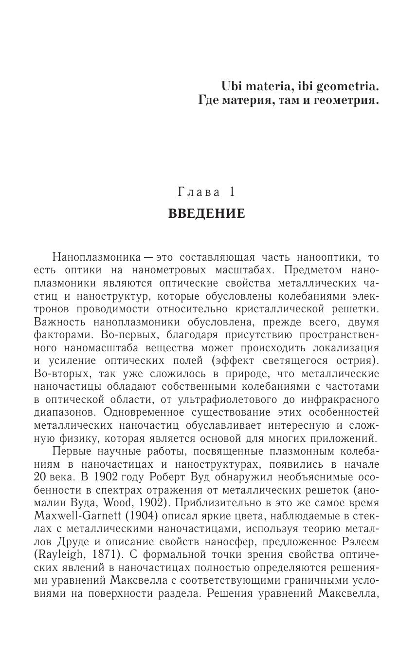 Книга посвящена изложению новейших результатов в новой области нанотехнологий — наноплазмонике. Наноплазмоника является частью нанооптики и нанофотоники и имеет дело с колебаниями электронов проводимости в металлических наночастицах и наноструктурах. Важность и перспективность наноплазмоники заключается в том, что она позволяет совместить нанометровые размеры приборов и сенсоров с оптическими частотами их функционирования. В книге подробно излагаются современные методы описания плазмонных свойств наночастиц и приводятся основные расчетные формулы, позволяющие быстро провести оценки оптических свойств наночастиц самой различной формы. В книге также рассматриваются новейшие приложения наноплазмоники: от медицины до электроники и создания «плащей-невидимок» и «идеальных линз». Книга предназначена читателям, знакомым с электродинамикой в рамках университетского курса общей физики: студентам старшим курсов, аспирантам физико-химических и инженерных специальностей, и всем научным сотрудникам, желающим быстро войти в увлекательный мир нанооптики и наноплазмоники. Многие результаты, приведенные в книге, поучены совсем недавно и могут быть полезны даже опытным специалистом в области нанооптики. Отдельные главы могут быть полезны и более широкому кругу читателей.