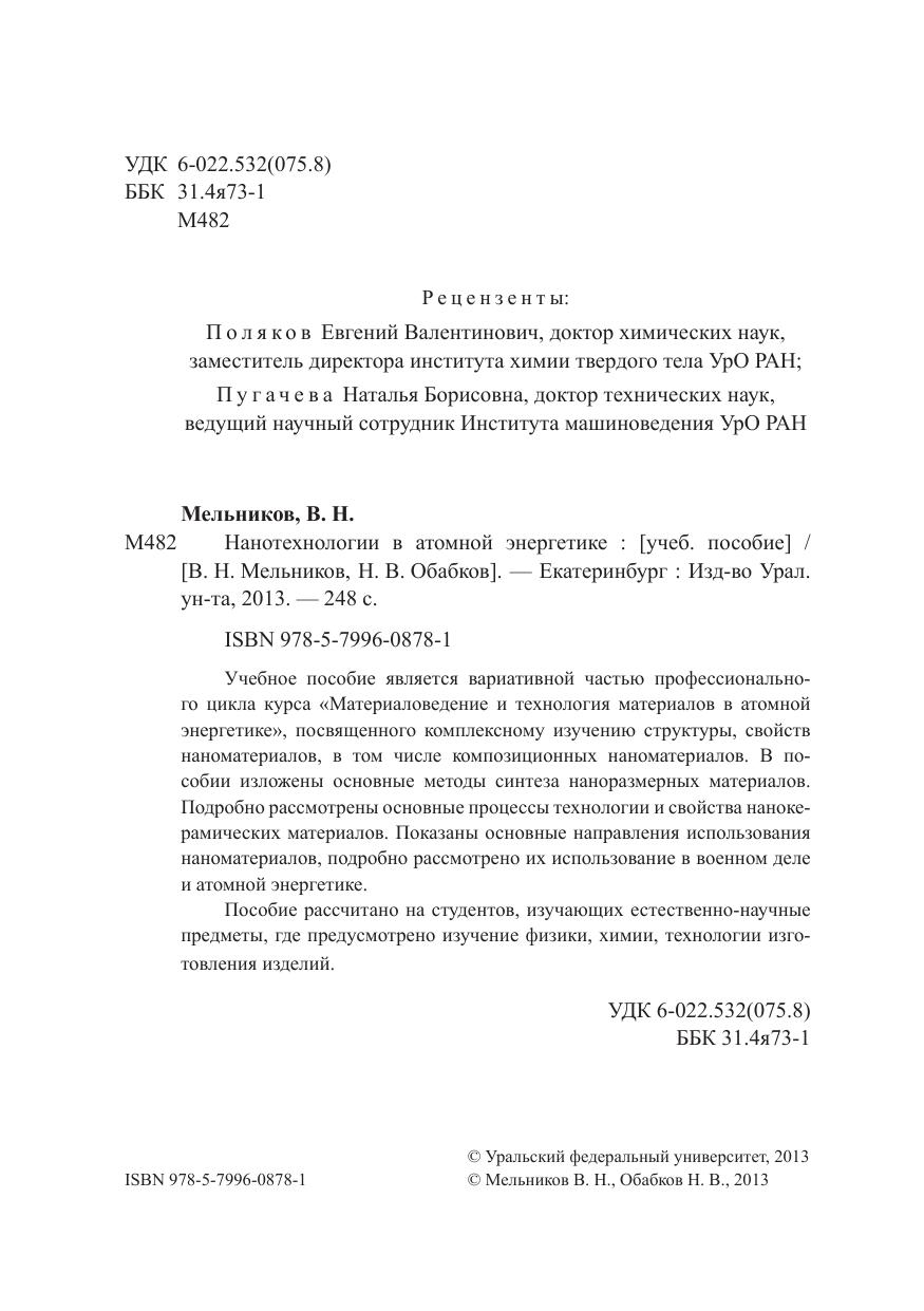 Учебное пособие является вариативной частью профессионального цикла курса «Материаловедение и технология материалов в атомной энергетике», посвященного комплексному изучению структуры, свойств наноматериалов, в том числе композиционных наноматериалов. В пособии изложены основные методы синтеза наноразмерных материалов. Подробно рассмотрены основные процессы технологии и свойства нанокерамических материалов. Показаны основные направления использования наноматериалов, подробно рассмотрено их использование в военном деле и атомной энергетике. Пособие рассчитано на студентов, изучающих естественно-научные предметы, где предусмотрено изучение физики, химии, технологии изготовления изделий.