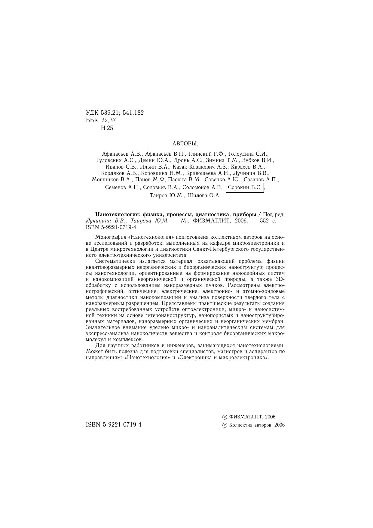 Монография «Нанотехнология» подготовлена коллективом авторов на основе исследований и разработок, выполненныхн а кафедре микроэлектроники и в Центре микротехнологии и диагностики Санкт-Петербургского государственного электротехнического университета. Систематически излагается материал, охватывающий проблемы физики квантоворазмерныхн еорганических и биоорганических наноструктур процессы нанотехнологии, ориентированные на формирование нанослойных систем и нанокомпозиций неорганической и органической природы, а также 3D-обработку с использованием наноразмерныхпучк ов. Рассмотрены электронографический, оптические, электрические, электронно- и атомно-зондовые методы диагностики нанокомпозиций и анализа поверхности твердого тела снаноразмерным разрешением. Представлены практические результаты создания реальныхв остребованных устройств оптоэлектроники, микро- и наносистем-ной техники на основе гетеронаноструктур, нанопористых и наноструктурированныхм атериалов, наноразмерныхо рганическихи неорганических мембран.Значительное внимание уделено микро- и наноаналитическим системам для экспресс-анализа наноколичеств вещества и контроля биоорганическихм акро-молекул и комплексов. Для научныхр аботников и инженеров, занимающихся нанотехнологиями. Может быть полезна для подготовки специалистов, магистров и аспирантов по направлениям: «Нанотехнология» и «Электроника и микроэлектроника»