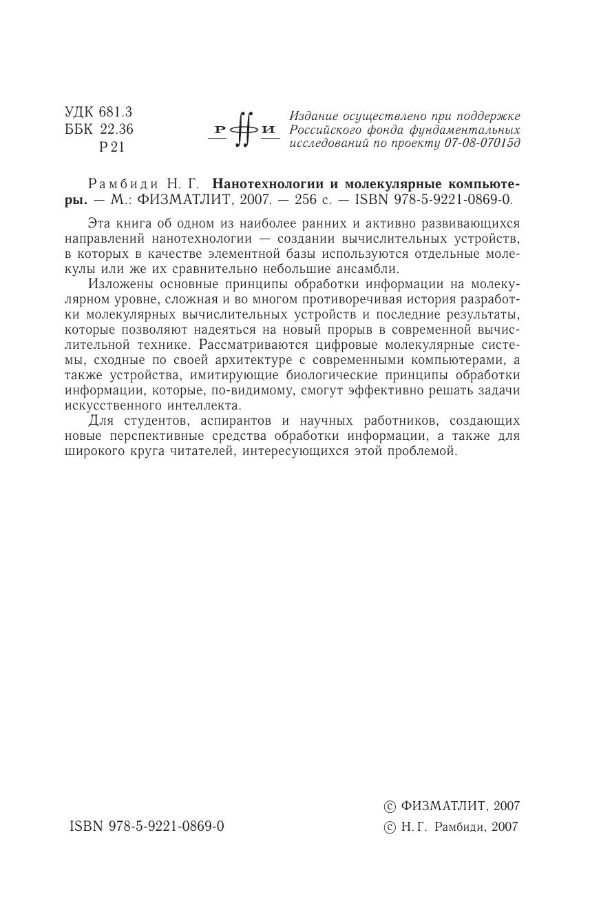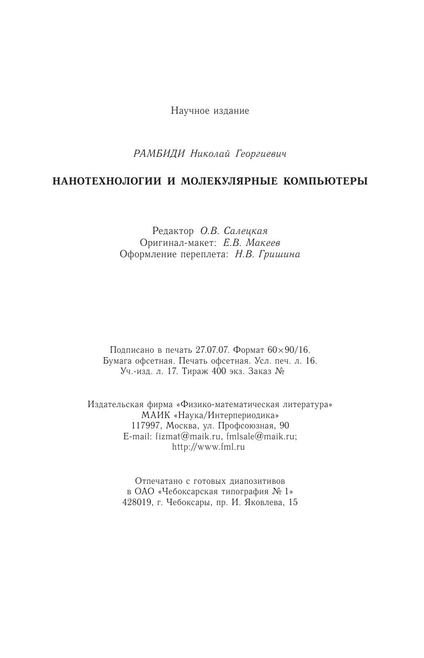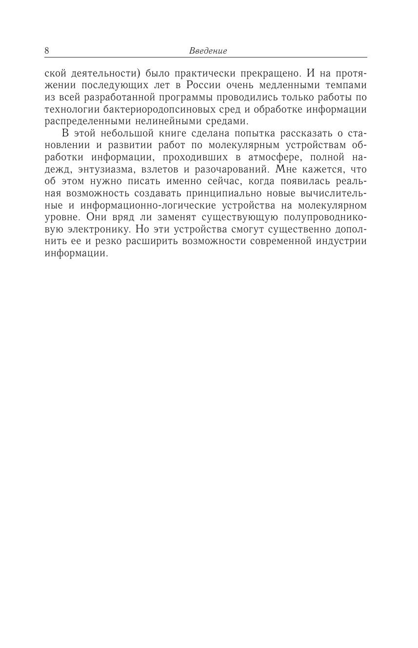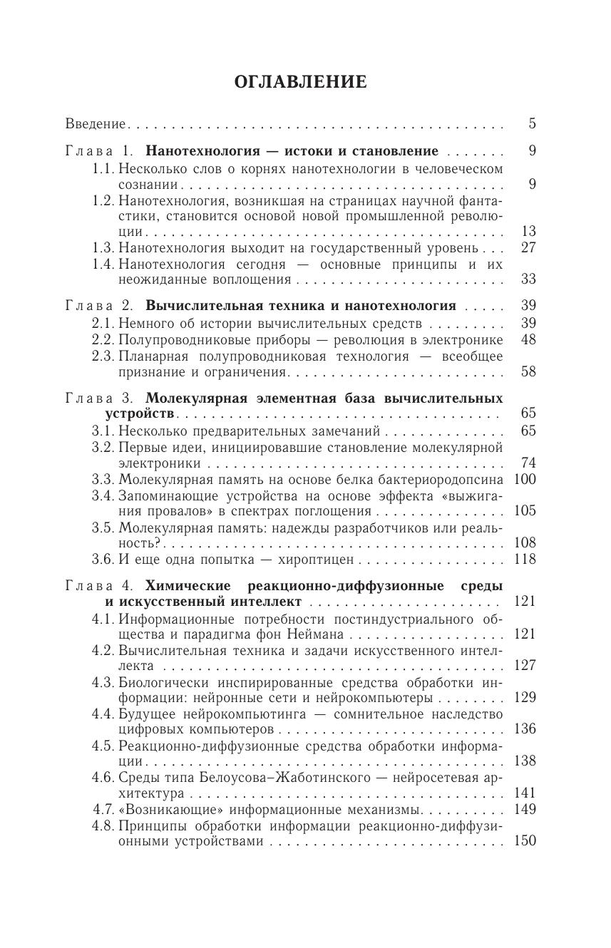 Эта книга об одном из наиболее ранних и активно развивающихся направлений нанотехнологии — создании вычислительных устройств, в которых в качестве элементной базы используются отдельные молекулы или же их сравнительно небольшие ансамбли. Изложены основные принципы обработки информации на молекулярном уровне, сложная и во многом противоречивая история разработки молекулярных вычислительных устройств и последние результаты, которые позволяют надеяться на новый прорыв в современной вычислительной технике. Рассматриваются цифровые молекулярные системы, сходные по своей архитектуре с современными компьютерами, а также устройства, имитирующие биологические принципы обработки информации, которые, по-видимому, смогут эффективно решать задачи искусственного интеллекта. Для студентов, аспирантов и научных работников, создающих новые перспективные средства обработки информации, а также для широкого круга читателей, интересующихся этой проблемой.
