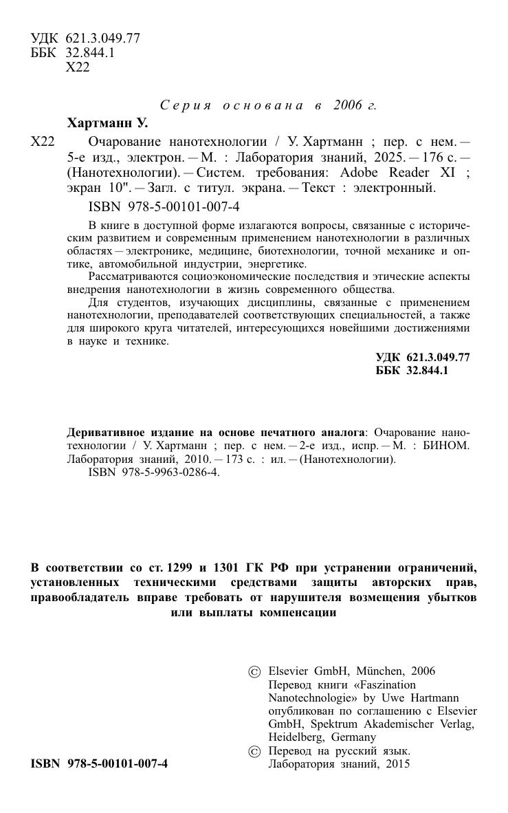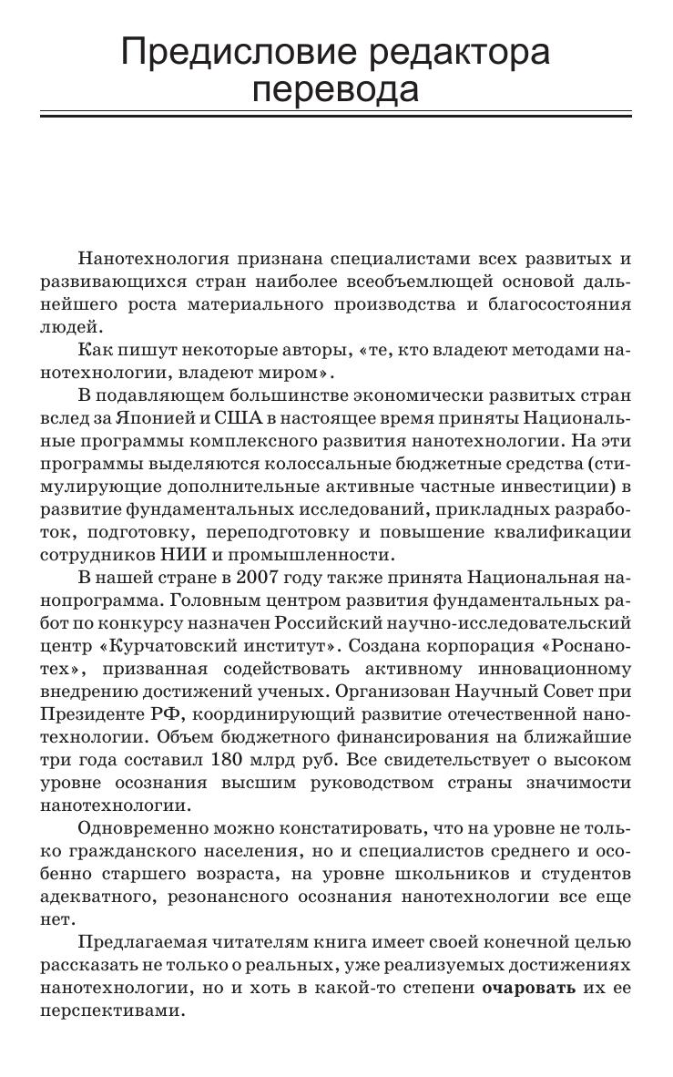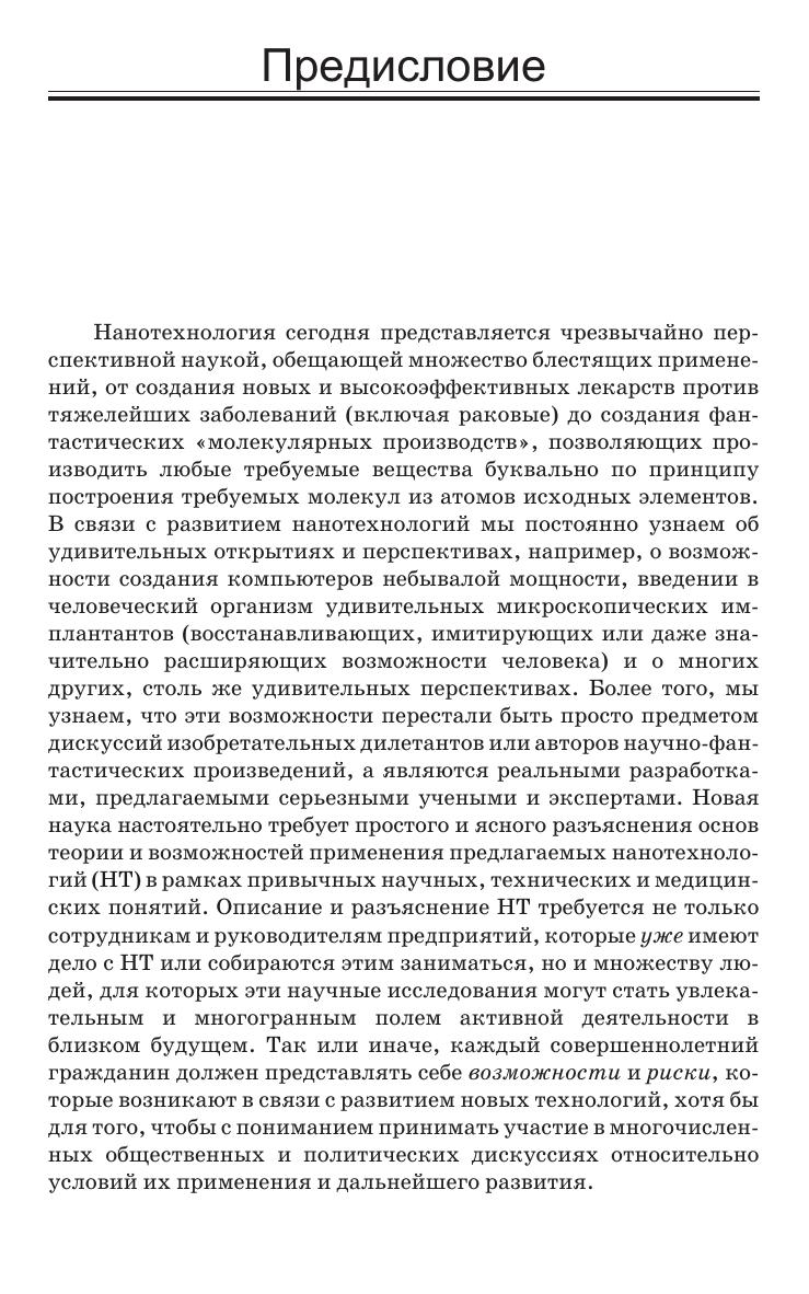 В книге в доступной форме излагаются вопросы, связанные с историческим развитием и современным применением нанотехнологии в различных областях — электронике, медицине, биотехнологии, точной механике и оптике, автомобильной индустрии, энергетике. Рассматриваются социоэкономические последствия и этические аспекты внедрения нанотехнологии в жизнь современного общества. Для студентов, изучающих дисциплины, связанные с применением