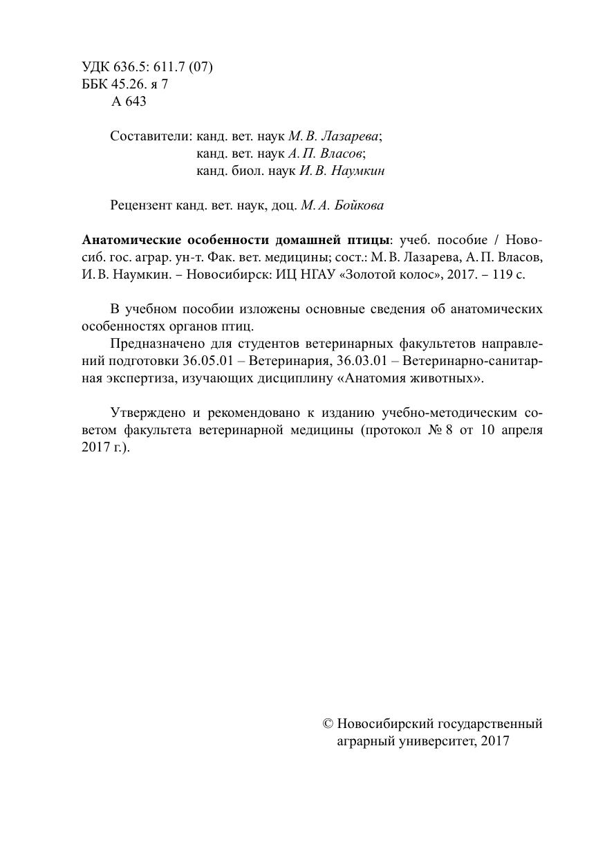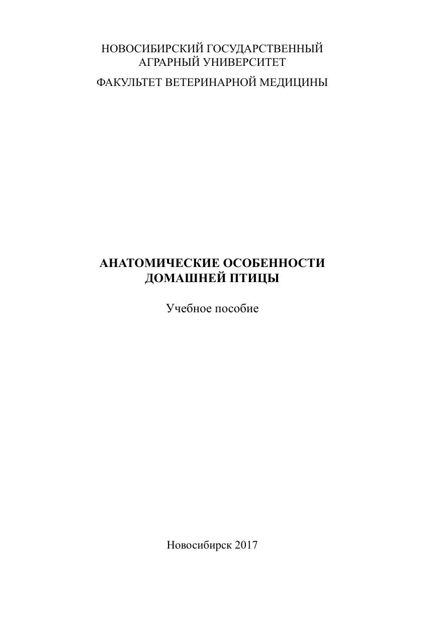В учебном пособии изложены основные сведения об анатомических особенностях органов птиц. Предназначено для студентов ветеринарных факультетов направлений подготовки 36.05.01 – Ветеринария, 36.03.01 – Ветеринарно-санитарная экспертиза, изучающих дисциплину «Анатомия животных». Утверждено и рекомендовано к изданию учебно-методическим со- ветом факультета ветеринарной медицины (протокол № 8 от 10 апреля 2017 г.).