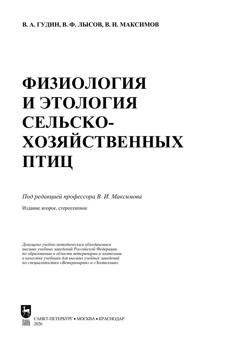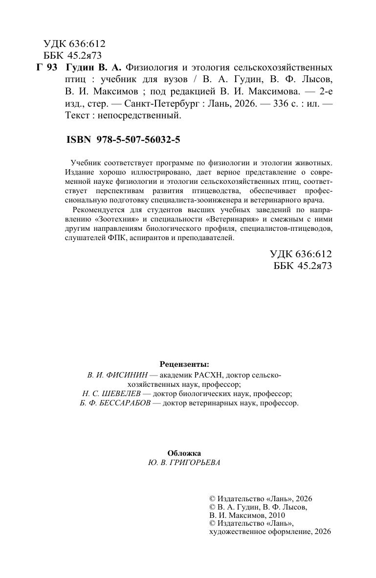 Учебник соответствует программе по физиологии и этологии животных. Издание хорошо иллюстрировано, дает верное представление о современной науке физиологии и этологии сельскохозяйственных птиц, соответствует перспективам развития птицеводства, обеспечивает профессиональную подготовку специалиста - зооинженера и ветеринарного врача. Рекомендуется для студентов высших учебных заведений по направлению «Зоотехния» и специальности «Ветеринария» и смежных с ними других направлений биологического профиля, специалистов-птицеводов, слушателей ФПК, аспирантов и преподавателей.