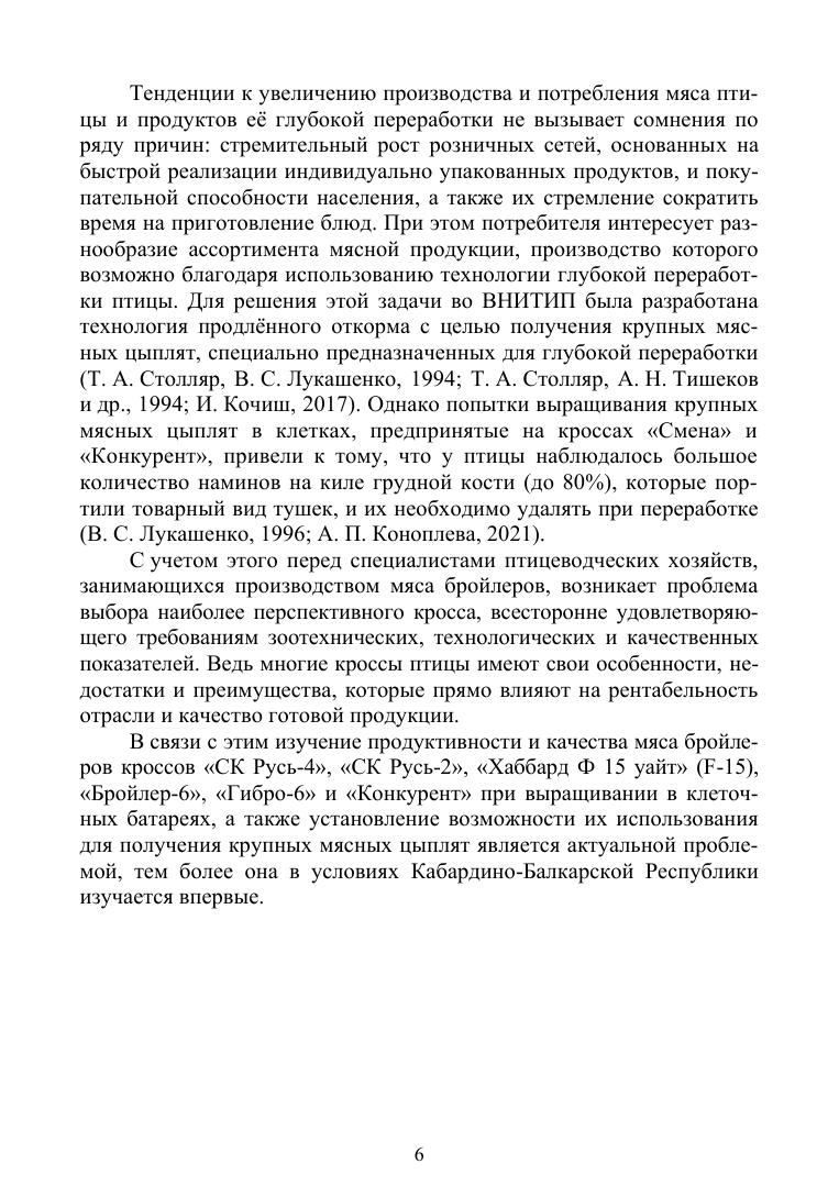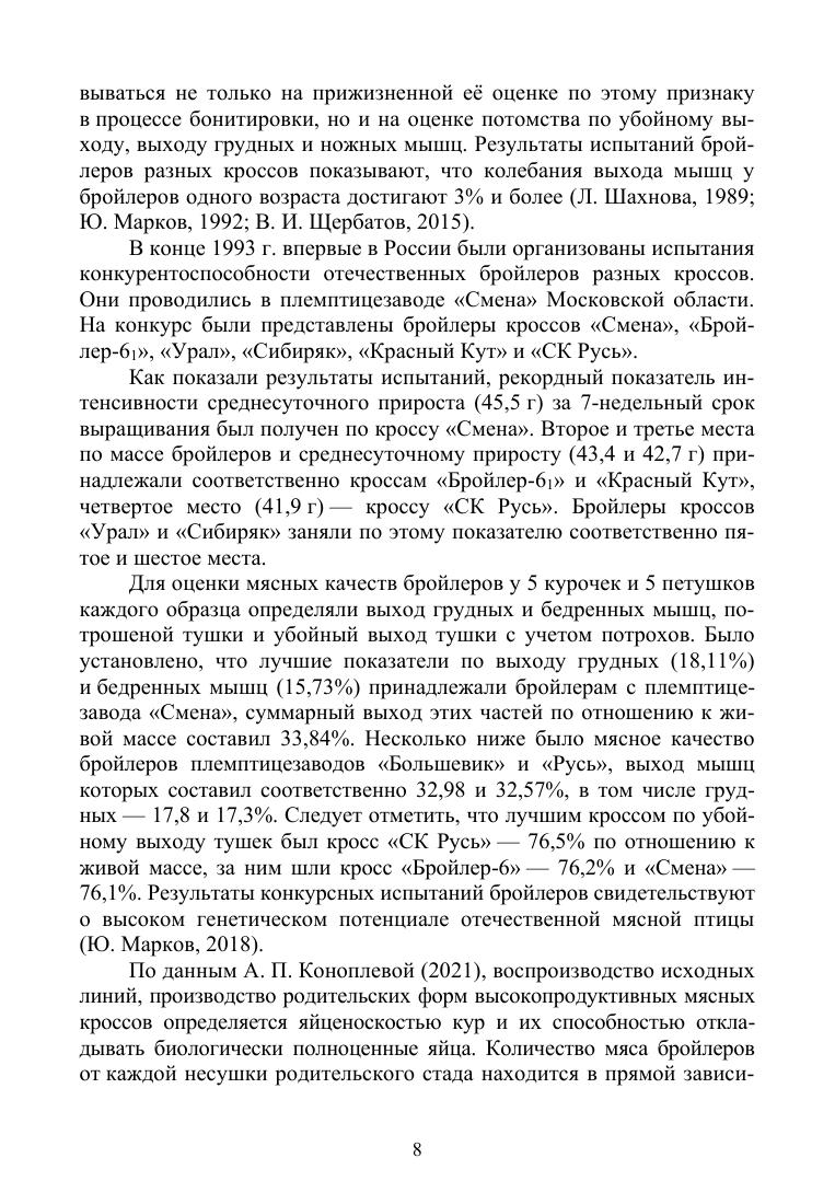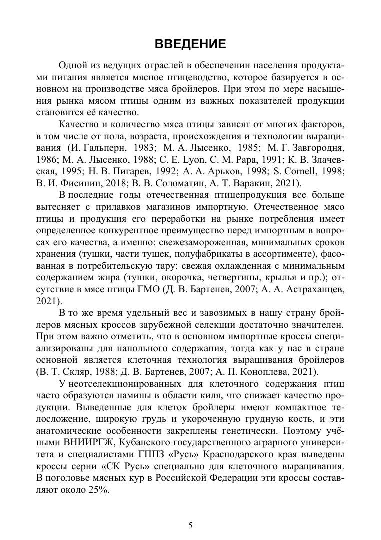 В монографии представлен опыт многолетних исследований по выращиванию и изучению мясных качеств бройлеров отечественной и зарубежной селекции. В сравнительном аспекте у бройлеров изучена динамика живой массы, мясные качества тушек, содержание аминокислот и жирных кислот, физические показатели мяса. В работе приводятся данные по влиянию продленного откорма на качество мяса. Большое внимание уделено содержанию в мясе солей тяжелых металлов, морфологическим показателям крови и уровню естественной резистентности подопытной птицы, инкубационным качествам яиц, яичной продуктивности родительского стада и влиянию полового соотношения в стаде на воспроизводительные качества птицы. Монография адресована научно-педагогическим работникам вузов, аспирантам, студентам по направлению подготовки «Зоотехния», а также специалистам сельскохозяйственных предприятий, крестьянских (фермерских) хозяйств, занимающихся разведением, выращиванием и содержанием кур и бройлеров мясных кроссов.