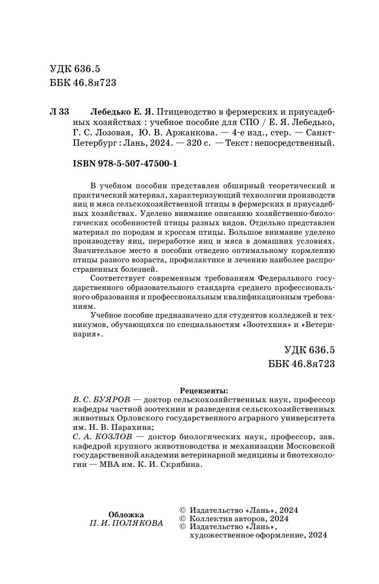 В учебном пособии представлен обширный теоретический и практический материал, характеризующий технологии производств яиц и мяса сельскохозяйственной птицы в фермерских и приусадебных хозяйствах. Уделено внимание описанию хозяйственно-биологических особенностей птицы разных видов. Отдельно представлен материал по породам и кроссам птицы. Большое внимание уделено производству яиц, переработке яиц и мяса в домашних условиях. Значительное место в пособии отведено оптимальному кормлению птицы разного возраста, профилактике и лечению наиболее распространенных болезней. Соответствует современным требованиям Федерального государственного образовательного стандарта среднего профессионального образования и профессиональным квалификационным требованиям. Учебное пособие предназначено для студентов колледжей и техникумов, обучающихся по специальностям «Зоотехния» и «Ветеринария».