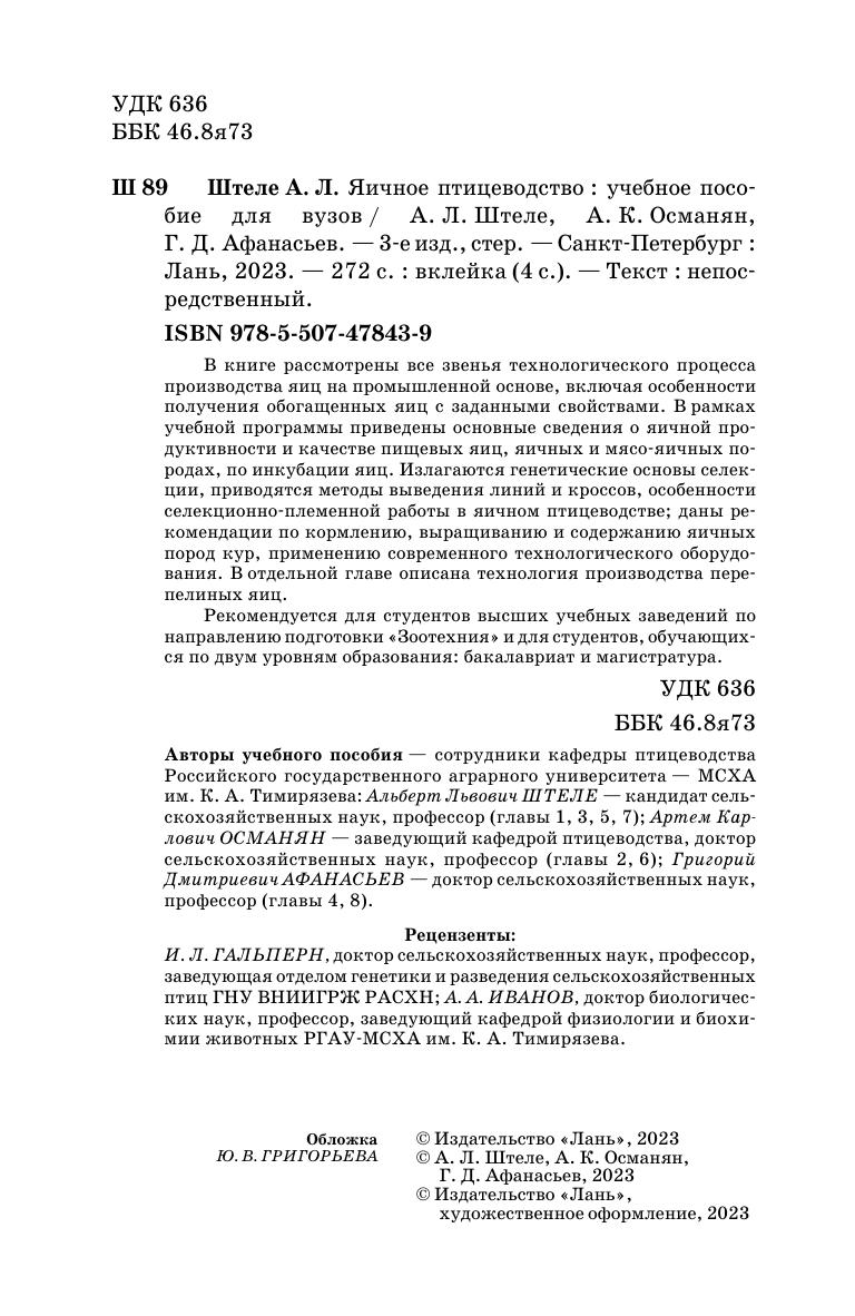 В книге изложены технологические процессы производства яиц на промышленной основе, включая особенности получения яйцепродуктов с заданными свойствами. В рамках учебной программы даются основы яичной продуктивности, качества инкубационных и пищевых яиц, нормативы по выращиванию и содержанию яичных кур и перепелов, рекомендации по селекции и кормлению, применению современного технологического оборудования для яичного птицеводства.Для студентов высших учебных заведений по направлению подготовки «Зоотехния» (уровень образования-бакалавриат и магистратура)