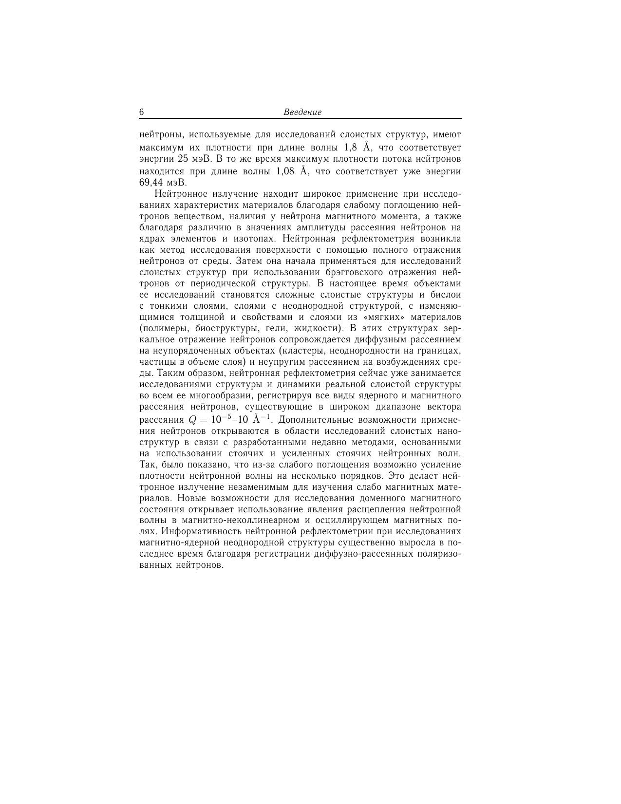 В книге на материале экспериментальных данных описан метод исследований слоистых наноструктур, основанный на использовании зеркального отражения, пропускания, преломления и рассеяния поляризованных нейтронов. На конкретных примерах изложены элементы теории прохождения нейтронов через слоистую структуру с учетом их диффузного рассеяния на шероховатостях границ раздела. Подробно рассмотрены режимы нейтронного волнового поля в слоистой структуре, позволяющие проводить высокочувствительные измерения ядерной и магнитной структур. Описана практически вся экспериментальная техника, используемая в измерениях с поляризованными нейтронами при скользящих углах падения нейтронов. Большое внимание уделено дальнейшему развитию метода рефлектометрии с поляризованными нейтронами. Книга будет полезной научным работникам, желающим применить данный метод в исследованиях нанообъектов, а также студентам физических специальностей вузов.