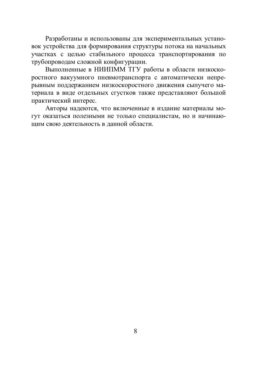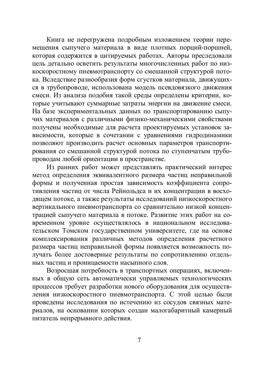 В монографии представлены основные результаты работ в области теории и практики низкоскоростного пневмотранспорта сыпучих материалов, которые осуществлены коллективами кафедры аэромеханики и лаборатории НИИ прикладной математики и механики Томского государственного университета. Теоретические и экспериментальные исследования этого вида транспортирования при поршневой и смешанной структурах потока сыпучих материалов с различными физико-механическими свойствами по горизонтальным и вертикальным трубам различного размера и дальности транспортирования позволили его осуществить на предприятиях химической и атомной промышленности. Стиль изложения рассматриваемых вопросов позволяет их использовать при выборе вида пневмотранспорта и проектировании соответствующих установок, а также при подготовке специалистов данного профиля.