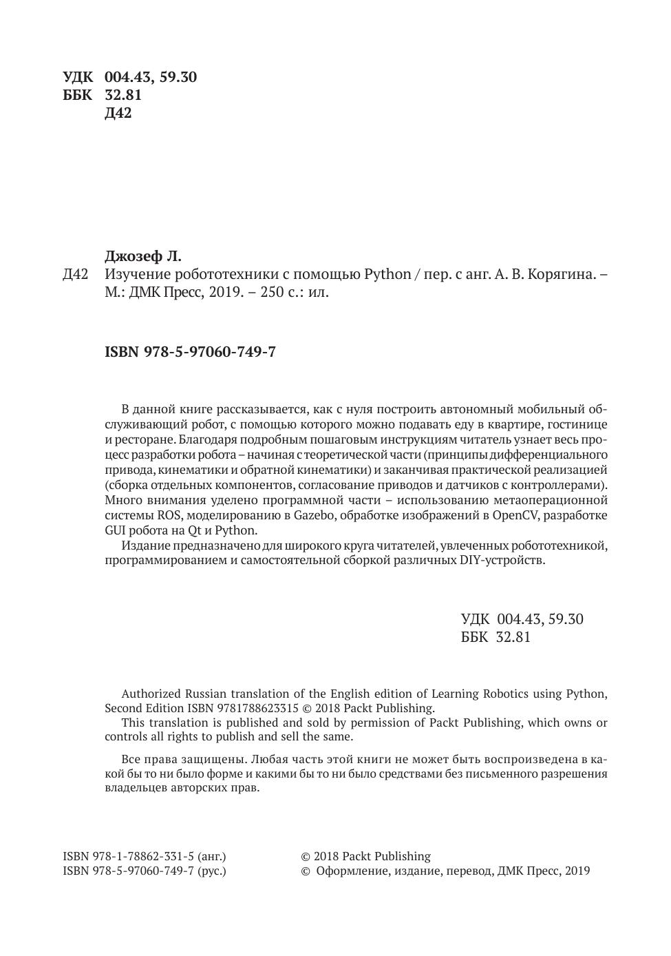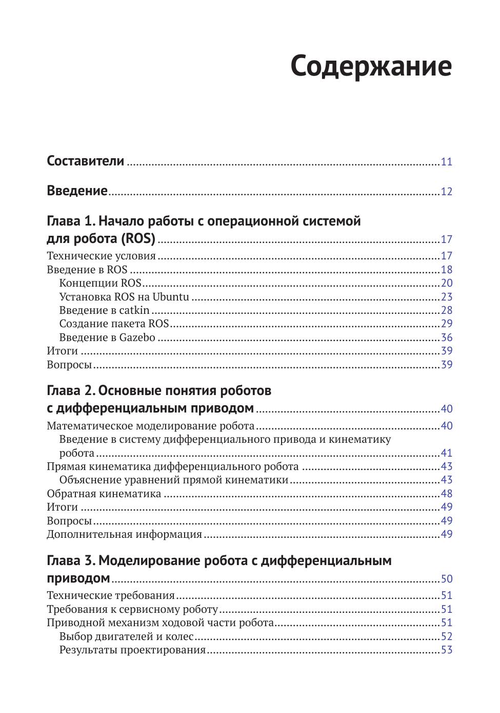 В данной книге рассказывается, как с нуля построить автономный мобильный обслуживающий робот, с помощью которого можно подавать еду в квартире, гостинице и ресторане. Благодаря подробным пошаговым инструкциям читатель узнает весь процесс разработки робота – начиная с теоретической части (принципы дифференциального привода, кинематики и обратной кинематики) и заканчивая практической реализацией (сборка отдельных компонентов, согласование приводов и датчиков с контроллерами). Много внимания уделено программной части – использованию метаоперационной системы ROS, моделированию в Gazebo, обработке изображений в OpenCV, разработке GUI робота на Qt и Python. Издание предназначено для широкого круга читателей, увлеченных робототехникой, программированием и самостоятельной сборкой различных DIY-устройств.