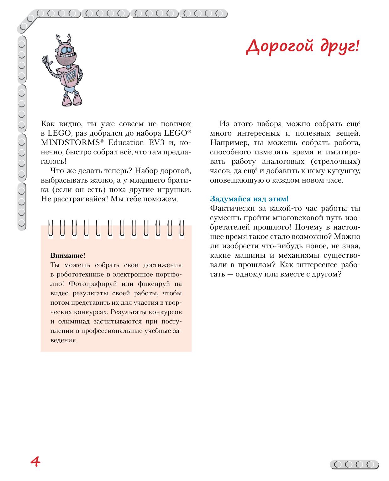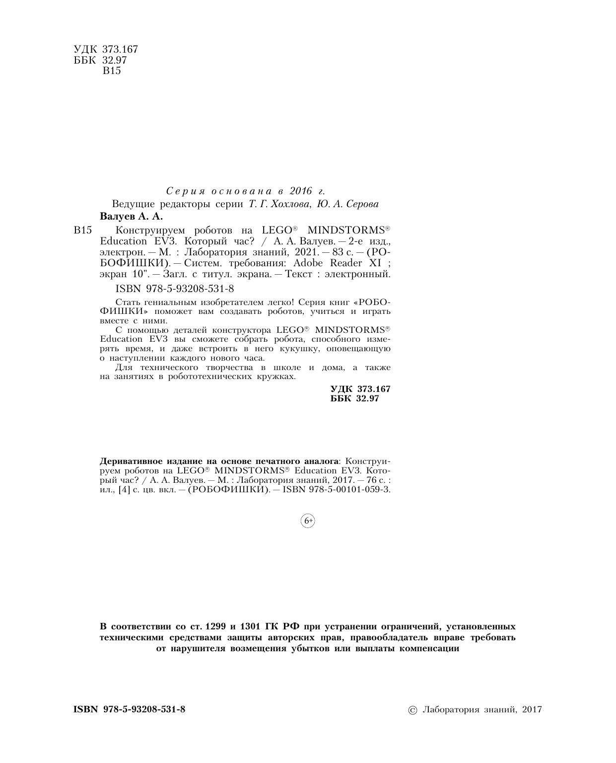 Стать гениальным изобретателем легко! Серия книг «РОБОФИШКИ» поможет вам создавать роботов, учиться и играть вместе с ними. С помощью деталей конструктора LEGO® MINDSTORMS® Education EV3 вы сможете собрать робота, способного измерять время, и даже встроить в него кукушку, оповещающую о наступлении каждого нового часа. Для технического творчества в школе и дома, а также на занятиях в робототехнических кружках.