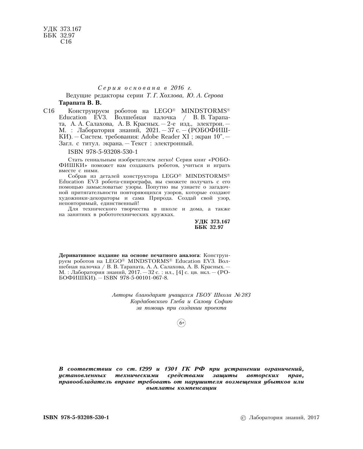 Стать гениальным изобретателем легко! Серия книг «РОБОФИШКИ» поможет вам создавать роботов, учиться и играть вместе с ними. Собрав из деталей конструктора LEGO® MINDSTORMS® Education EV3 робота-спирографа, вы сможете получать с его помощью замысловатые узоры. Попутно вы узнаете о загадочной притягательности повторяющихся узоров, которые создают художники-декораторы и сама Природа. Создай свой узор, неповторимый, единственный! Для технического творчества в школе и дома, а также на занятиях в робототехнических кружках.