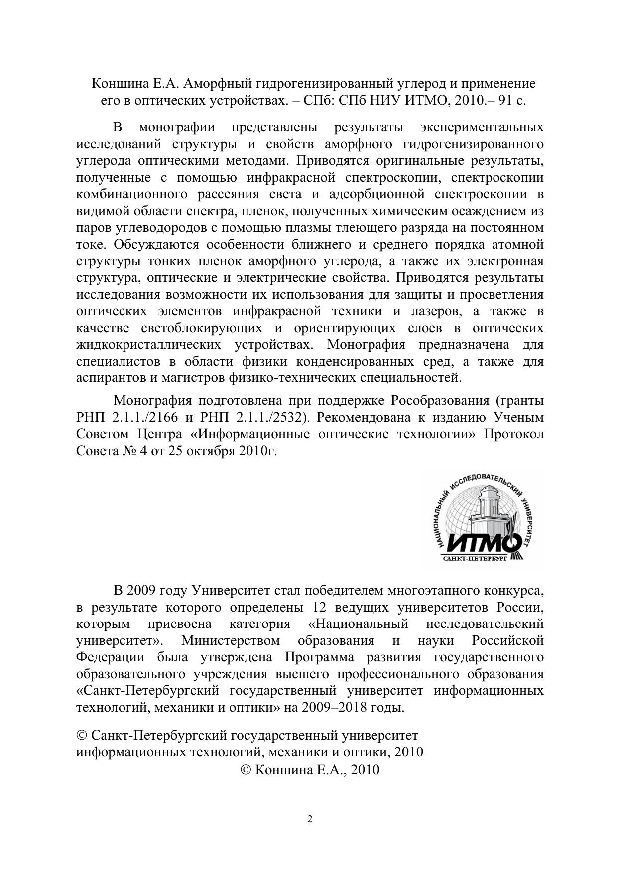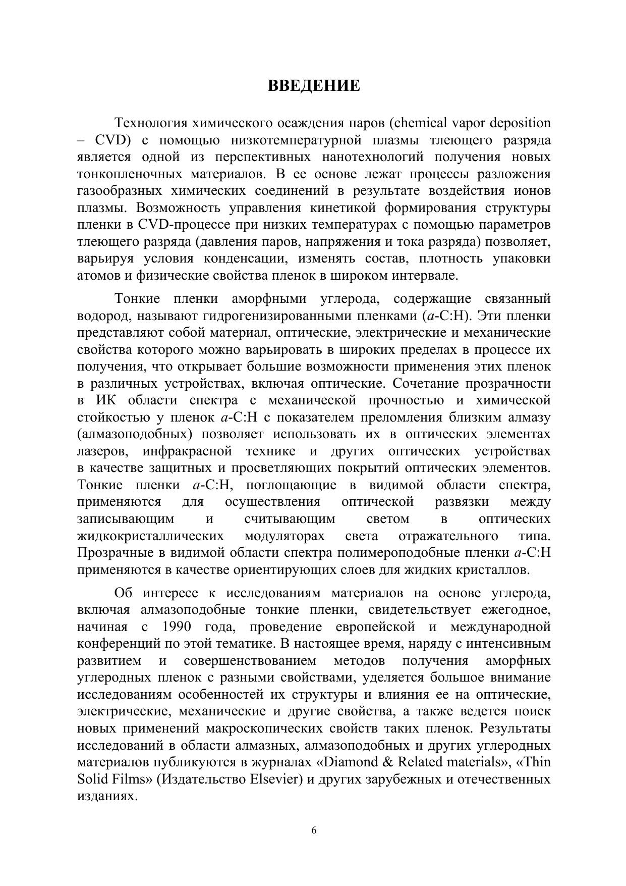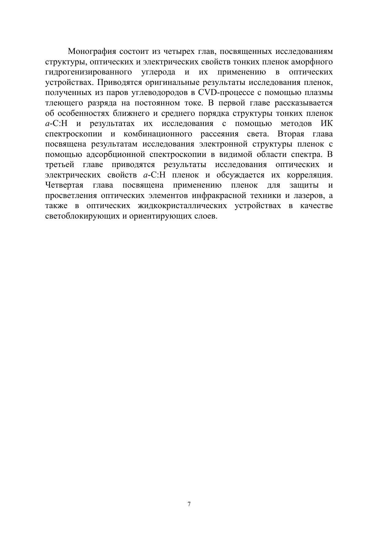 В монографии представлены результаты экспериментальных исследований структуры и свойств аморфного гидрогенизированного углерода оптическими методами. Приводятся оригинальные результаты, полученные с помощью инфракрасной спектроскопии, спектроскопии комбинационного рассеяния света и адсорбционной спектроскопии в видимой области спектра, пленок, полученных химическим осаждением из паров углеводородов с помощью плазмы тлеющего разряда на постоянномтоке. Обсуждаются особенности ближнего и среднего порядка атомной структуры тонких пленок аморфного углерода, а также их электронная структура, оптические и электрические свойства. Приводятся результаты исследования возможности их использования для защиты и просветления оптических элементов инфракрасной техники и лазеров, а также в качестве светоблокирующих и ориентирующих слоев в оптических жидкокристаллических устройствах. Монография предназначена для специалистов в области физики конденсированных сред, а также для аспирантов и магистров физико-технических специальностей.