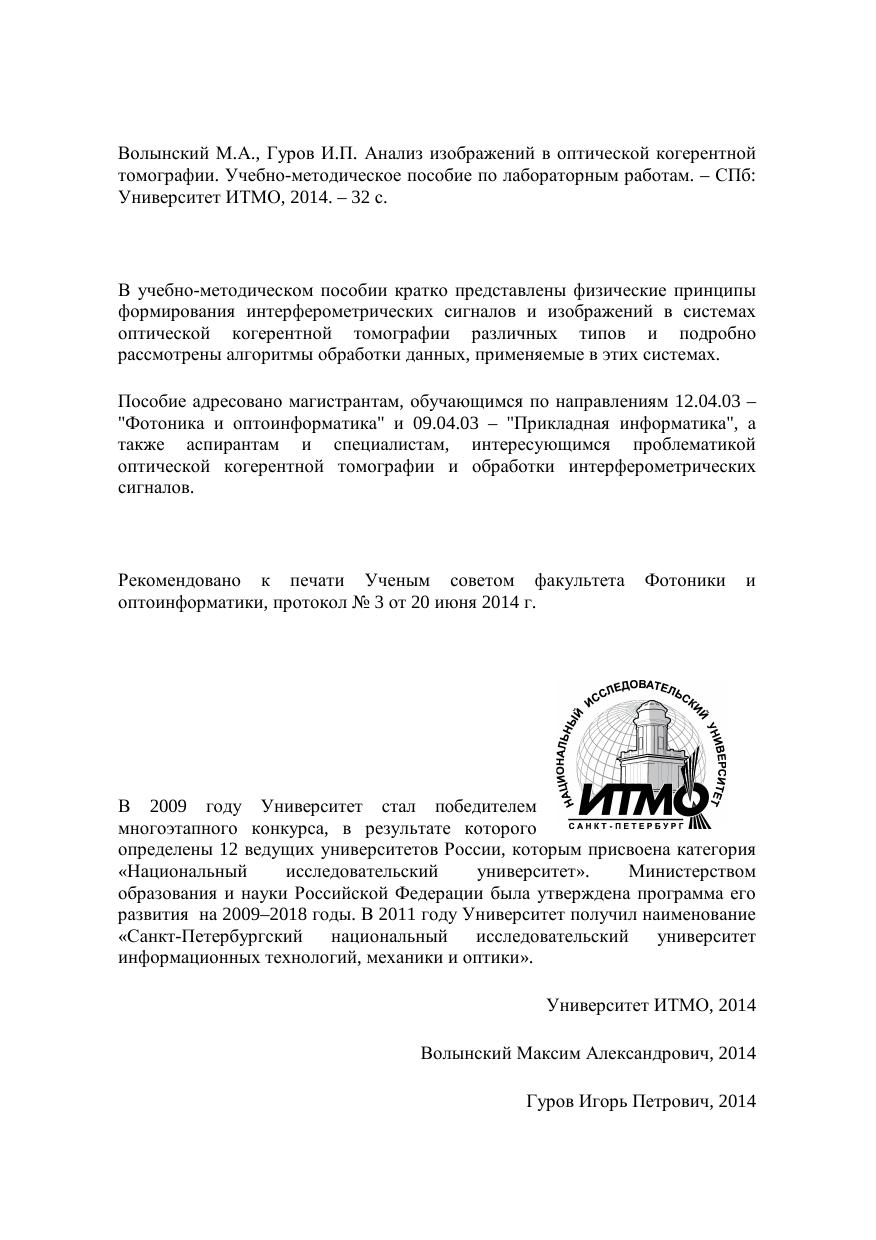 В учебно-методическом пособии кратко представлены физические принципы формирования интерферометрических сигналов и изображений в системах оптической когерентной томографии различных типов и подробно рассмотрены алгоритмы обработки данных, применяемые в этих системах. Пособие адресовано магистрантам, обучающимся по направлениям 12.04.03 – "Фотоника и оптоинформатика" и 09.04.03 – "Прикладная информатика", а также аспирантам и специалистам, интересующимся проблематикой оптической когерентной томографии и обработки интерферометрических сигналов.