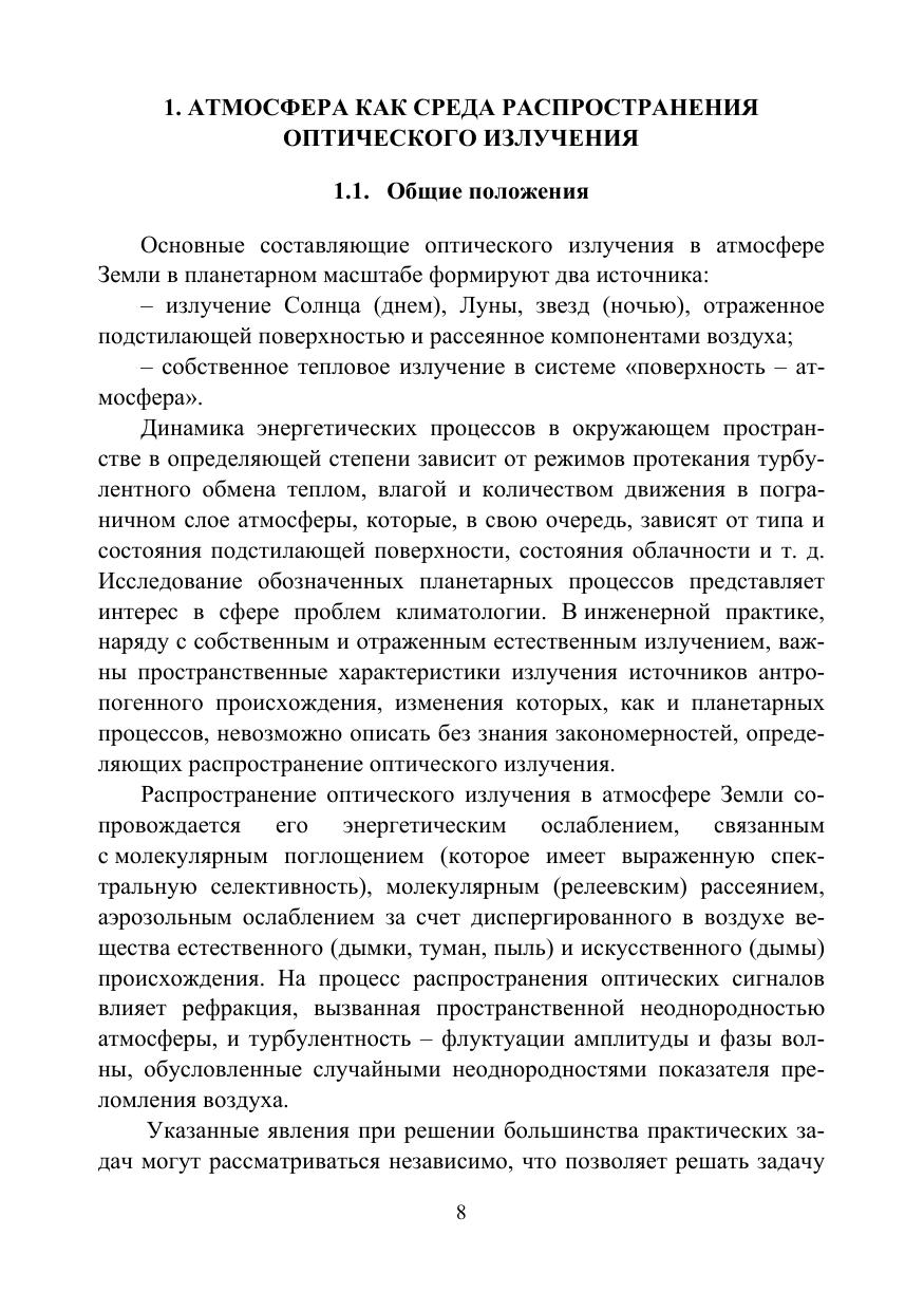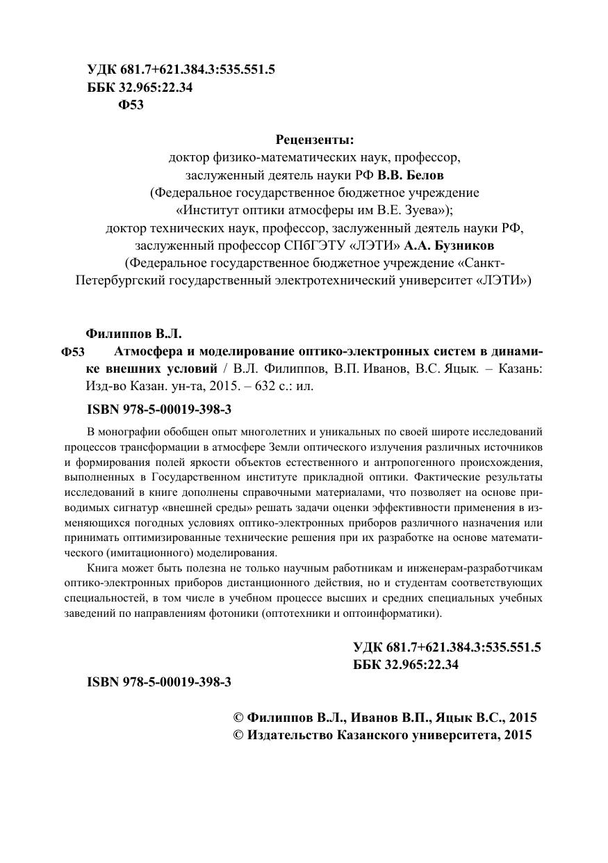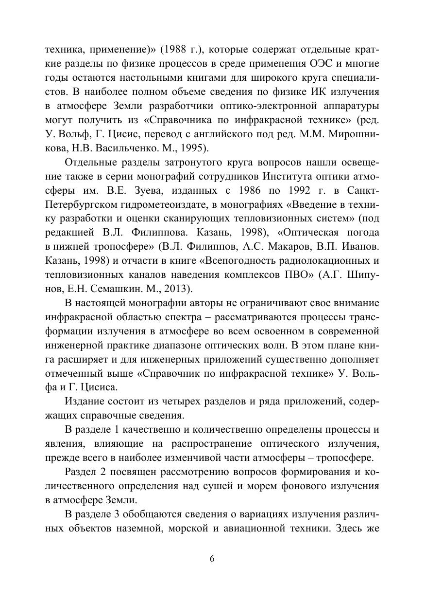 В монографии обобщен опыт многолетних и уникальных по своей широте исследований процессов трансформации в атмосфере Земли оптического излучения различных источников и формирования полей яркости объектов естественного и антропогенного происхождения, выполненных в Государственном институте прикладной оптики. Фактические результаты исследований в книге дополнены справочными материалами, что позволяет на основе приводимых сигнатур «внешней среды» решать задачи оценки эффективности применения в изменяющихся погодных условиях оптико-электронных приборов различного назначения или принимать оптимизированные технические решения при их разработке на основе математического (имитационного) моделирования. Книга может быть полезна не только научным работникам и инженерам-разработчикам оптико-электронных приборов дистанционного действия, но и студентам соответствующих специальностей, в том числе в учебном процессе высших и средних специальных учебных заведений по направлениям фотоники (оптотехники и оптоинформатики).