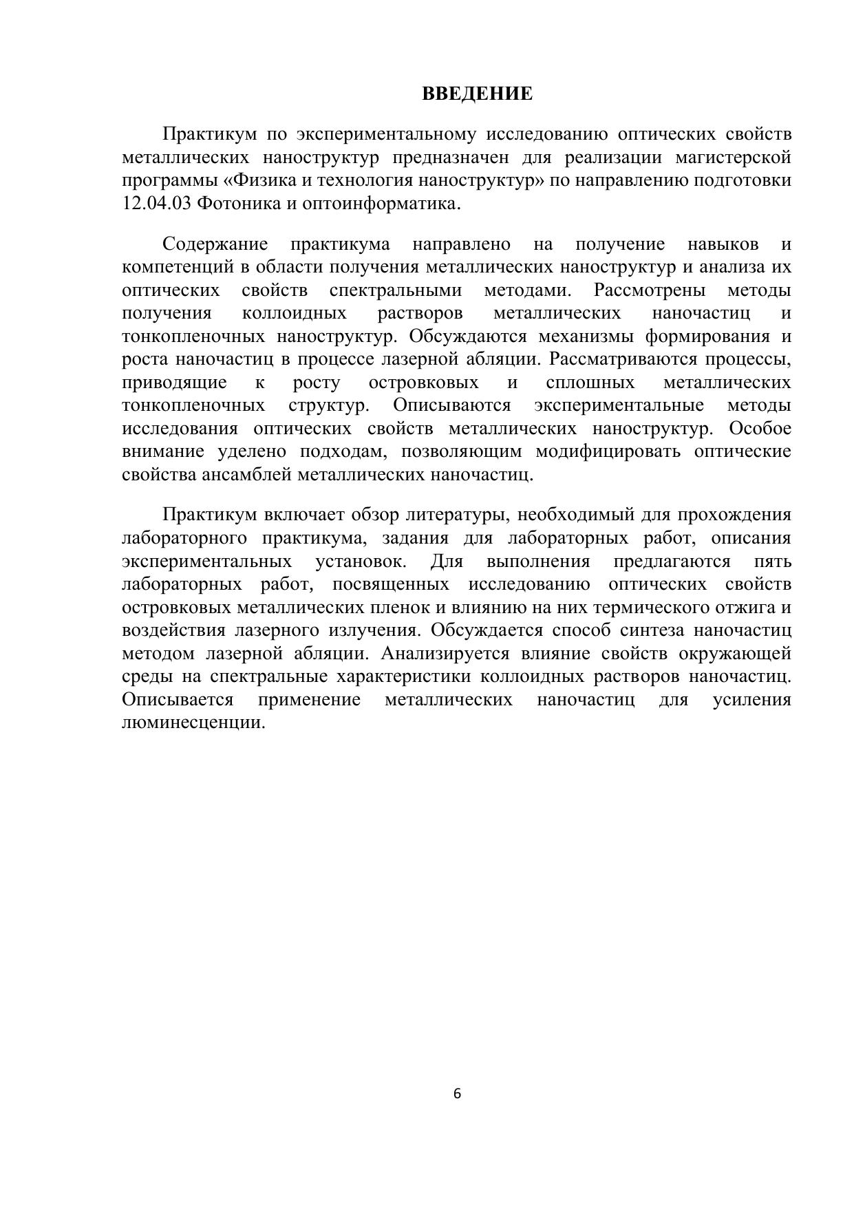 Содержание практикума направлено на получение навыков и компетенций в области получения металлических наноструктур и анализа их оптических свойств спектральными методами. Рассмотрены методы получения коллоидных растворов металлических наночастиц и тонкопленочных наноструктур. Обсуждаются механизмы формирования и роста наночастиц в процессе лазерной абляции. Рассматриваются процессы, приводящие к росту островковых и сплошных металлических тонкопленочных структур. Описываются экспериментальные методы исследования оптических свойств металлических наноструктур. Особое внимание уделено подходам, позволяющим модифицировать оптические свойства ансамблей металлических наночастиц
