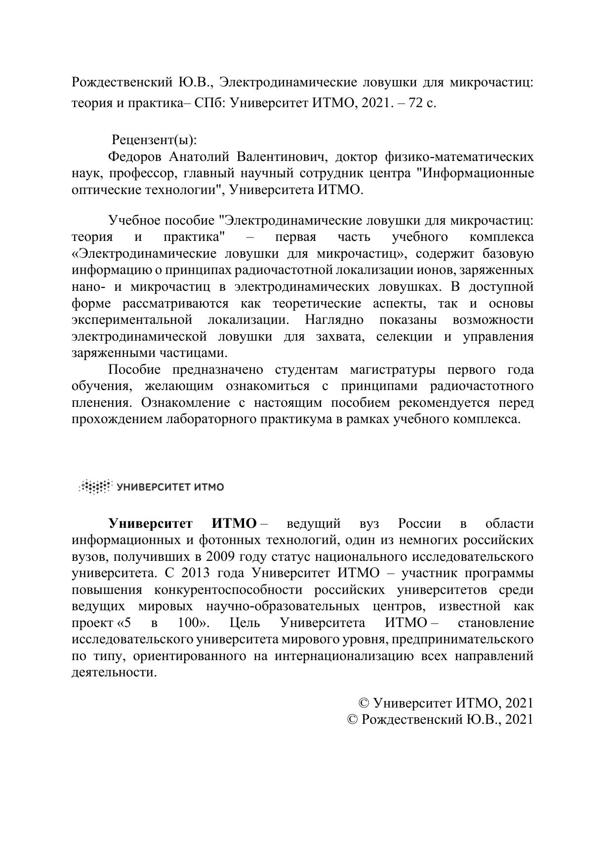 Учебное пособие "Электродинамические ловушки для микрочастиц: теория и практика" – первая часть учебного комплекса «Электродинамические ловушки для микрочастиц», содержит базовую информацию о принципах радиочастотной локализации ионов, заряженных нано- и микрочастиц в электродинамических ловушках. В доступной форме рассматриваются как теоретические аспекты, так и основы экспериментальной локализации. Наглядно показаны возможности электродинамической ловушки для захвата, селекции и управления заряженными частицами.