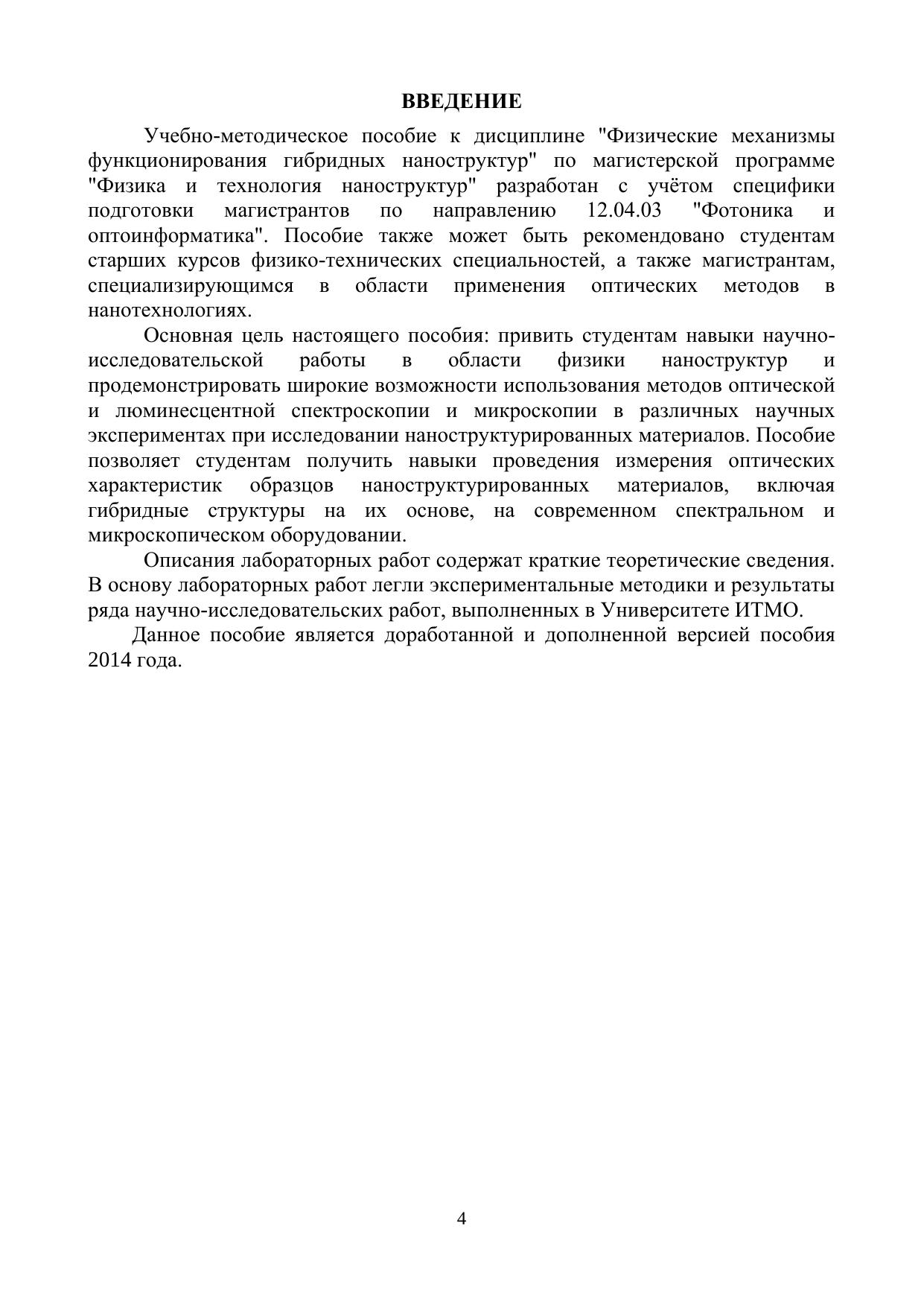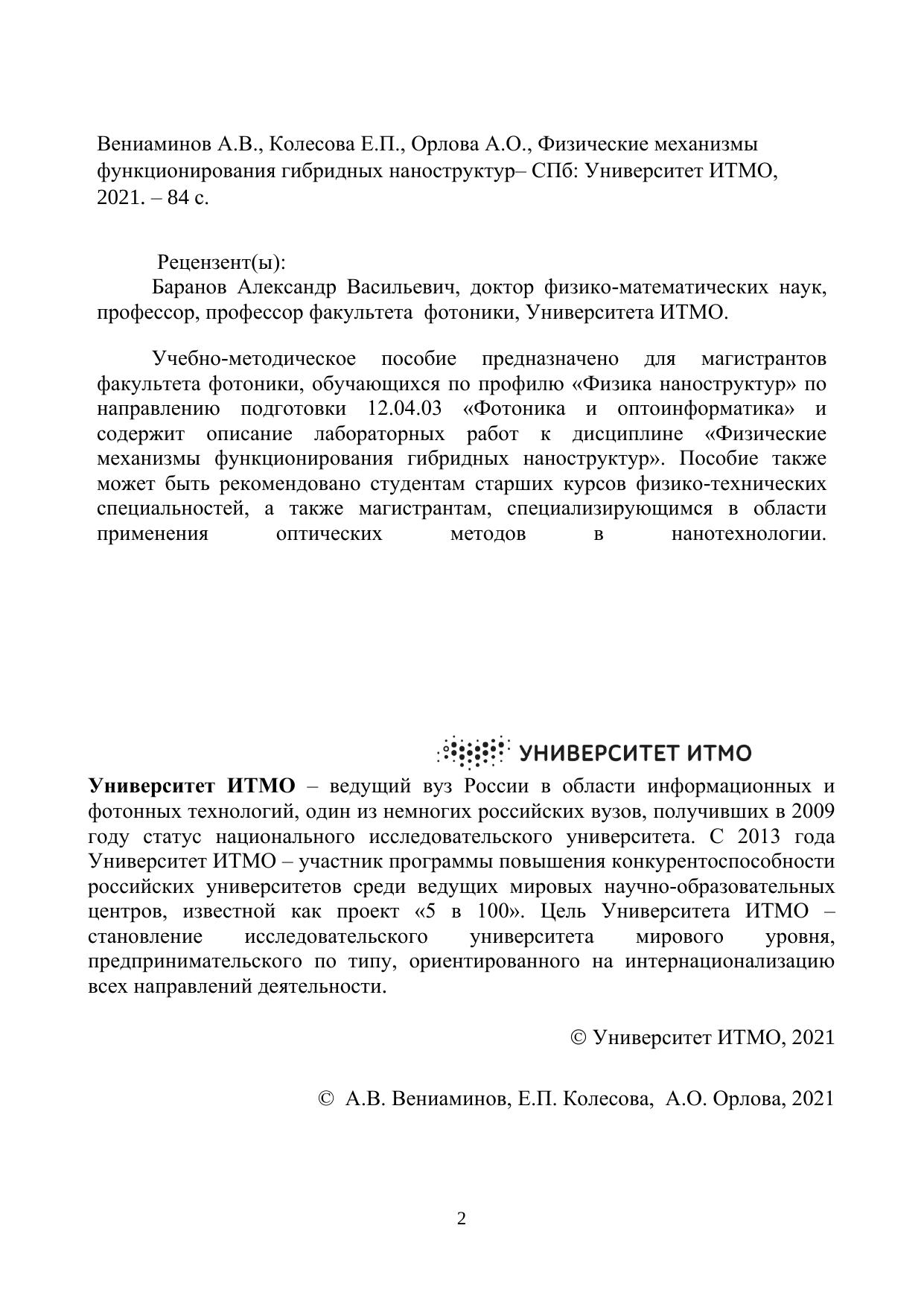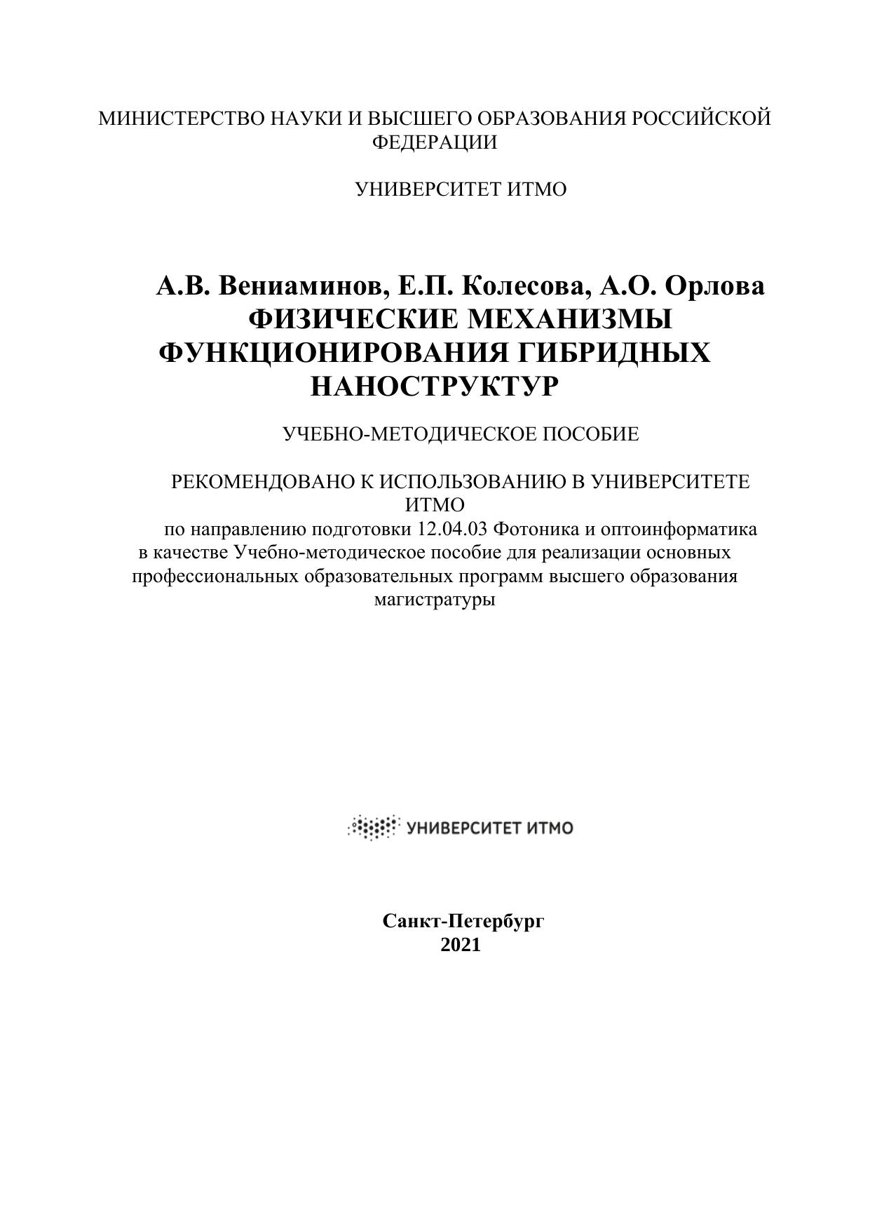 Учебно-методическое пособие предназначено для магистрантов факультета фотоники, обучающихся по профилю «Физика наноструктур» по направлению подготовки 12.04.03 «Фотоника и оптоинформатика» и содержит описание лабораторных работ к дисциплине «Физические механизмы функционирования гибридных наноструктур». Пособие также может быть рекомендовано студентам старших курсов физико-технических специальностей, а также магистрантам, специализирующимся в области применения оптических методов в нанотехнологии.