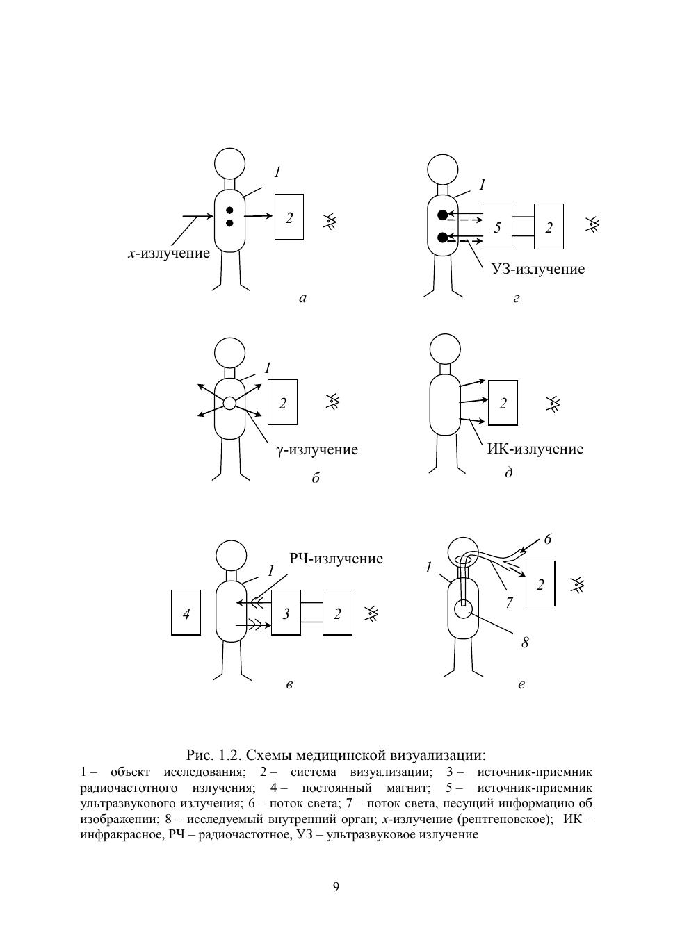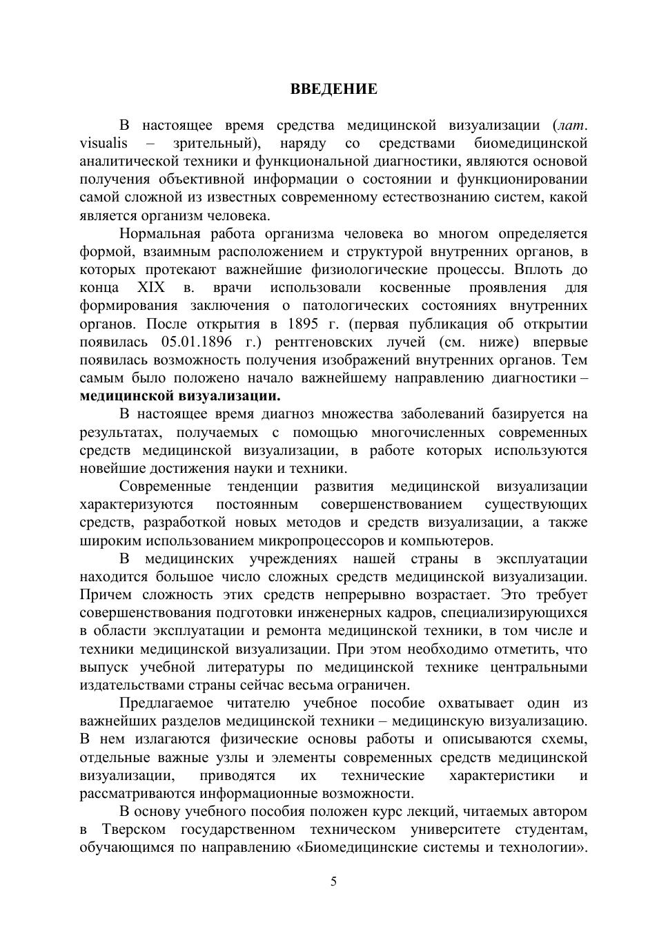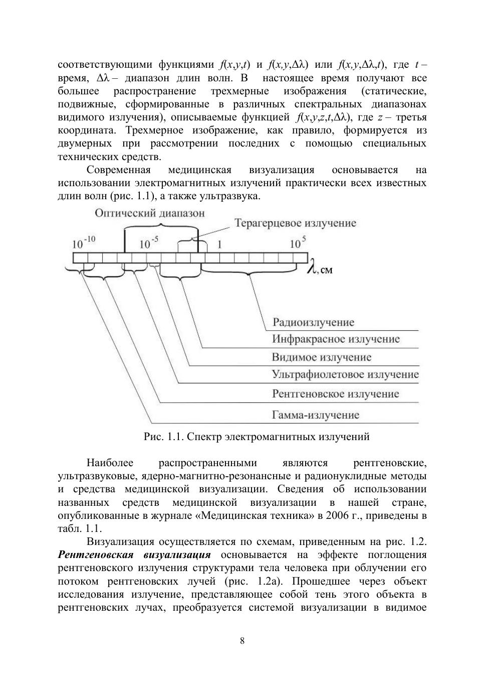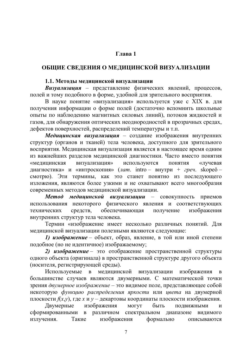 Приведены классификация и основные характеристики изображений, получаемых при медицинской визуализации. Изложены физические основы рентгеновских, радионуклидых, магнитно-резонансных, ультразвуковых, тепловых и других методов получения изображений внутренних структур тела человека. Описаны схемы современных рентгеновских аппаратов, компьютерных рентгеновских, радионуклидных и магнитно-резонансных томографов, а также ультразвуковых сканеров, тепловизоров и эндоскопов.
