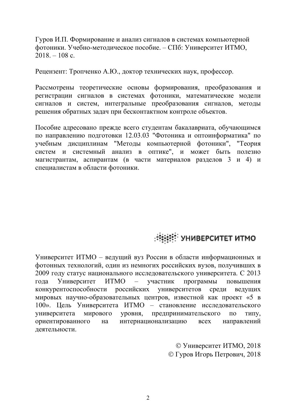 систем и системный анализ в оптике", и может быть полезно магистрантам, аспирантам (в части материалов разделов 3 и 4) и специалистам в области фотоники