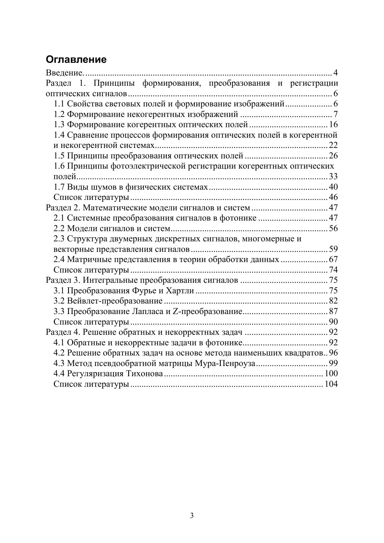 Рассмотрены теоретические основы формирования, преобразования и регистрации сигналов в системах фотоники, математические модели сигналов и систем, интегральные преобразования сигналов, методы решения обратных задач при бесконтактном контроле объектов. Пособие адресовано прежде всего студентам бакалавриата, обучающимся по направлению подготовки 12.03.03 "Фотоника и оптоинформатика" по учебным дисциплинам "Методы компьютерной фотоники", "Теория
