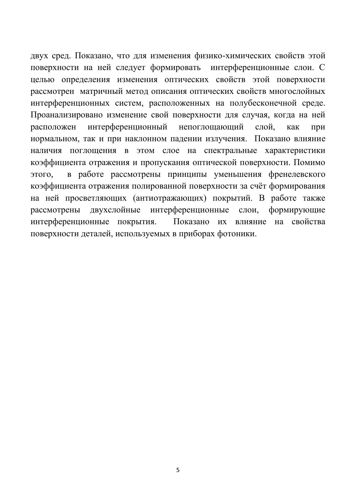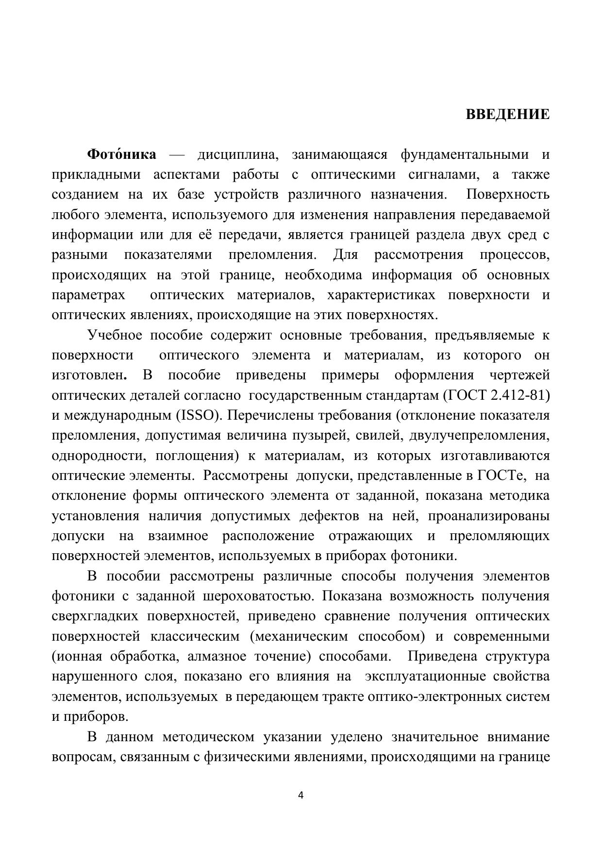 В пособии рассматриваются материалы, связанные с границей раздела двух сред с неравными показателями преломления. Рассмотрены основные характеристики этой границы: форма, шероховатость, дефекты, расположение её относительной других преломляющих сред. Представлен анализ отклонения показателей преломления, характеризующих эти среды, и наличие дефектов в средах, таких как пузырность, свильность, неоднородность, двулучепреломление на характер распространения излучения в них. Представлены требования к таким поверхностям, оформленные с использованием Российских и международных стандартов. Показано влияние переходного и трещиноватого слоёв на поверхностях, изготовленных из разных оптических материалов, на распространение излучения в оптическом элементе и отражении от данной поверхности. Приведён анализ возможности изменения физико-химических характеристик этой поверхности. Рассмотрены возможности увеличения и уменьшение отражения от этой поверхности падающего излучения. Показано влияние наличия поглощения в этих средах на изменение интенсивности падающего и отражённого излучений.