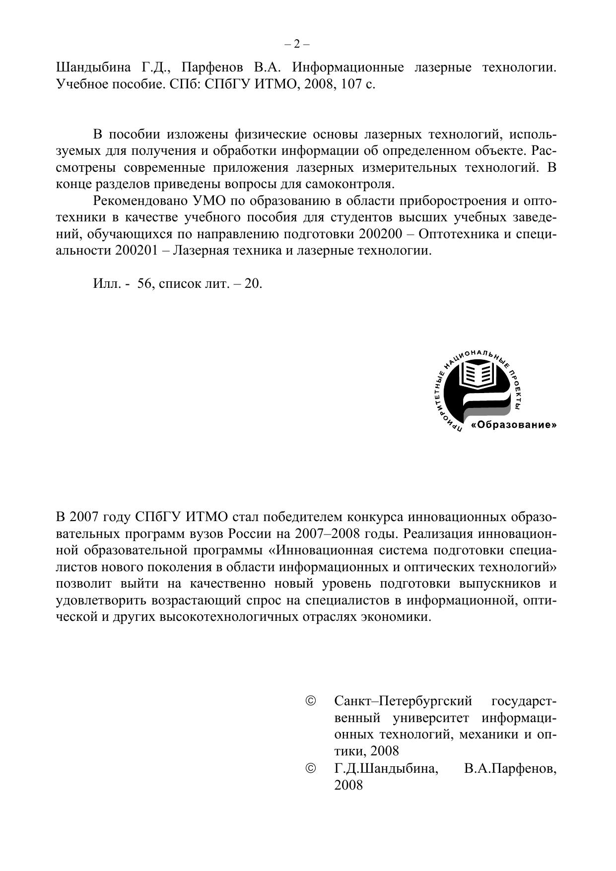 Гриф: Рекомендовано УМО по образованию в области приборостроения и оптотехники в качестве учебного пособия для студентов высших учебных заведений, обучающихся по направлению подготовки 200200 – Оптотехника и специальности 200201 – Лазерная техника и лазерные технологии.