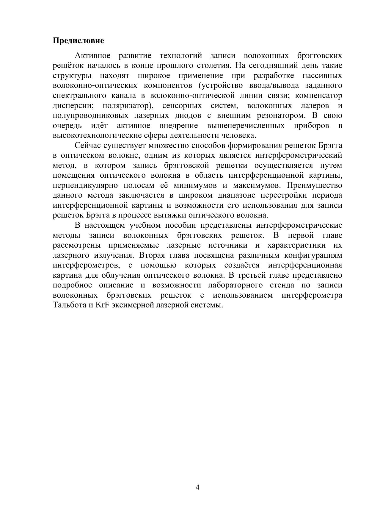 В рамках учебного пособия рассмотрены лазерные источники излучения, применяемые для формирования интерференционной картины. Представлены основные интерферометрические оптические схемы для записи волоконных брэгговских решёток. Также раскрыты возможности и практические аспекты схемы записи решёток Брэгга на основе интерферометра Тальбота с использованием KrF эксимерной лазерной системы типа задающий генератор – усилитель.