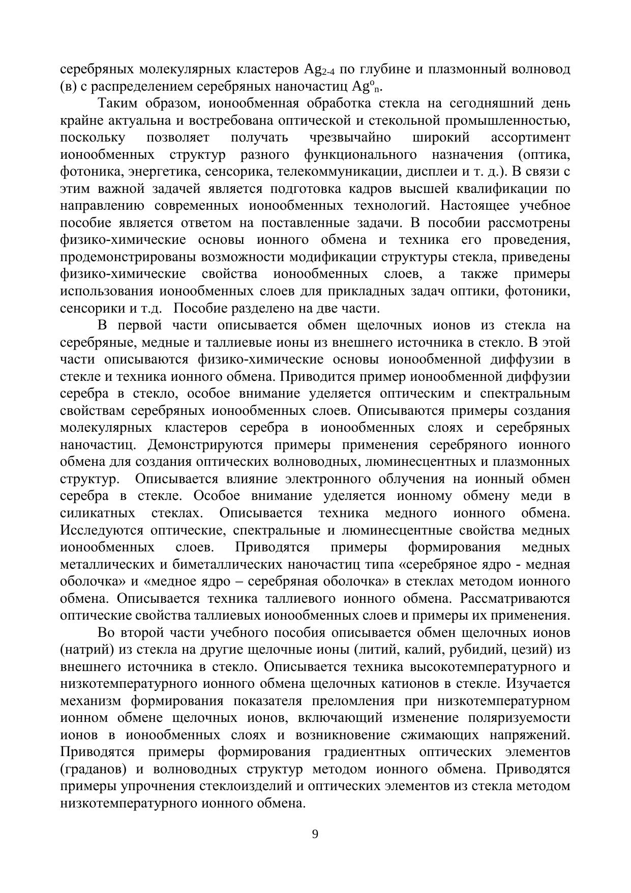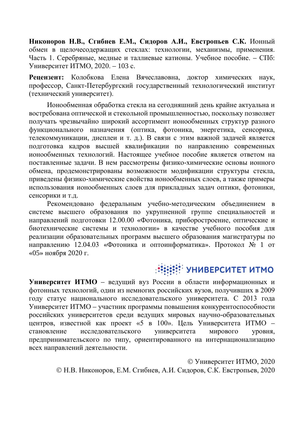 Ионообменная обработка стекла на сегодняшний день крайне актуальна и востребована оптической и стекольной промышленностью, поскольку позволяет получатть чрезвычайно широкий ассортимент ионообменных структур разного функционального назначения (оптика, фотоника, энергетика, сенсорика, телекоммуникации, дисплеи и т.д.). В связи с этим важной задачей является подготовка кадров высшей квалификации по направлению современных ионообменных технологий. Настощяее учебное пособие является ответом на поставленные задачи. В нем рассмотрены физико-химические основы ионного обмена, продемонстрированы возможности модификации структуры стекла, приведены физико-химические свойства ионообменных слоев, а также примеры использования ионообменных слоев для прикладных задач оптики фотоники, сенсорики и т.д.