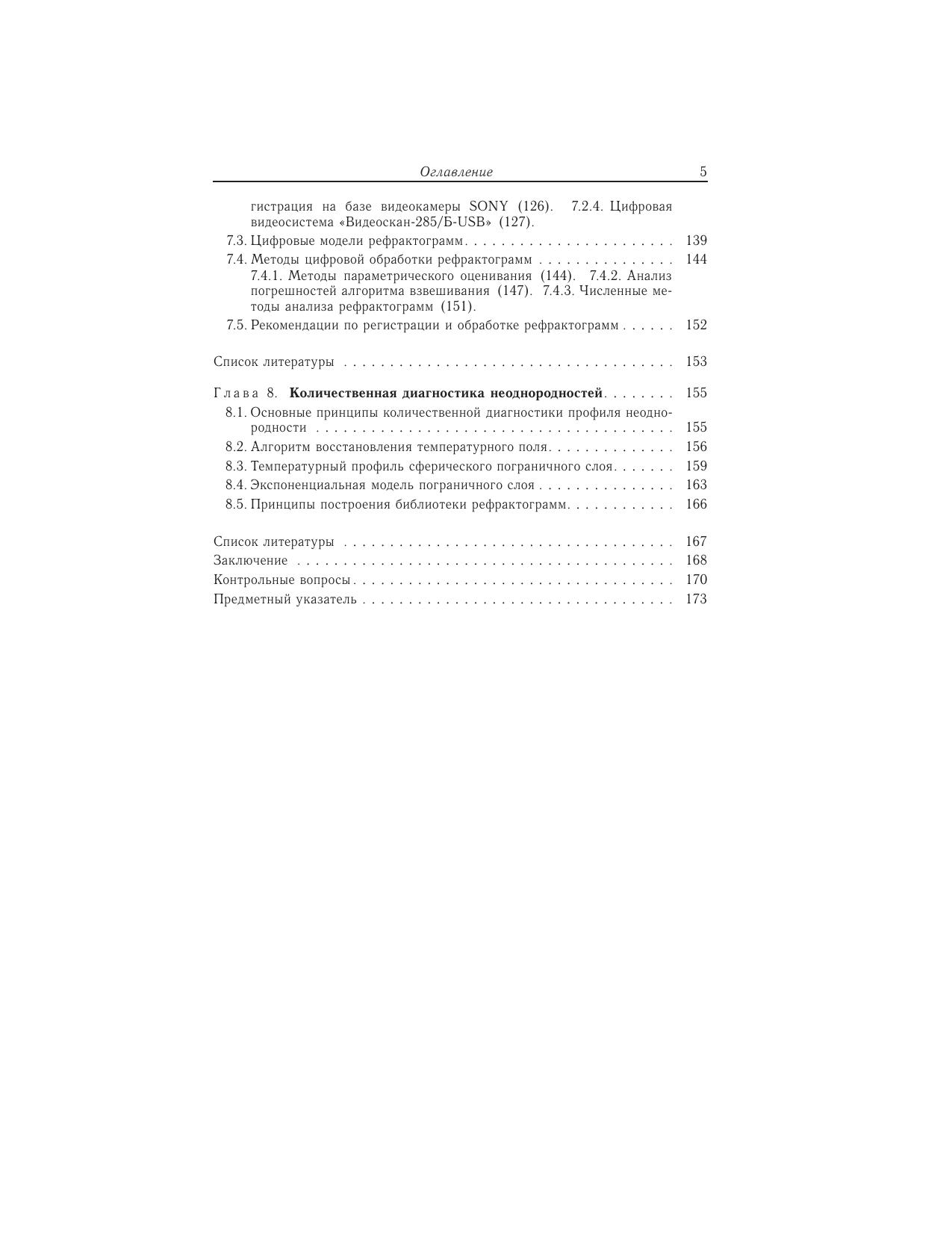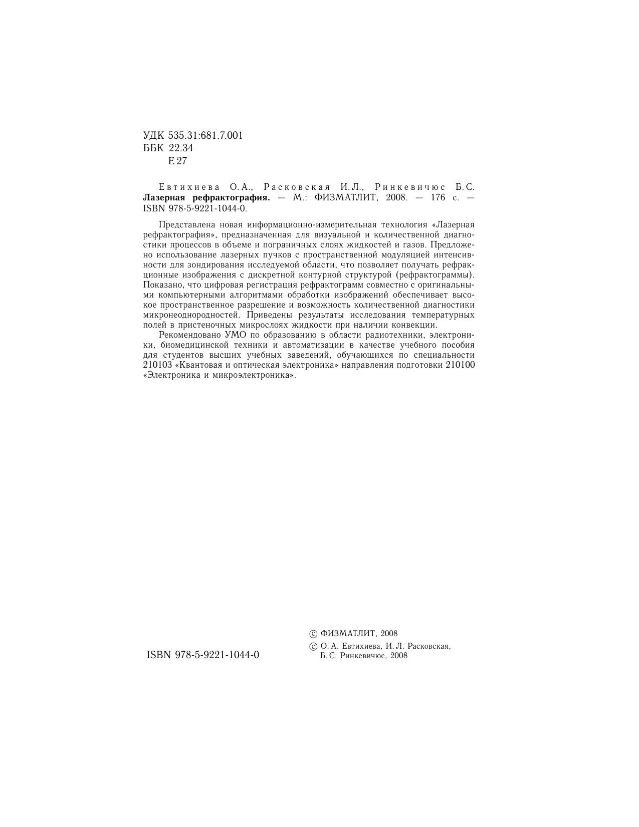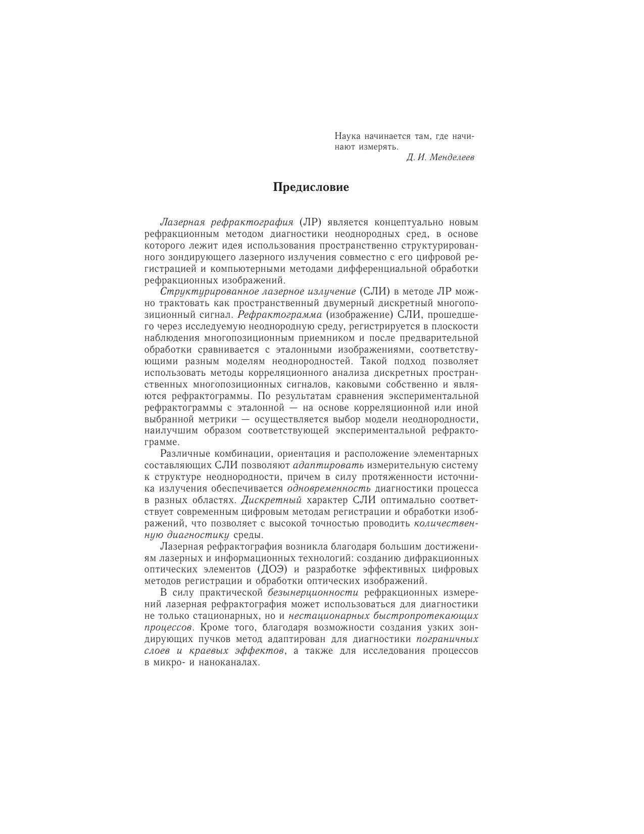 Представлена новая информационно-измерительная технология "Лазерная рефрактография", предназначенная для визуальной и количественной диагностики процессов в объеме и пограничных слоях жидкостей и газов. Предложено использование для зондирования исследуемой области лазерных пучков с пространственной модуляцией интенсивности, что позволяет получать рефракционные изображения с дискретной контурной структурой (рефрактограммы). Показано, что цифровая регистрация рефрактограмм совместно с оригинальными компьютерными алгоритмами обработки изображений обеспечивает высокое пространственное разрешение и возможность количественной диагностики микронеоднородностей. Приведены результаты исследования температурных полей в пристеночных микрослоях жидкости при наличии конвекции. Для специалистов по лазерным измерениям, теплофизике, динамике жидкости и газа, а также аспирантов и студентов соответствующих специальностей. Рекомендовано УМО по образованию в области радиотехники, электроники, биомедицинской техники и автоматизации в качестве учебного пособия для студентов высших учебных заведений, обучающихся по специальности 210103 "Квантовая и оптическая электроника" направления подготовки 210100 "Электроника и микроэлектроника".