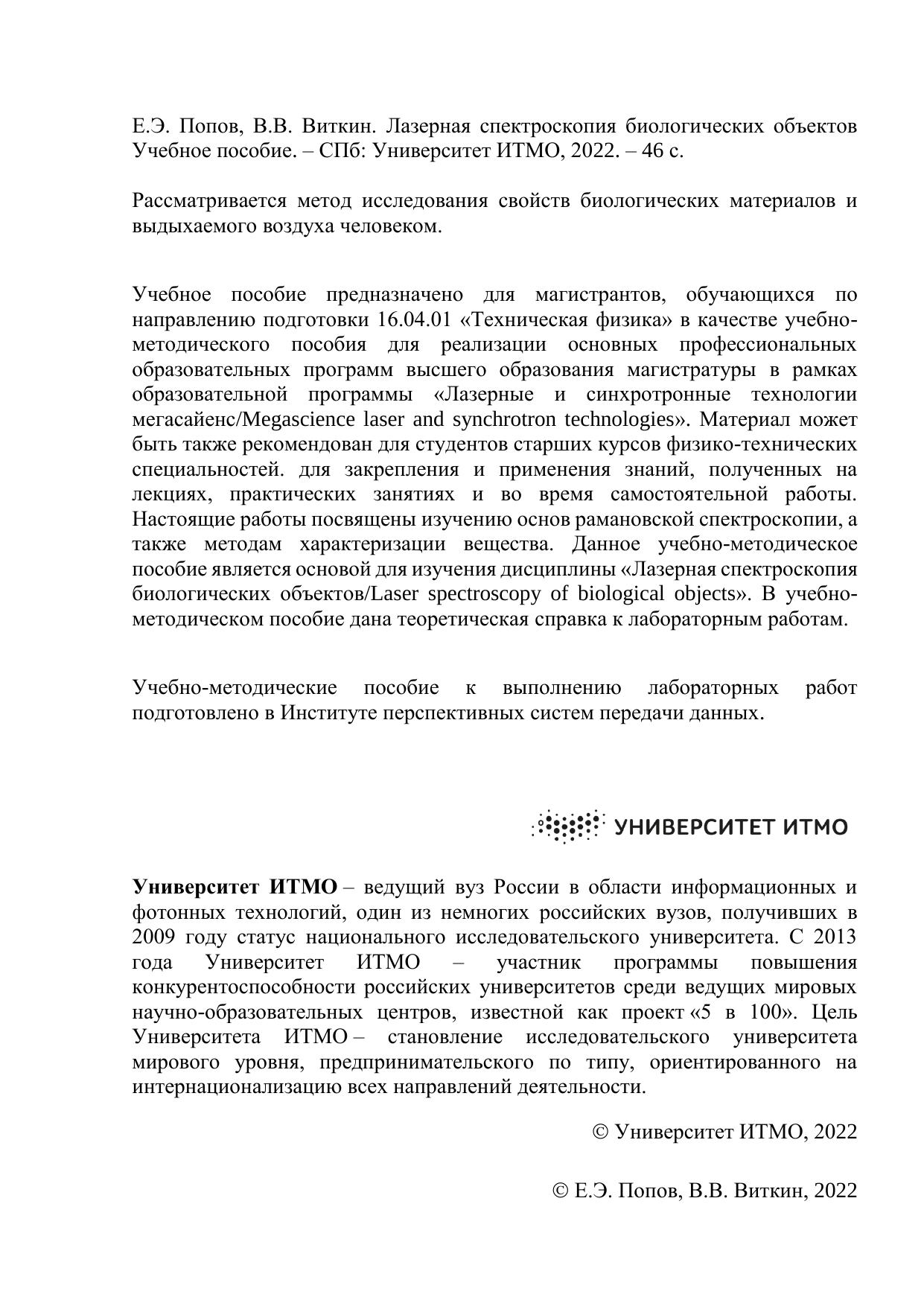 Учебное пособие предназначено для магистрантов, обучающихся по направлению подготовки 16.04.01 «Техническая физика» в качестве учебно-методического пособия для реализации основных профессиональных образовательных программ высшего образования магистратуры в рамках образовательной программы «Лазерные и синхротронные технологии мегасайенс/Megascience laser and synchrotron technologies». Материал может быть также рекомендован для студентов старших курсов физико-технических специальностей. для закрепления и применения знаний, полученных на лекциях, практических занятиях и во время самостоятельной работы. Настоящие работы посвящены изучению основ рамановской спектроскопии, а также методам характеризации вещества. Данное учебно-методическое пособие является основой для изучения дисциплины «Лазерная спектроскопия биологических объектов/Laser spectroscopy of biological objects». В учебно-методическом пособие дана теоретическая справка к лабораторным работам