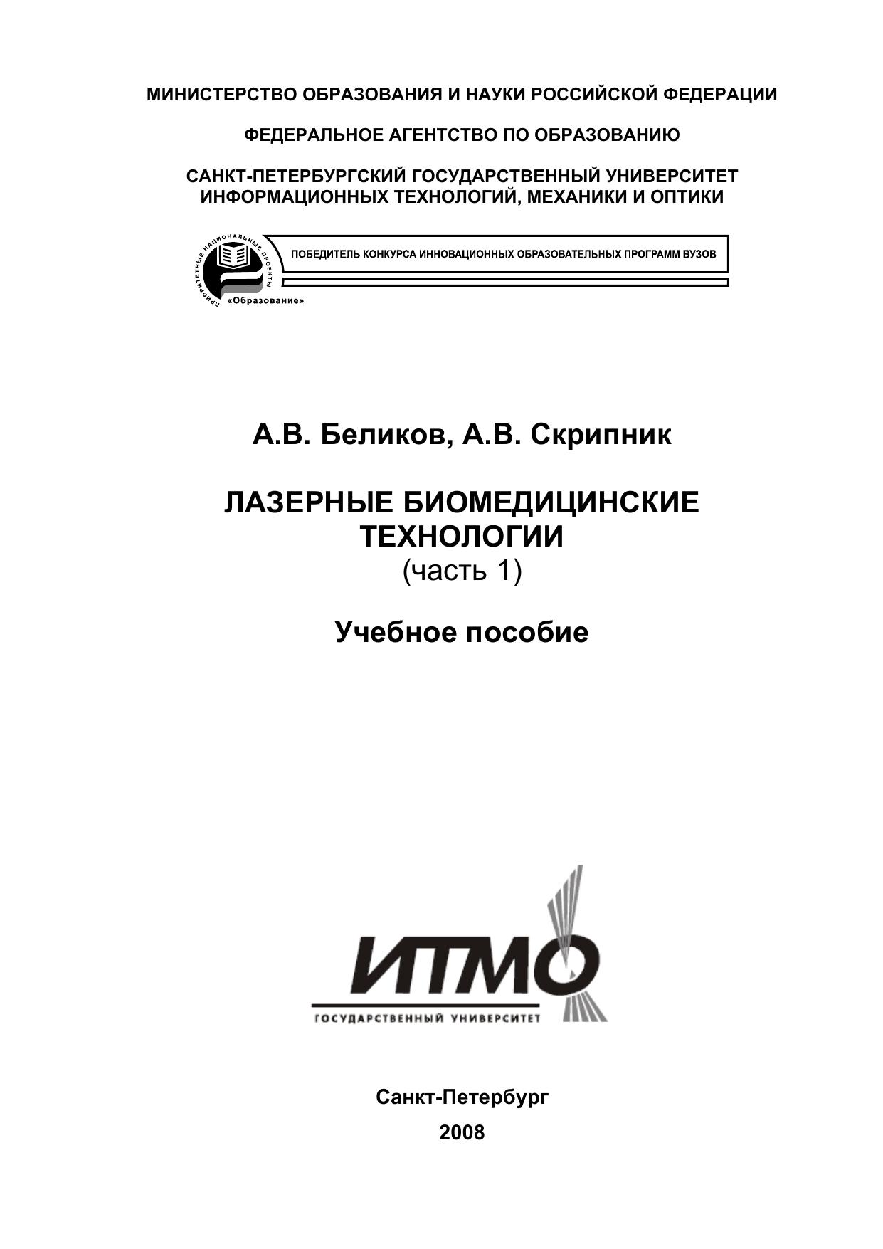 Учебное пособие предназначено для самостоятельной работы студентов, обучающихся в магистратуре, а также бакалавров и специалистов по программам 200200.68 ? "Лазерные биомедицинские технологии" и 200201.65 ? "Лазерная техника и лазерные технологии".