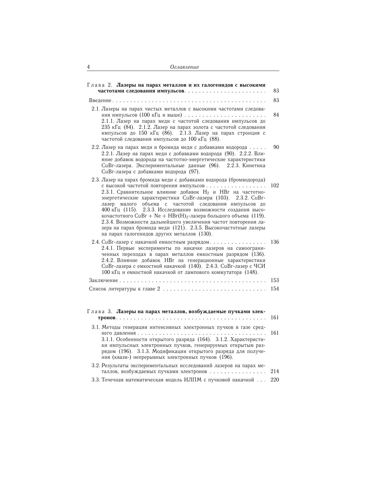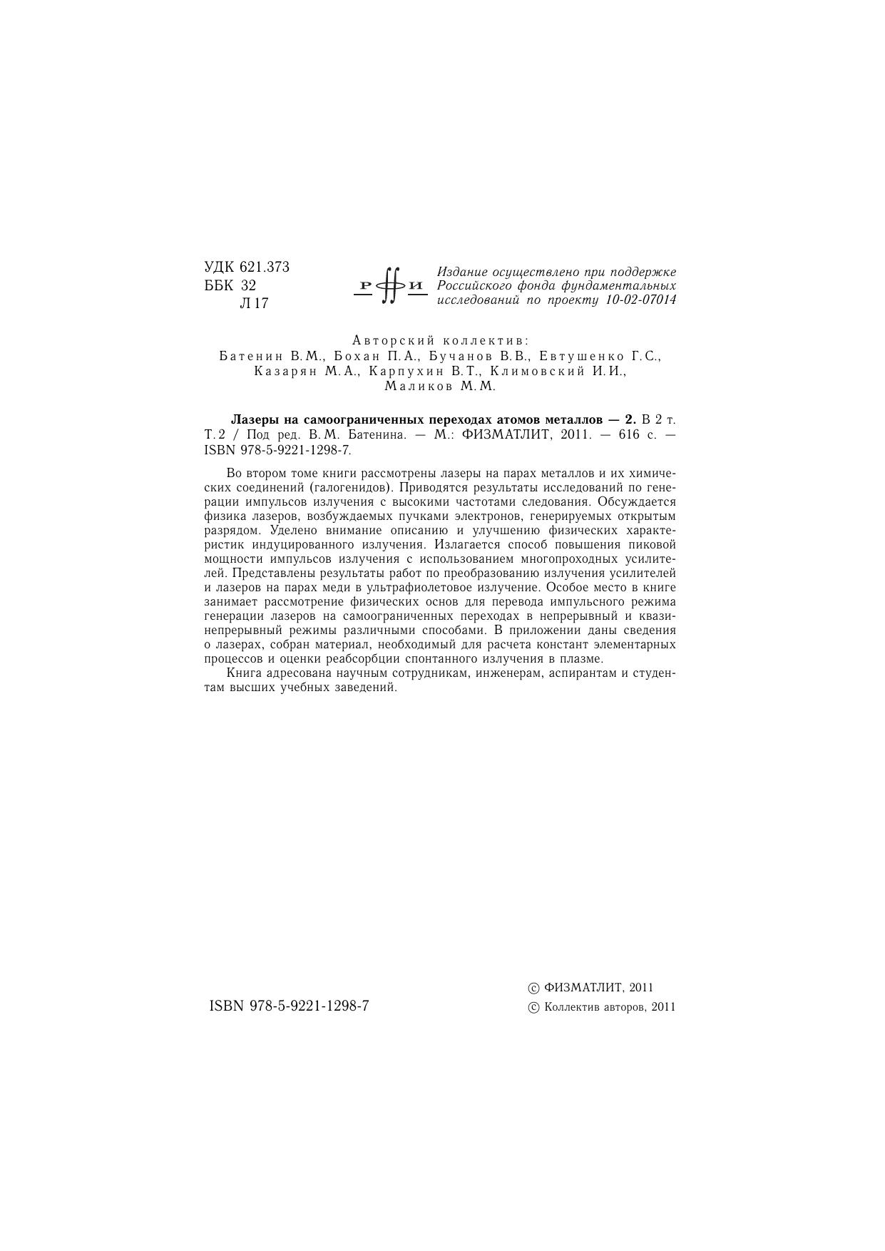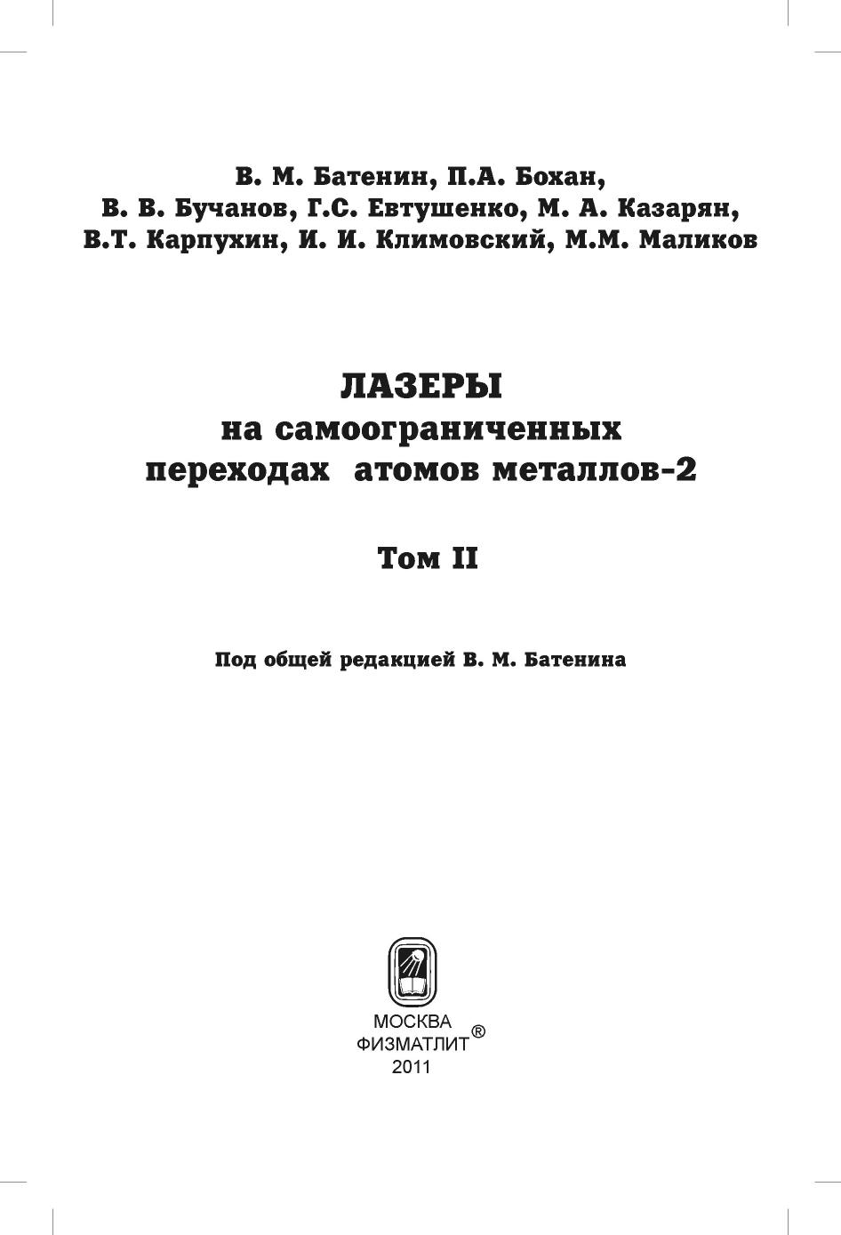 Во втором томе книги рассмотрены лазеры на парах металлов и их химических соединений (галогенидов). Приводятся результаты исследований по генерации импульсов излучения с высокими частотами следования. Обсуждается физика лазеров, возбуждаемых пучками электронов, генерируемых открытым разрядом. Уделено внимание описанию и улучшению физических характеристик индуцированного излучения. Излагается способ повышения пиковой мощности импульсов излучения с использованием многопроходных усилителей. Представлены результаты работ по преобразованию излучения усилителей и лазеров на парах меди в ультрафиолетовое излучение. Особое место в книге занимает рассмотрение физических основ для перевода импульсного режима генерации лазеров на самоограниченных переходах в непрерывный и квазинепрерывный режимы различными способами. В приложении даны сведения о лазерах, собран материал, необходимый для расчета констант элементарных процессов и оценки реабсорбции спонтанного излучения в плазме. Книга адресована научным сотрудникам, инженерам, аспирантам и студентам высших учебных заведений.