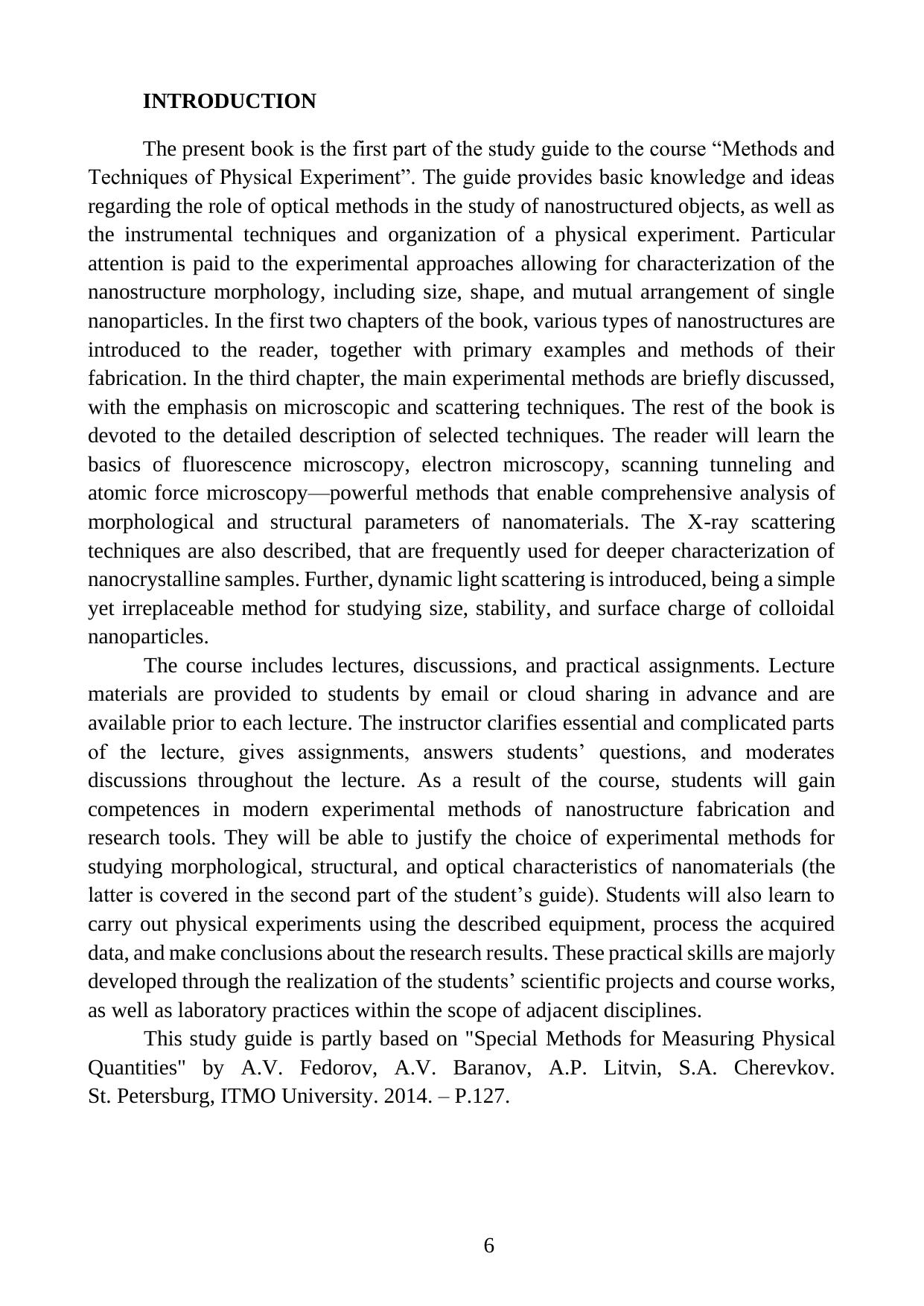 The present study guide is devoted to the education course "Methods and Techniques of Physical Experiment" and provides an overview of methods for fabrication and experimental analysis of nanostructures. It covers technologies for the synthesis of single nanoobjects, such as quantum dots and nanotubes, as well as the formation of hybrid nanostructures. The analytical methods discussed in the study guide include fluorescence, electron, probe microscopy, and X-ray scattering techniques, whose main task is to study geometry, internal structure, and chemical composition of nanostructures.
