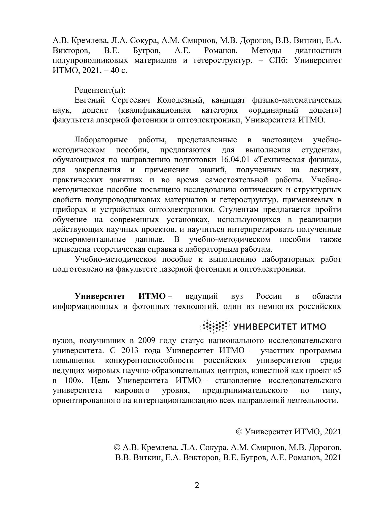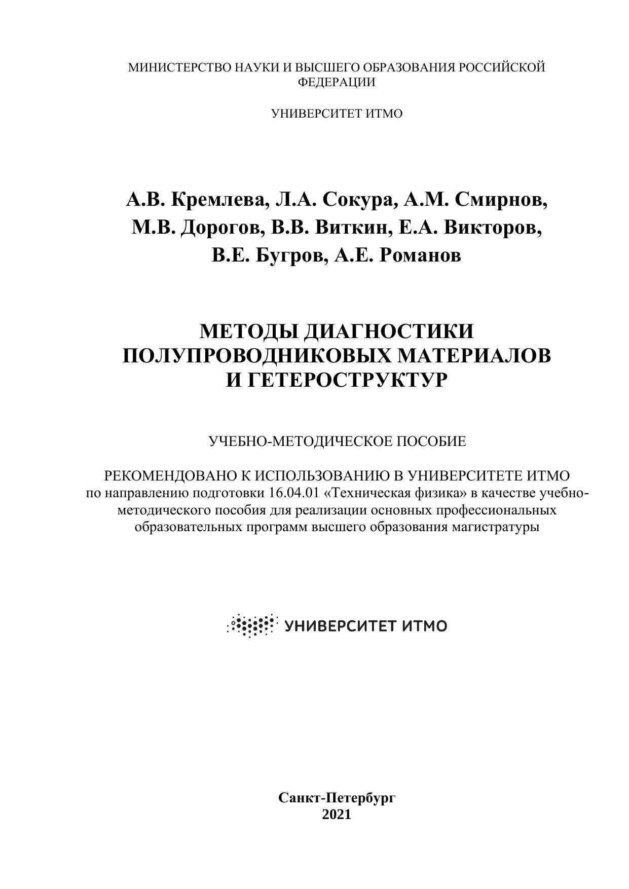 Лабораторные работы, представленные в настоящем учебно-методическом пособии, предлагаются для выполнения студентам, обучающимся по направлению подготовки 16.04.01 «Техническая физика», для закрепления и применения знаний, полученных на лекциях, практических занятиях и во время самостоятельной работы. Учебно-методическое пособие посвящено исследованию оптических и структурных свойств полупроводниковых материалов и гетероструктур, применяемых в приборах и устройствах оптоэлектроники. Студентам предлагается пройти обучение на современных установках, использующихся в реализации действующих научных проектов, и научиться интерпретировать полученные экспериментальные данные. В учебно-методическом пособии также приведена теоретическая справка к лабораторным работам.