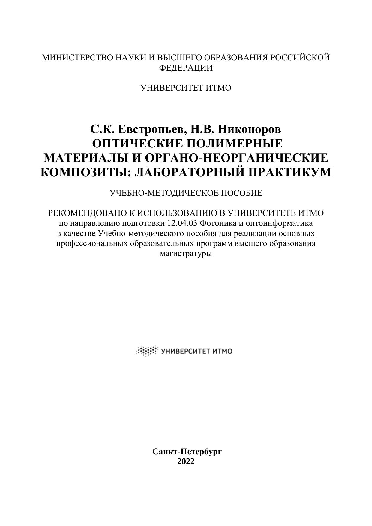 Учебно-методическое пособие посвящено свойствам полимерных органических и композиционных оптических материалов. Представлены шесть лабораторных работ, направленных на создание и развитие у студентов навыков создания и изучения свойств различных оптических материалов, содержащих органические полимеры. Пособие предназначено для студентов, обучающихся по направлению подготовки магистров 12.04.03 «Фотоника и оптоинформатика»