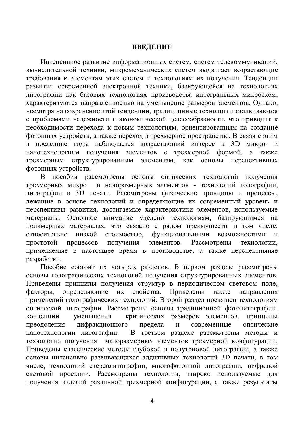 В пособии приведены основы оптических 3D технологий получения микро и наноразмерных элементов фотоники и информационных систем - технологий голографии, литографии и 3D печати. Рассмотрены физические принципы и процессы, лежащие в основе технологий, примеры и характеристики элементов, направления применений. Основное внимание уделяется технологиям, базирующимся на полимерных материалах. Представлены технологии, используемые в настоящее время в производстве, а также перспективные разработки, ориентированные на получение элементов трехмерной конфигурации и структурированных элементов фотонных устройств.