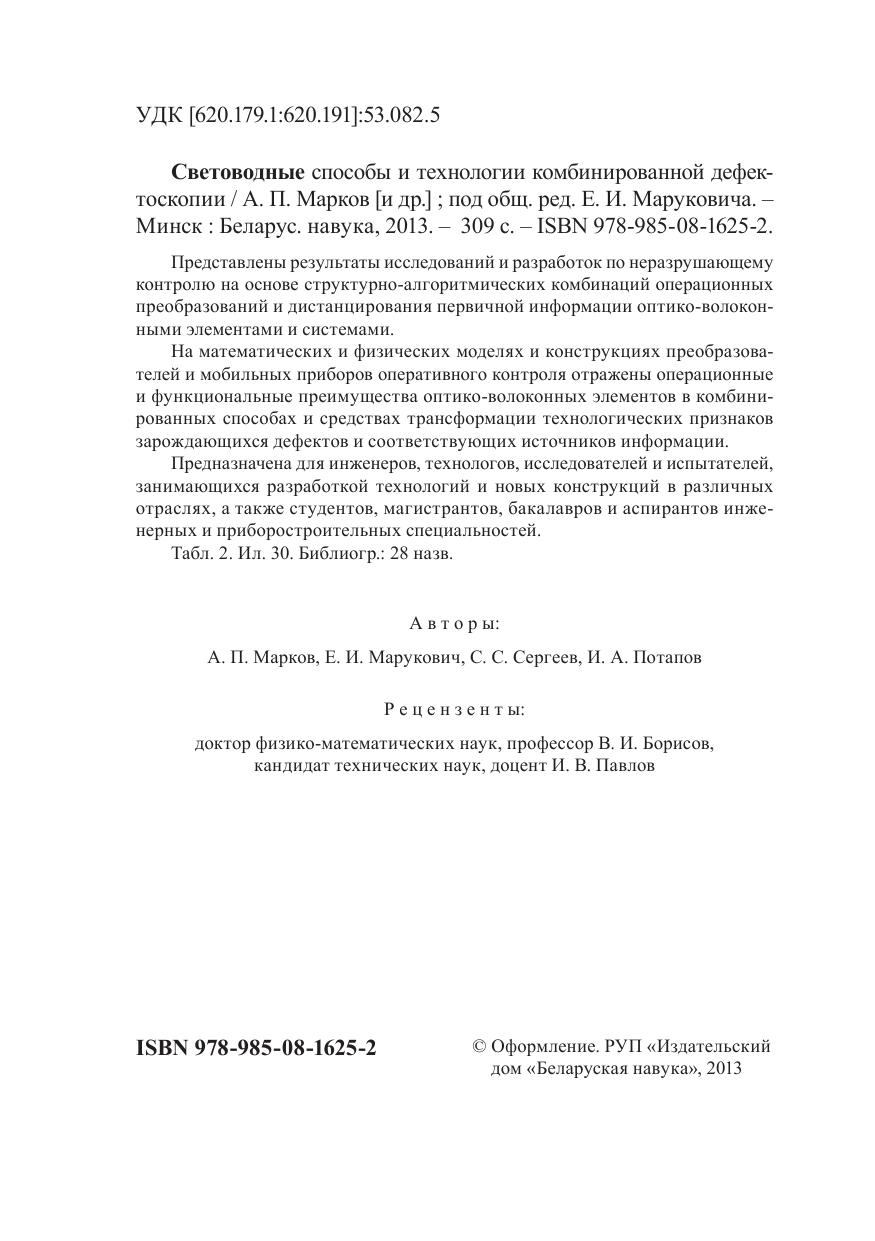 Представлены результаты исследований и разработок по неразрушающему контролю на основе структурно-алгоритмических комбинаций операционных преобразований и дистанцирования первичной информации оптико-волоконными элементами и системами. На математических и физических моделях и конструкциях преобразователей и мобильных приборов оперативного контроля отражены операционные и функциональные преимущества оптико-волоконных элементов в комбинированных способах и средствах трансформации технологических признаков зарождающихся дефектов и соответствующих источников информации. Предназначена для инженеров, технологов, исследователей и испытателей, занимающихся разработкой технологий и новых конструкций в различных отраслях, а также студентов, магистрантов, бакалавров и аспирантов инженерных и приборостроительных специальностей.
