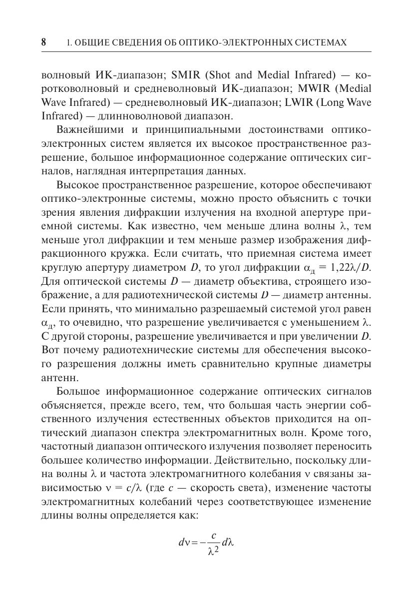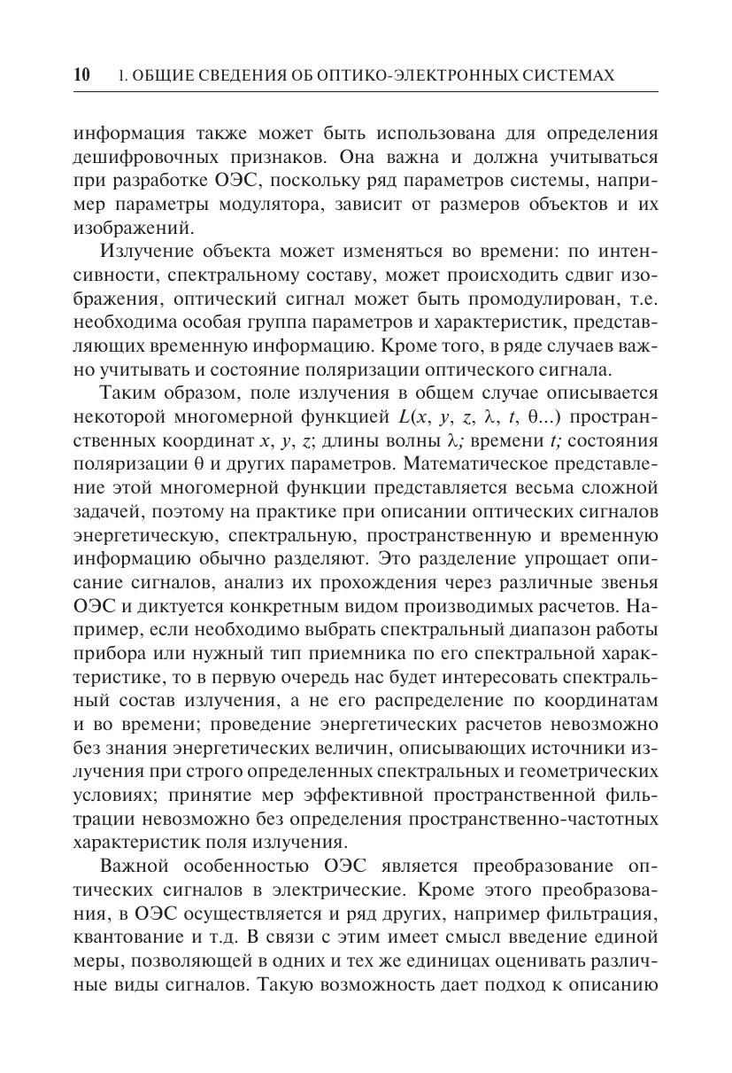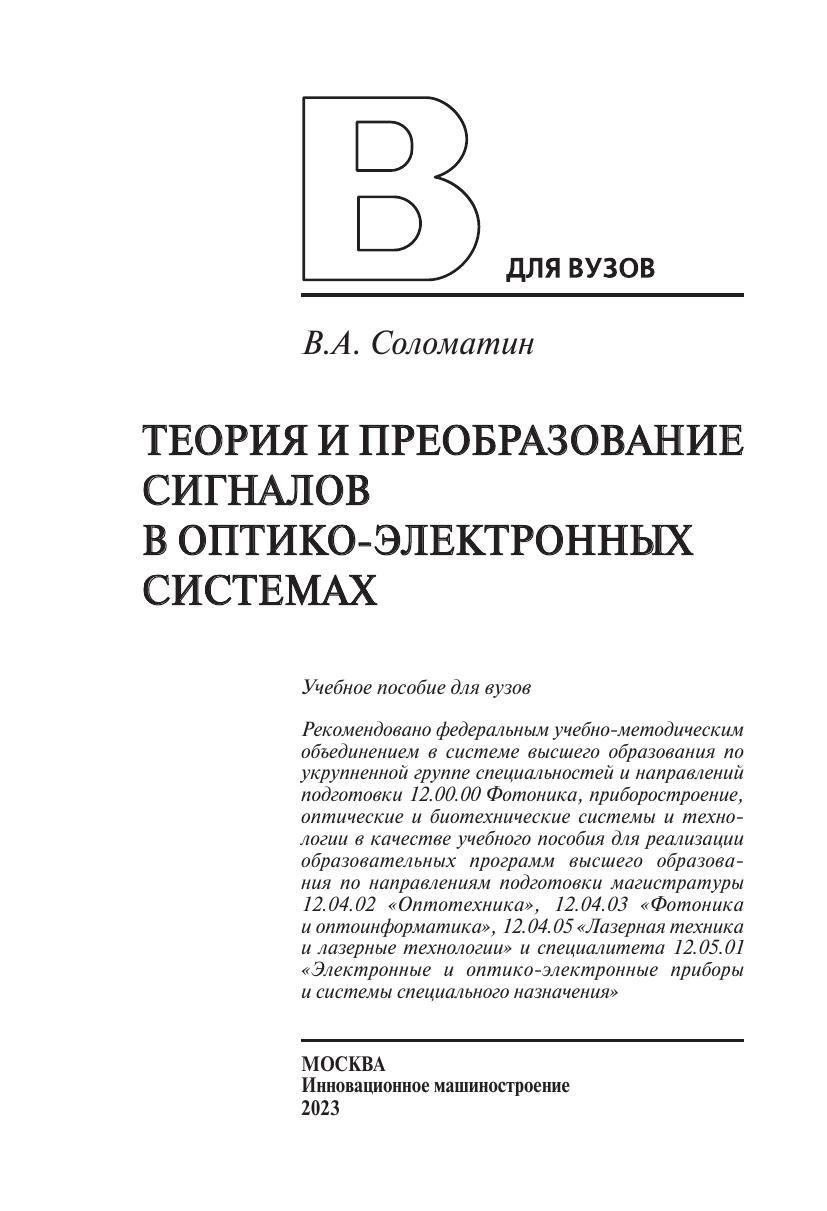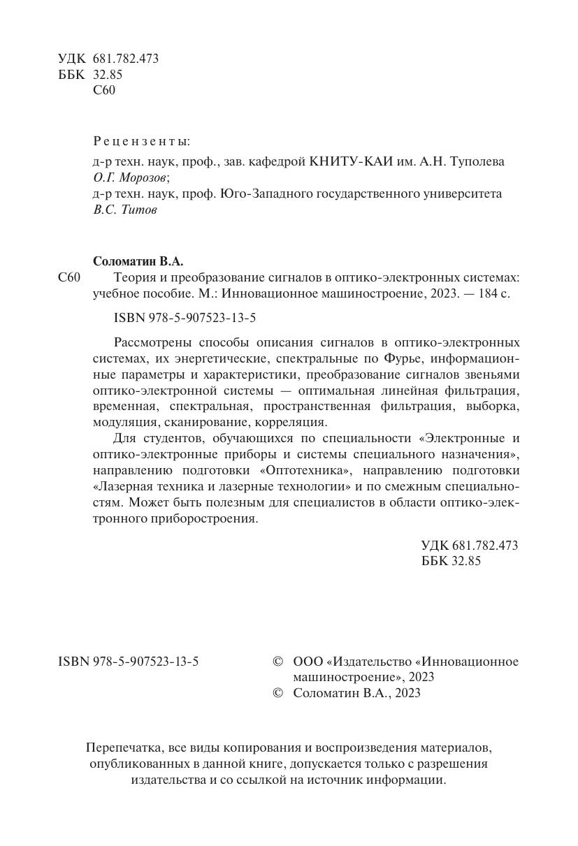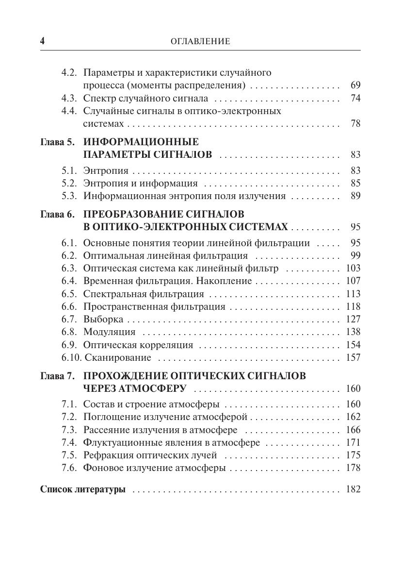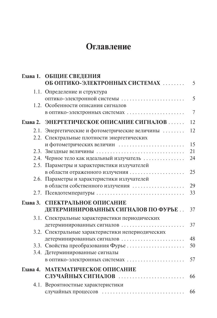 Рассмотрены способы описания сигналов в оптико-электронных системах, их энергетические, спектральные по Фурье, информационные параметры и характеристики, преобразование сигналов звеньями оптико-электронной системы — оптимальная линейная фильтрация, временная, спектральная, пространственная фильтрация, выборка, модуляция, сканирование, корреляция. Для студентов, обучающихся по специальности ≪Электронные и оптико-электронные приборы и системы специального назначения≫, направлению подготовки ≪Оптотехника≫, направлению подготовки ≪Лазерная техника и лазерные технологии≫ и по смежным специальностям. Может быть полезным для специалистов в области оптико-электронного приборостроения.