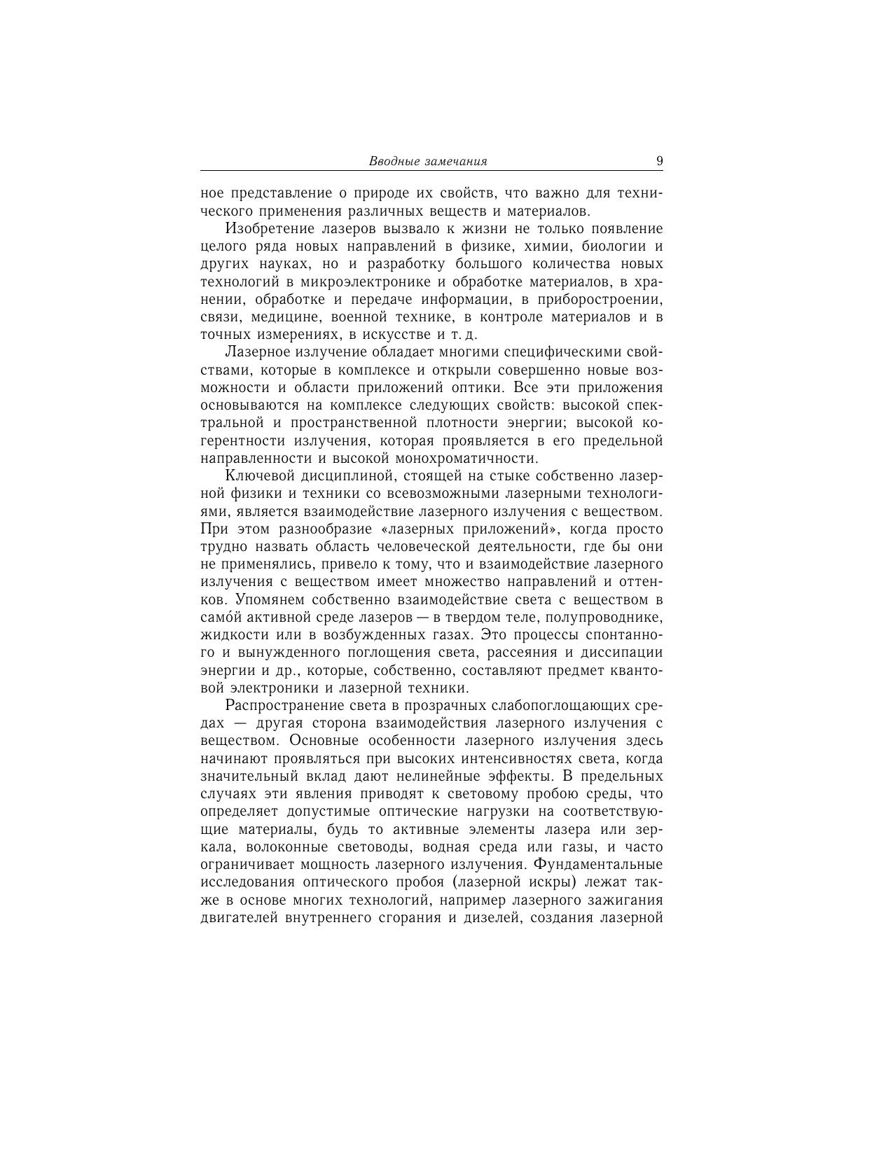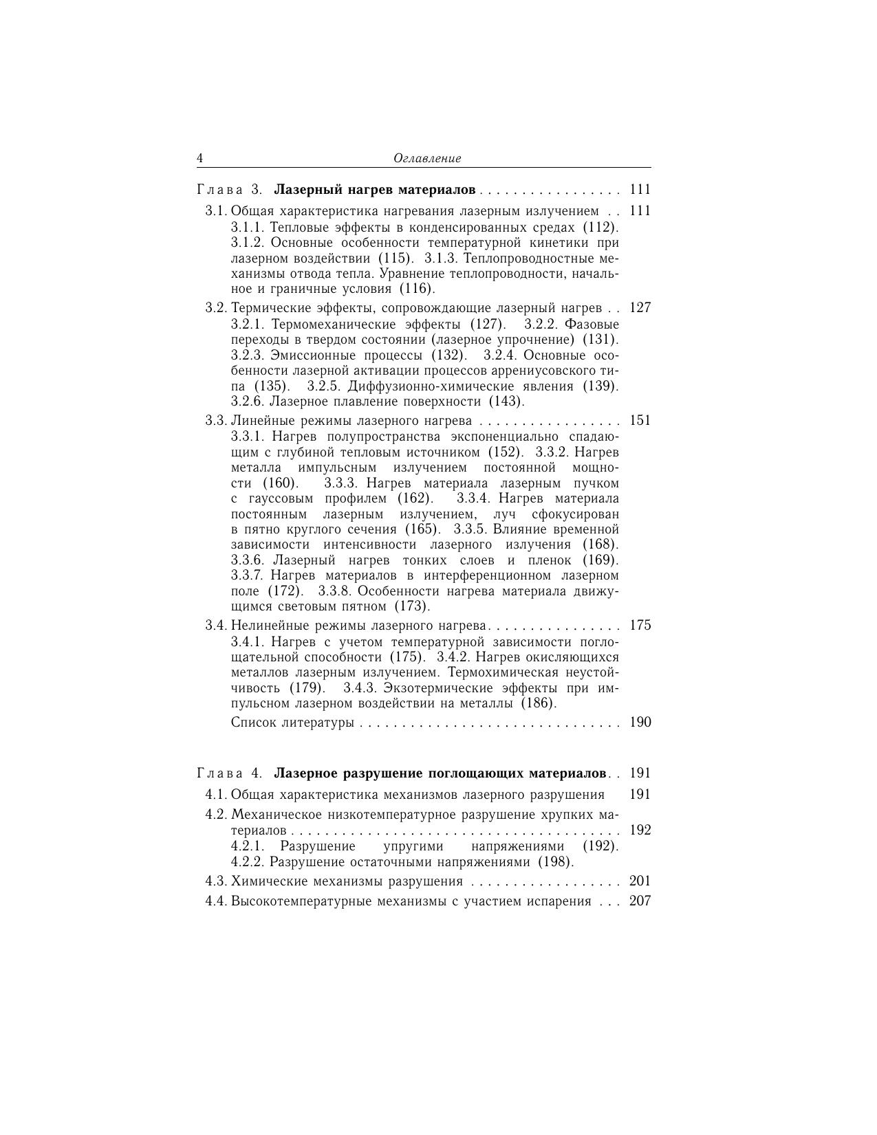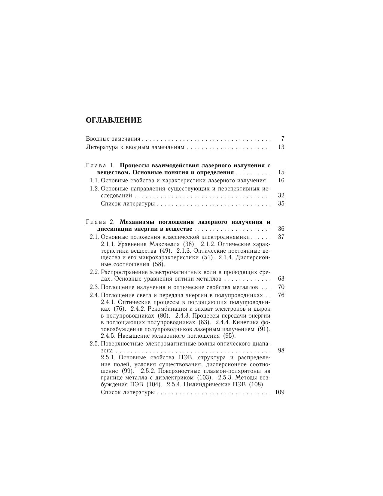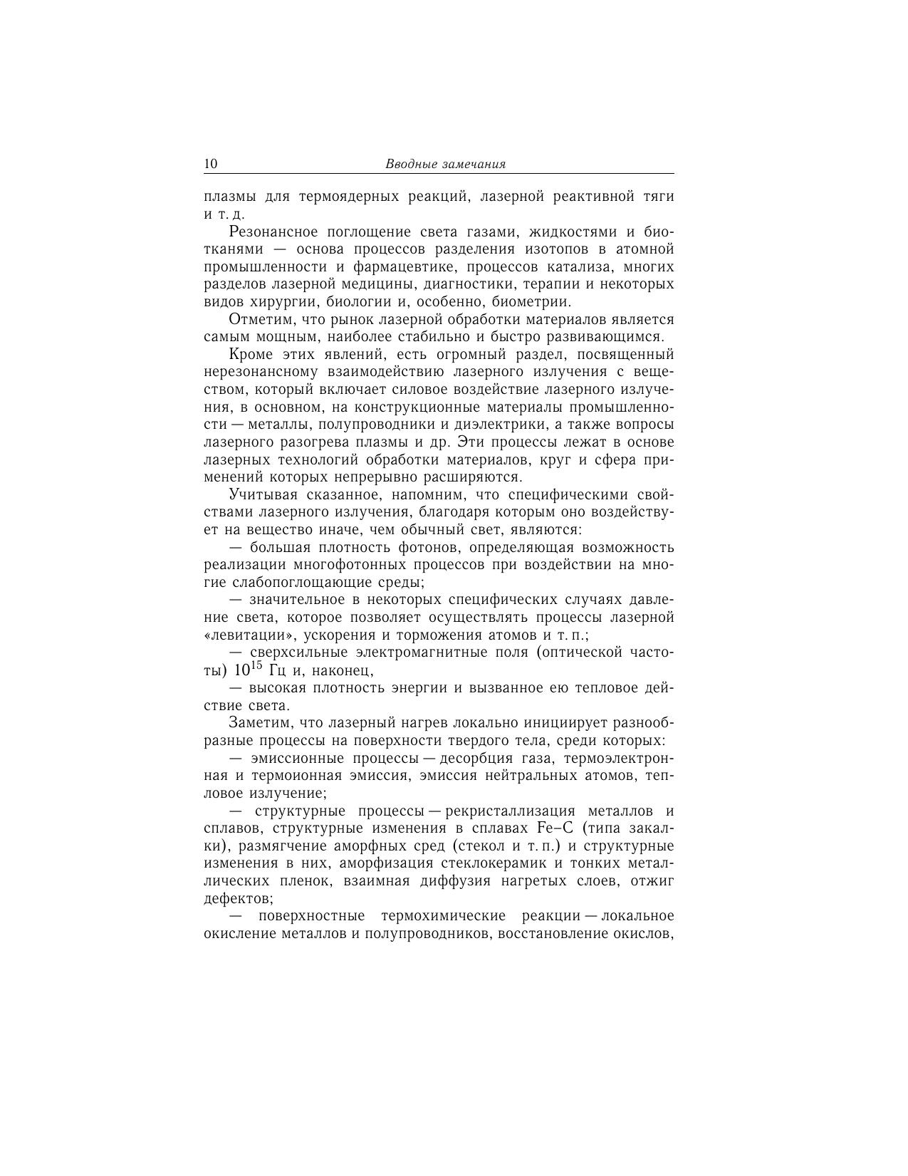 Книга посвящена рассмотрению тепловой модели воздействия лазерного излучения на конденсированные среды. Описаны механизмы поглощения и диссипации энергии света в металлах и полупроводниках. Рассмотрена роль поверхностных электромагнитных волн оптического диапазона, процессы нагревания вещества лазерным излучением в линейных и нелинейных режимах, а также нетермические эффекты, сопровождающие лазерный нагрев. Детально рассмотрены механизмы лазерного разрушения поглощающих материалов. Изложены математические модели лазерного испарения для различных условий и сред. Тепловая модель распространена на оптический пробой прозрачных сред рассмотрены механизмы пробоя газов и идеальных прозрачных твердых тел, тепловой неустойчивости на поглощающих неоднородностях, а также статистическая концепция оптического пробоя. Для научных работников, студентов и аспирантов, специализирующихся в области лазерной техники и технологии. Рекомендовано УМО по образованию в области приборостроения и оптотехники в качестве учебного пособия для студентов высших учебных заведений, обучающихся по специальности 200201 «Лазерная техника и лазерные технологии».