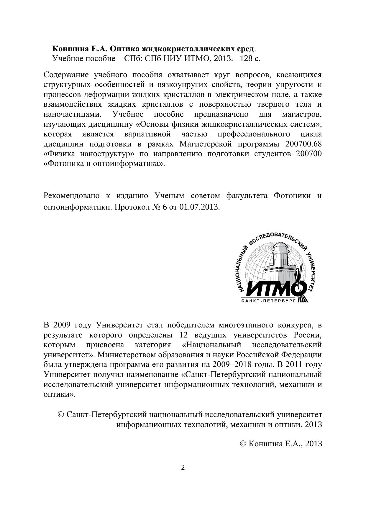 Содержание учебного пособия охватывает круг вопросов, касающихся структурных особенностей и вязкоупругих свойств, теории упругости и процессов деформации жидких кристаллов в электрическом поле, а также взаимодействия жидких кристаллов с поверхностью твердого тела и наночастицами. Учебное пособие предназначено для магистров, изучающих дисциплину «Основы физики жидкокристаллических систем», которая является вариативной частью профессионального цикла дисциплин подготовки в рамках Магистерской программы 200700.68 «Физика наноструктур» по направлению подготовки студентов 200700 «Фотоника и оптоинформатика».
