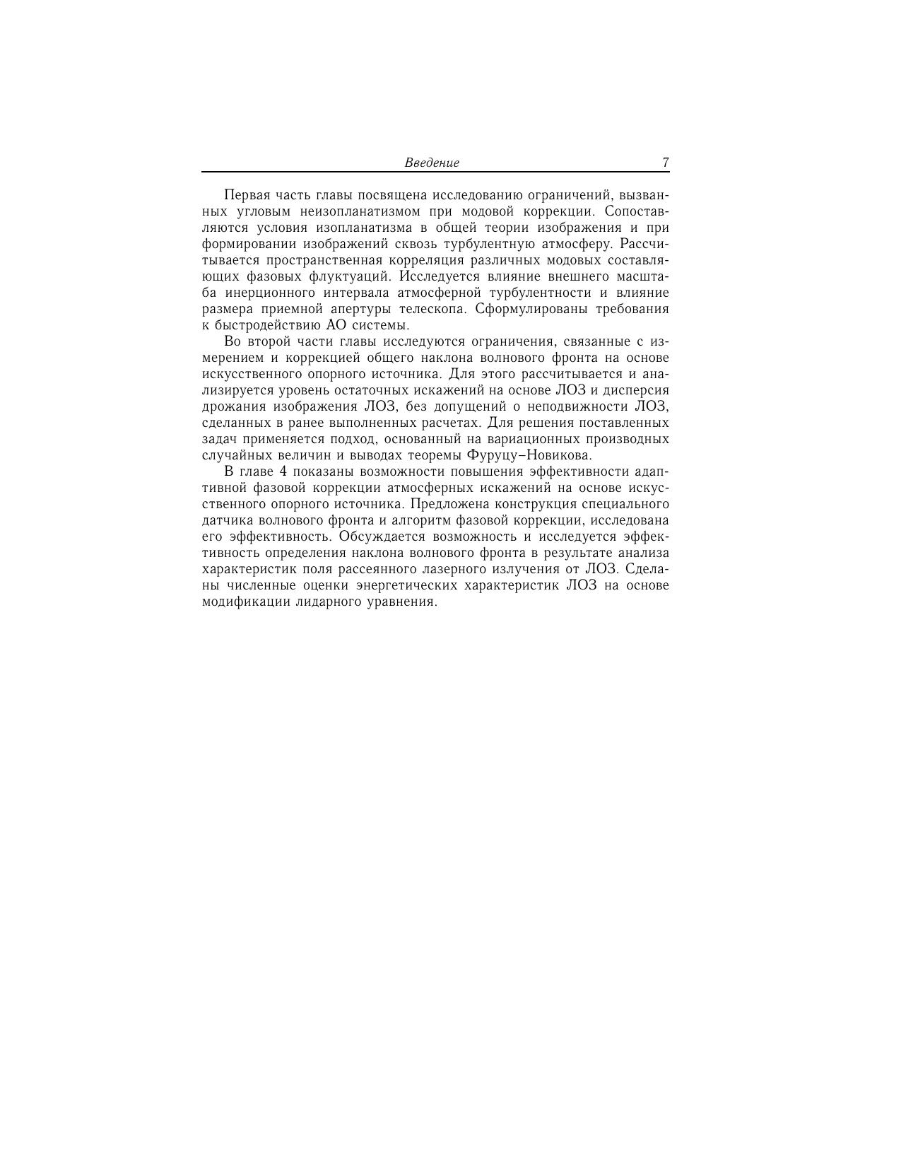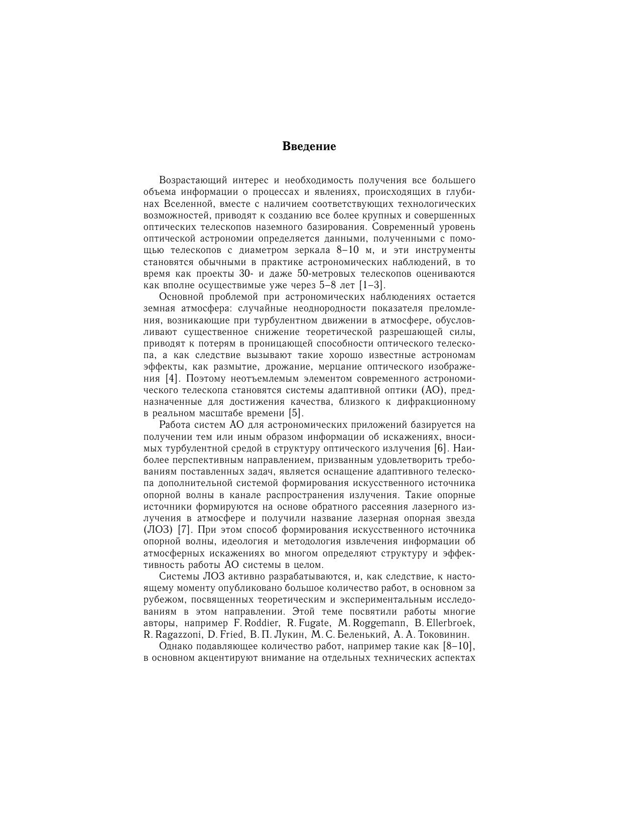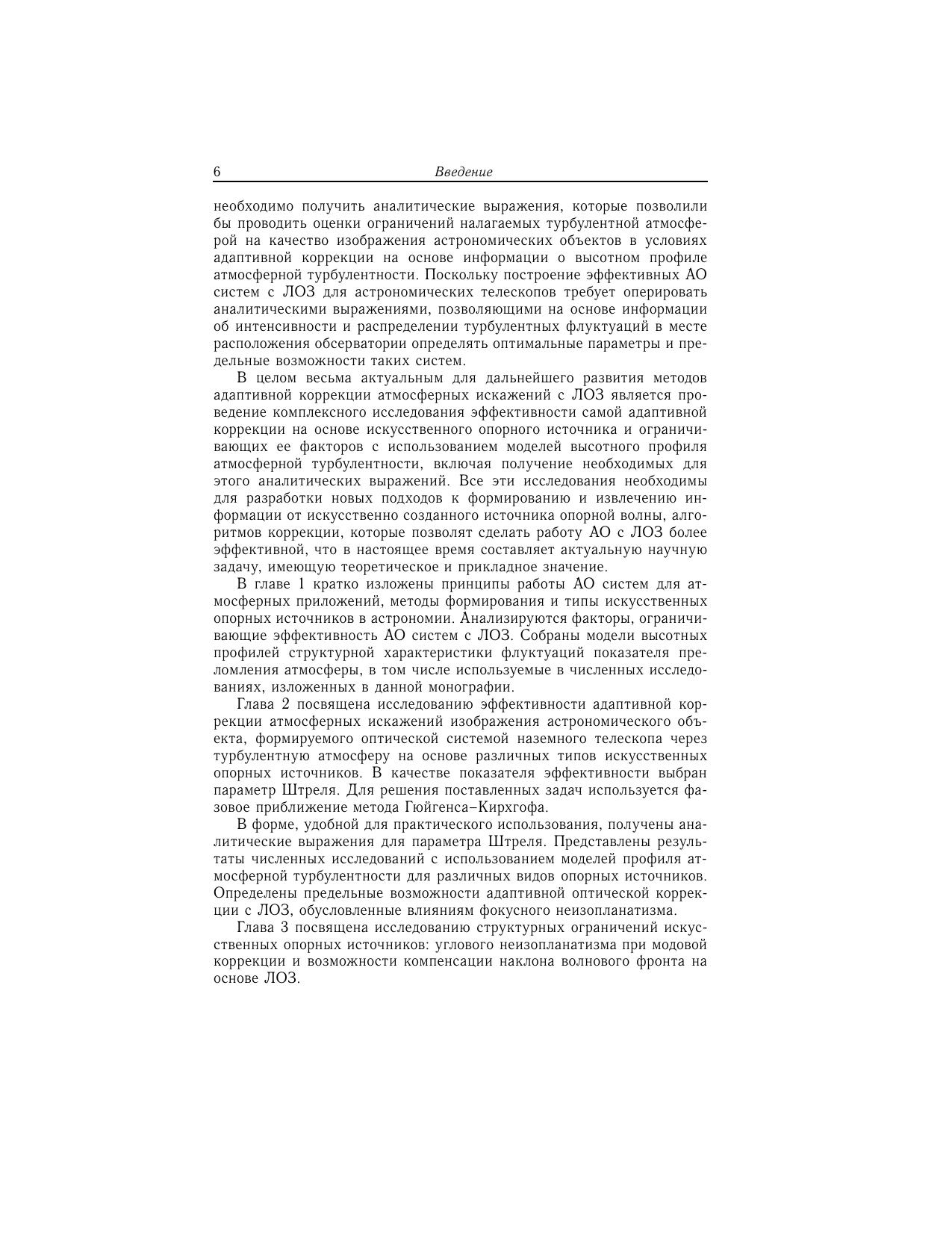 Книга посвящена проблемам использования адаптивной оптики для астрономических приложений. В основе лежат оригинальные работы авторов по исследованию адаптивной фазовой коррекции турбулентных искажений оптических изображений, формируемых астрономическими телескопами, при использовании искусственного опорного источника—лазерной опорной звезды. Для научных сотрудников, специализирующихся в области атмосферной адаптивной оптики, а также аспирантов и студентов соответствующих специальностей.