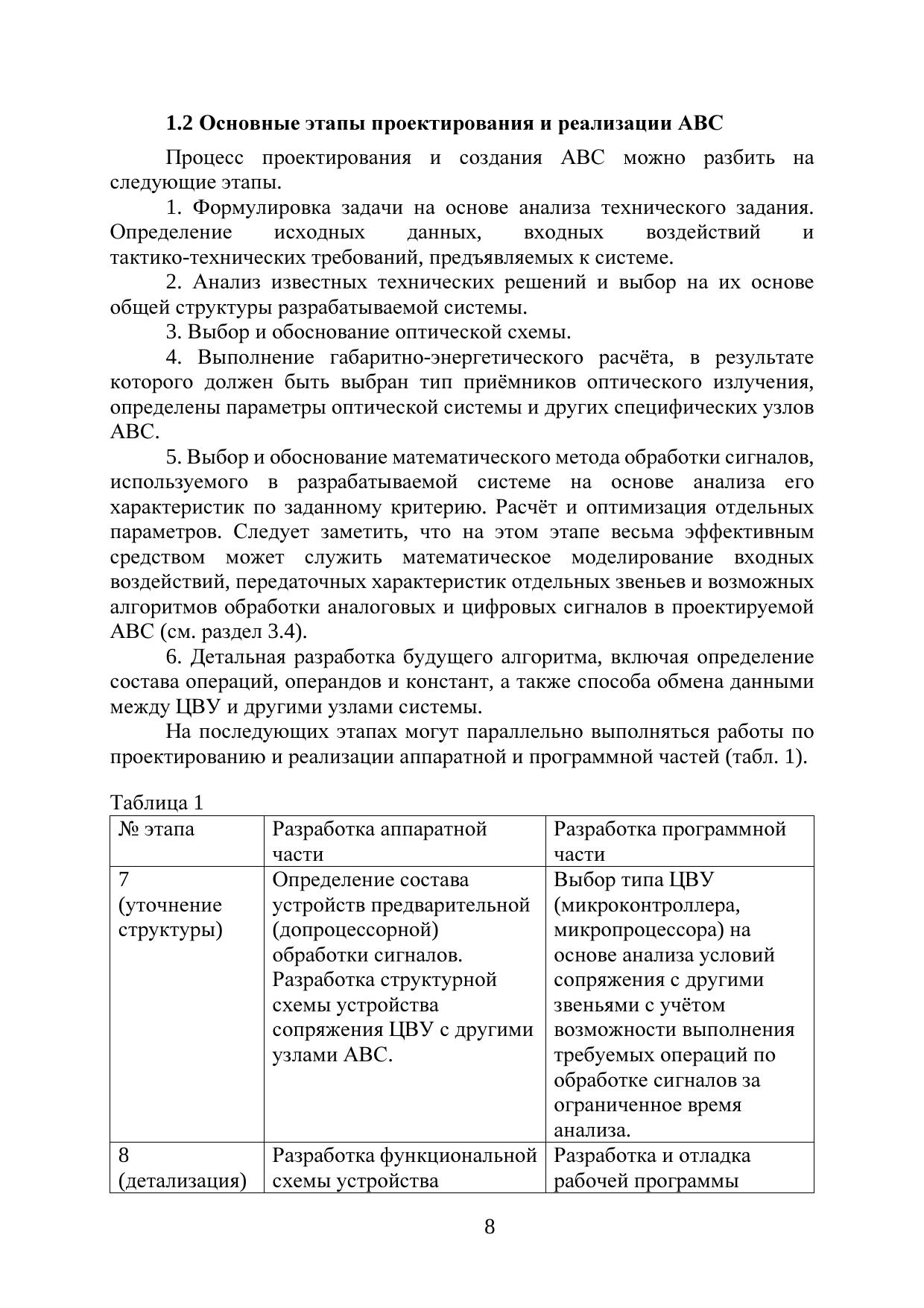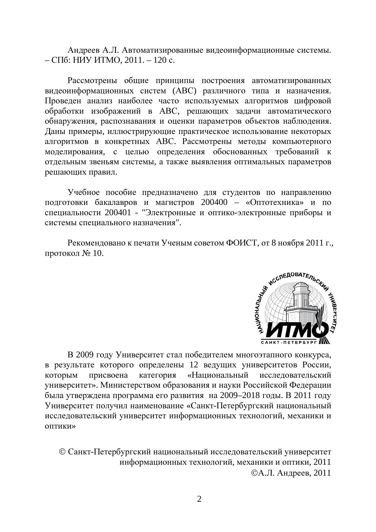 Рассмотрены общие принципы построения автоматизированных видеоинформационных систем (АВС) различного типа и назначения. Проведен анализ наиболее часто используемых алгоритмов цифровой обработки изображений в АВС, решающих задачи автоматического обнаружения, распознавания и оценки параметров объектов наблюдения. Даны примеры, иллюстрирующие практическое использование некоторых алгоритмов в конкретных АВС. Рассмотрены методы компьютерного моделирования, с целью определения обоснованных требований к отдельным звеньям системы, а также выявления оптимальных параметров решающих правил. Учебное пособие предназначено для студентов по направлению подготовки бакалавров и магистров 200400 – «Оптотехника» и по специальности 200401 - "Электронные и оптико-электронные приборы и системы специального назначения".