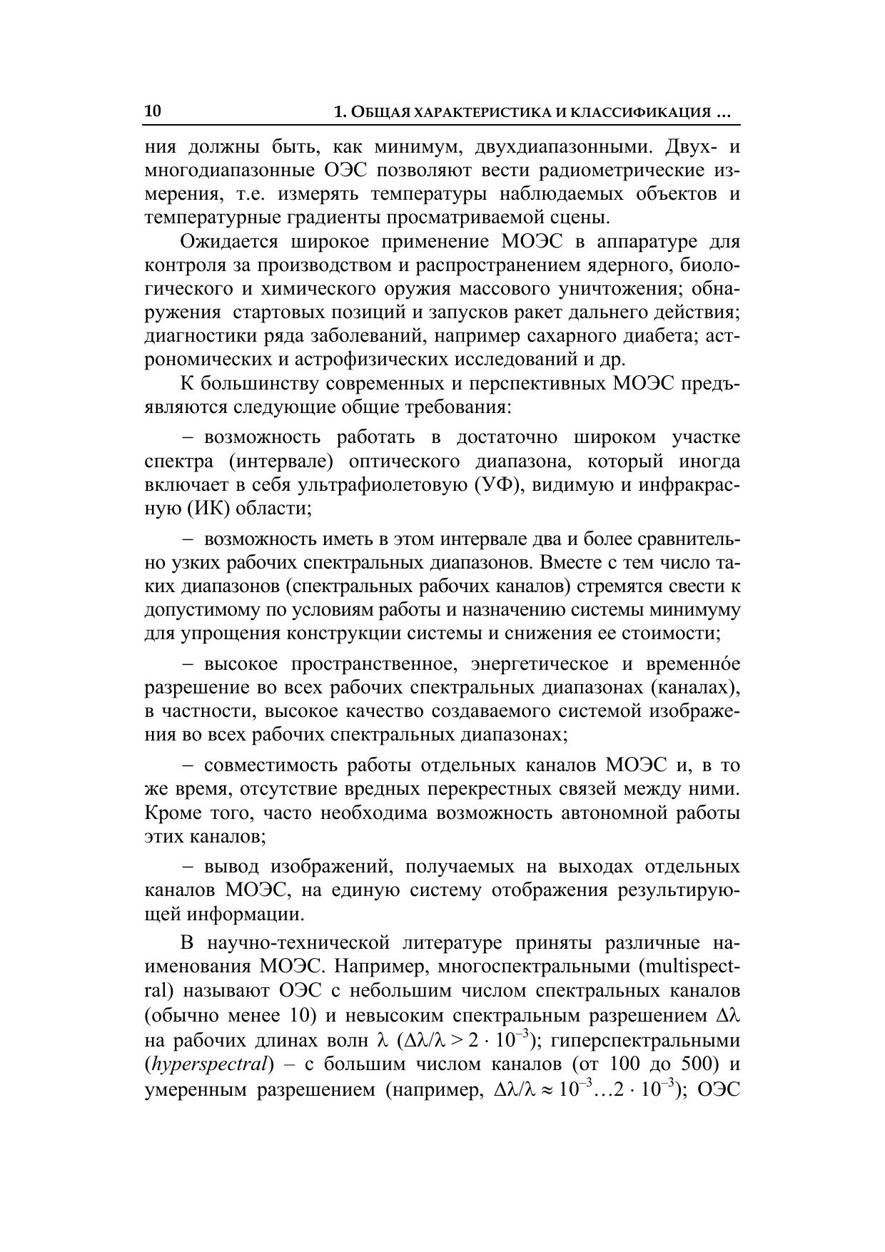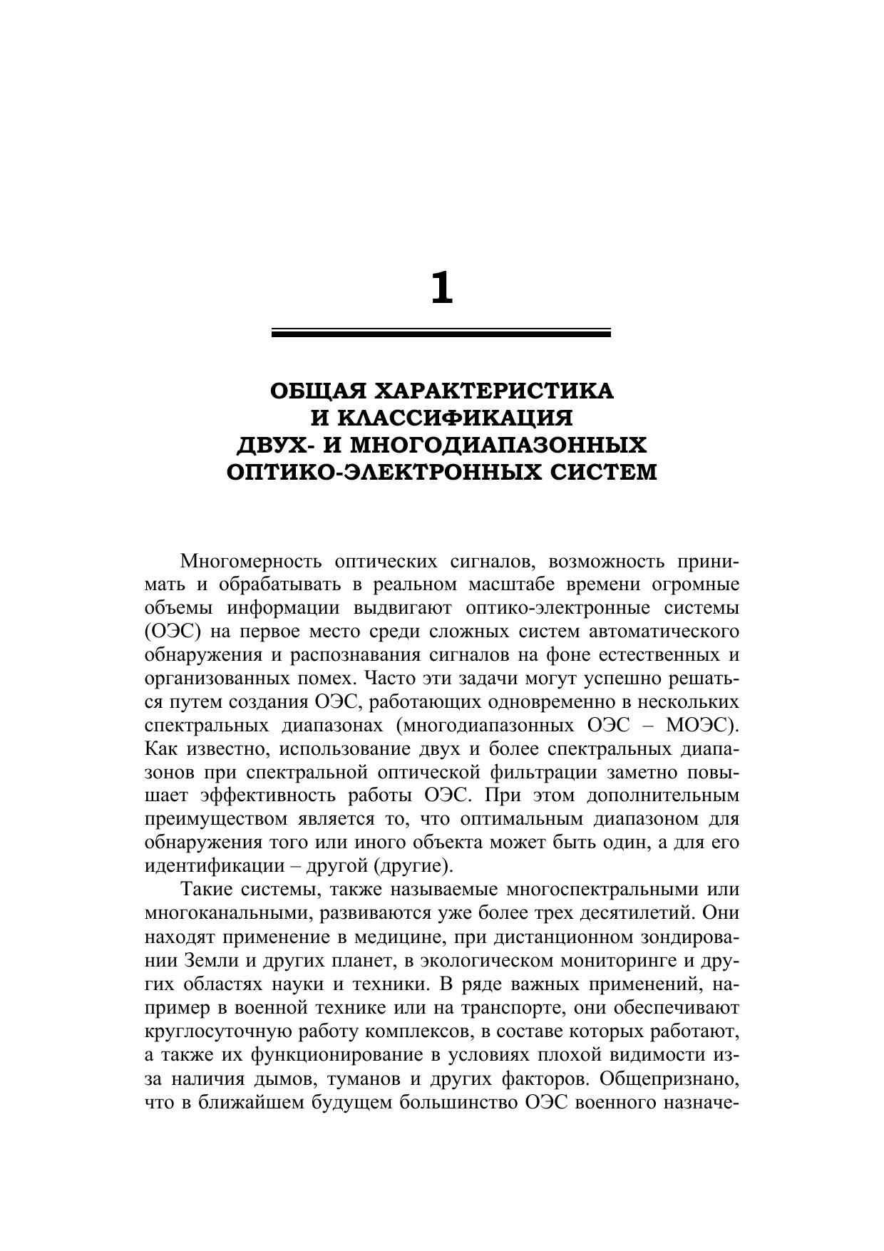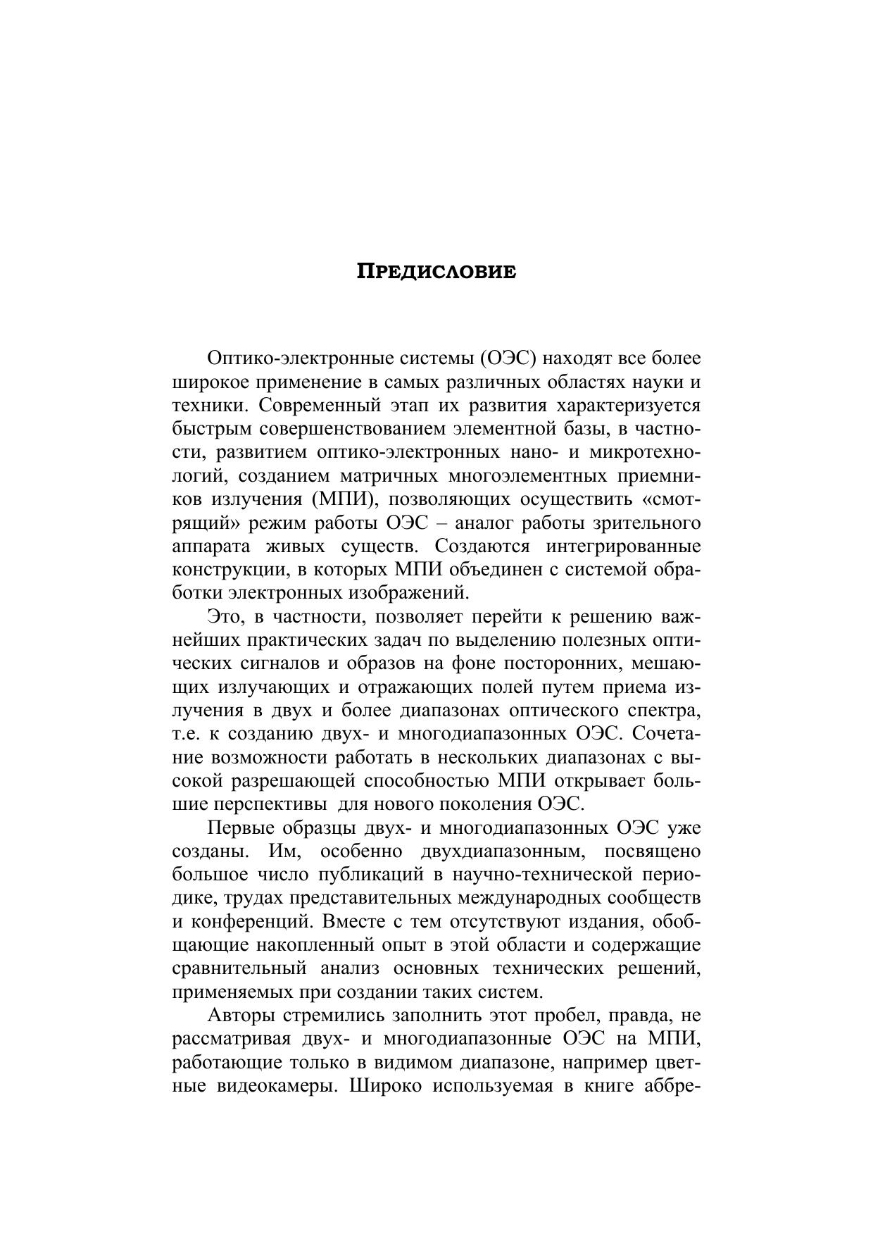 Излагаются принципы построения оптико-электронных систем с матричными приемниками излучения, работающих в двух и более спектральных диапазонах. Описываются основные узлы таких систем: оптические системы выделения рабочих спектральных диапазонов, матричные двух- и много -диапазонные (многоспектральные) приемники излучения, системы объединения изображений, получаемых в различных спектральных диапазонах. Приводятся примеры использования двух- и многодиапазонных оптико-электронных систем в различных областях науки, техники, народного хозяйства, в военном деле. Для разработчиков и потребителей оптико-электронных средств и методов. Может использоваться в учебном процессе высших и средних специальных учебных заведений по направлениям в области оптотехники, фотоники и оптоинформатики.