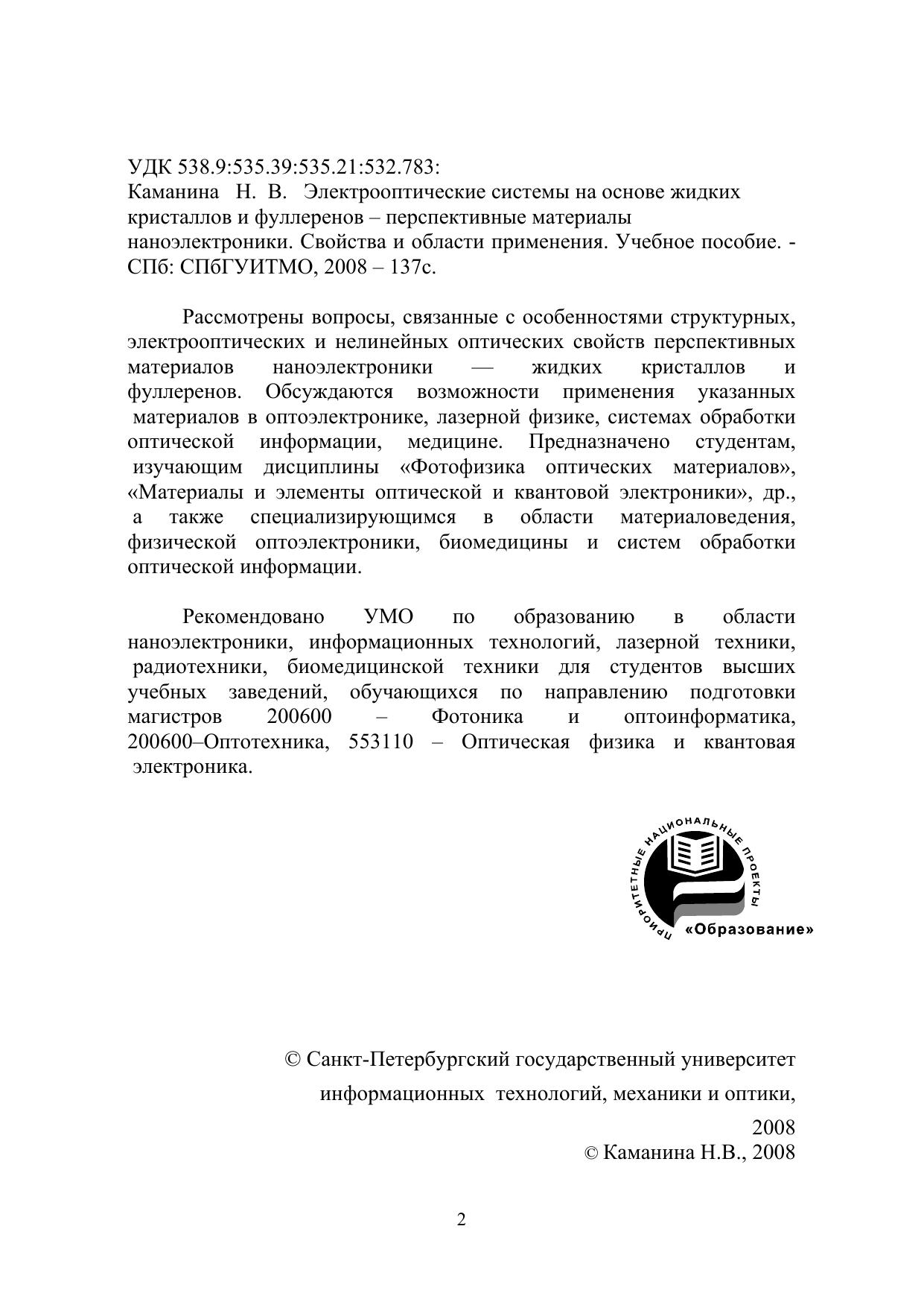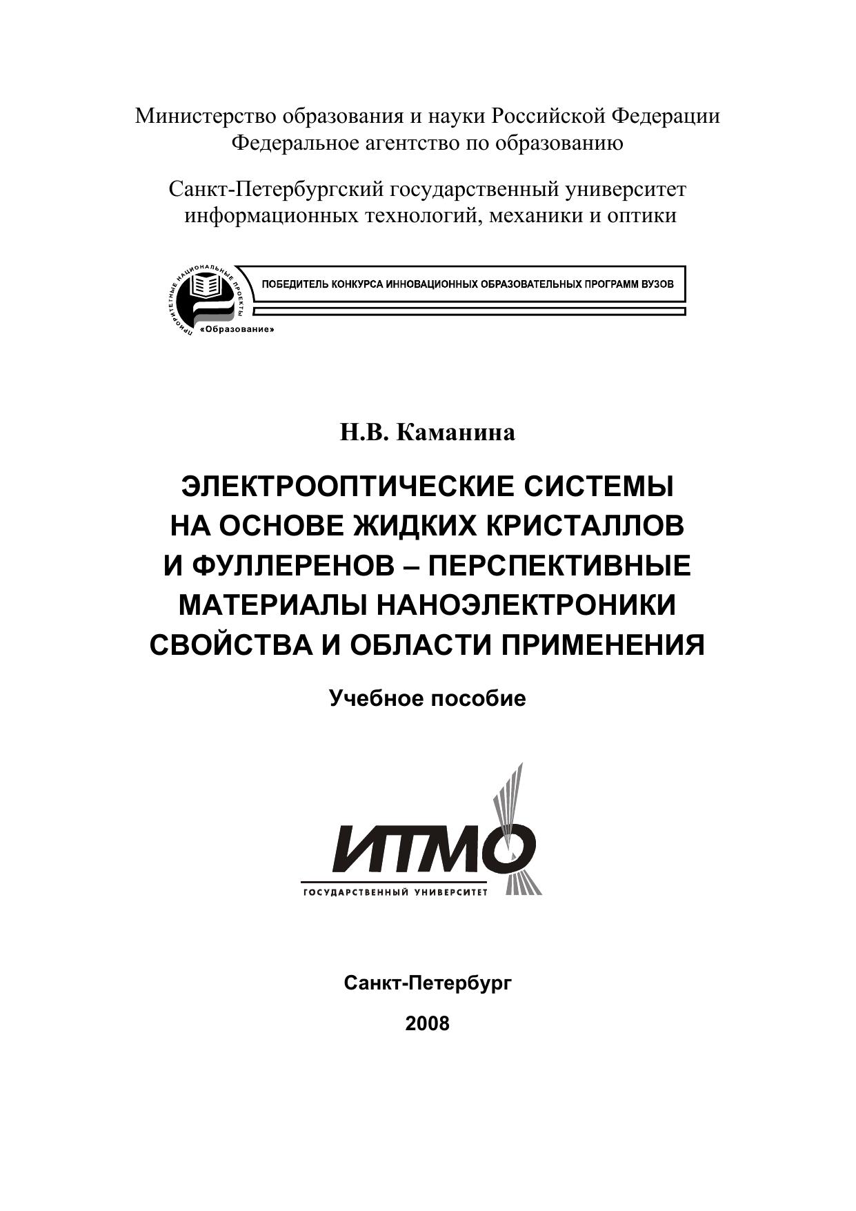 Рассмотрены вопросы, связанные с особенностями структурных, электрооптических и нелинейных оптических свойств перспективных материалов наноэлектроники — жидких кристаллов и фуллеренов. Обсуждаются возможности применения указанных материалов в оптоэлектронике, лазерной физике, системах обработки оптической информации, медицине. Предназначено студентам, изучающим дисциплины «Фотофизика оптических материалов», «Материалы и элементы оптической и квантовой электроники», др., а также специализирующимся в области материаловедения, физической оптоэлектроники, биомедицины и систем обработки оптической информации.