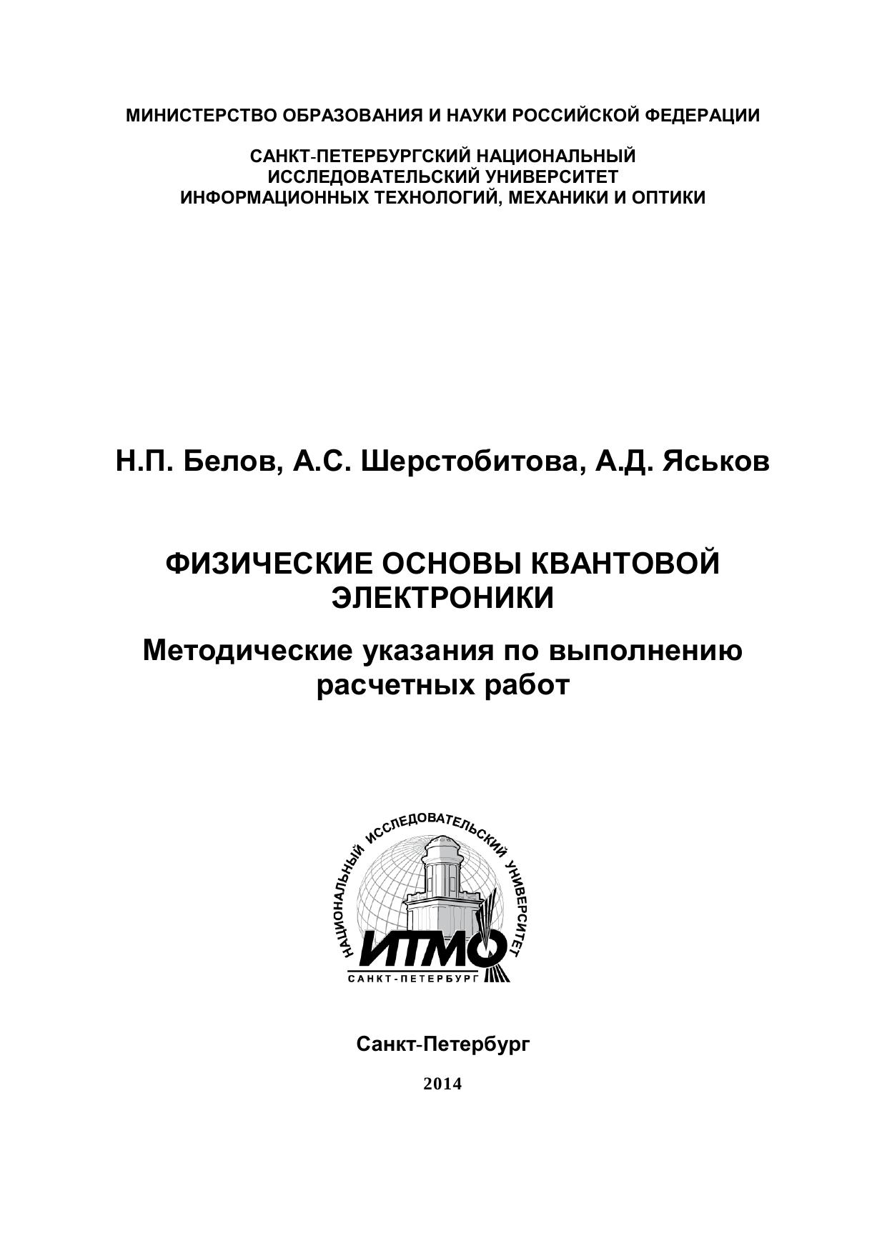 Учебное пособие включает методические указания к выполнению расчетных работ. Приводятся основные теоретические положения, задания на расчетные работы, а также рекомендации по их выполнению. Методические указания предназначены для студентов ИФФ, обучающихся по направлениям бакалавров: 140400 «Техническая физика», 223200 «Техническая физика», 200500 «Лазерная техника и лазерные технологии» профилям: 140400.62 «Физика и техника оптоэлектронных информационных систем», 223200.62.11 «Лазерные технологии», 200500.62 «Лазерная техника и лазерные технологии», 223200.62.09 «Физика когерентно-оптических и оптоэлектронных систем».