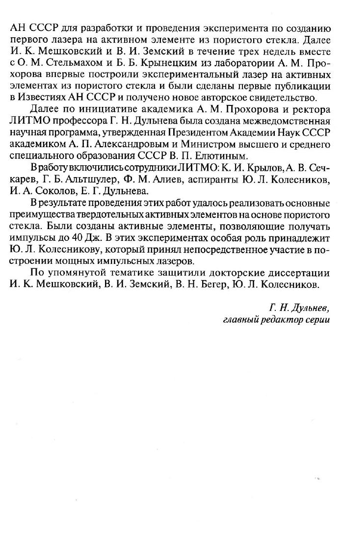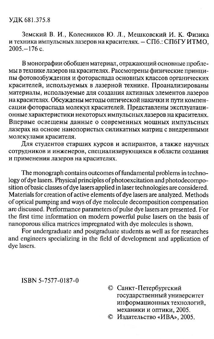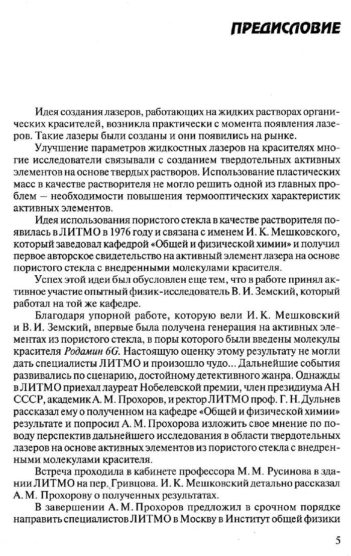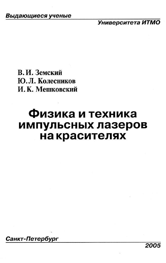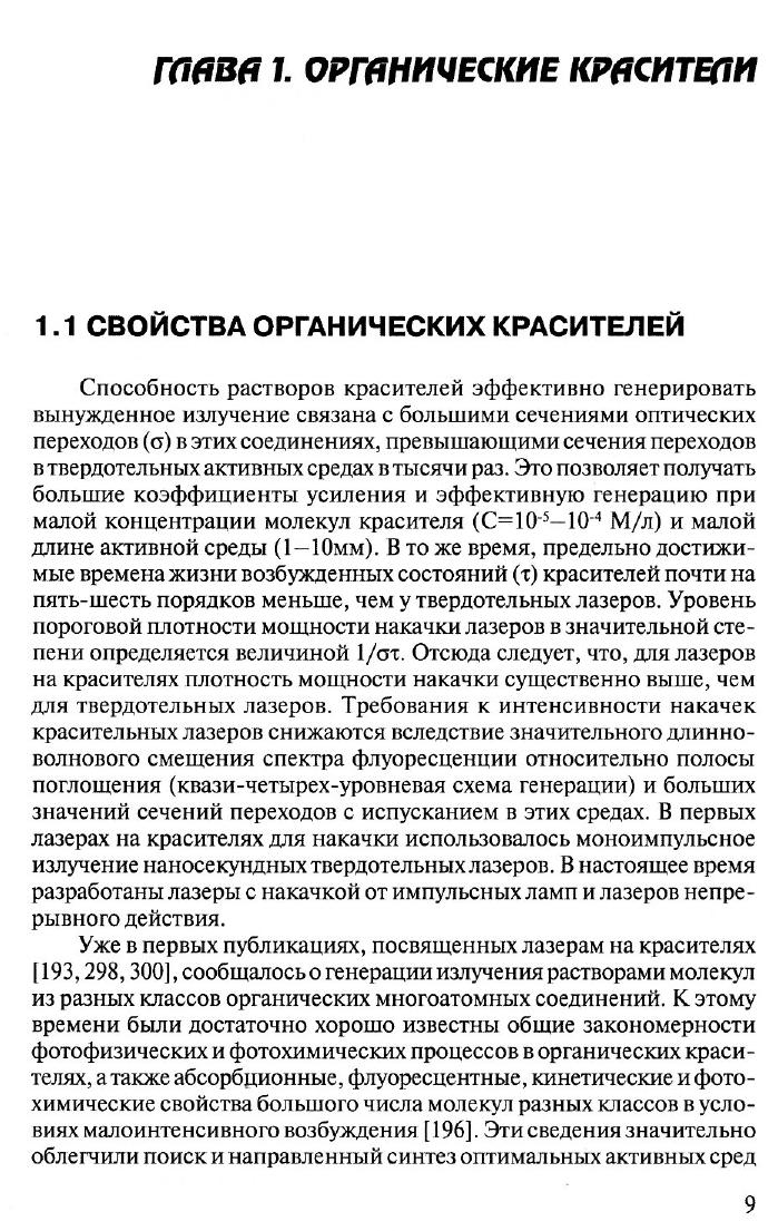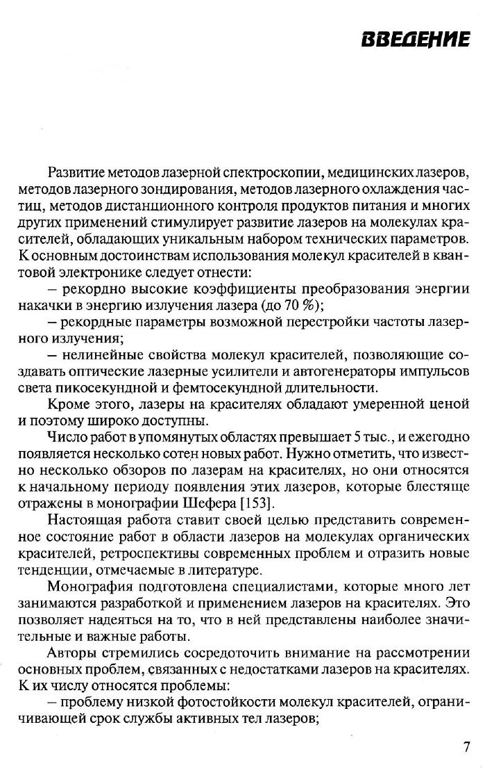 В монографии обобщен материал, отражающий основные проблемы в технике лазеров на красителях. Рассмотрены физические принципы фотовозбуждения и фотораспада основных классов органических красителей, используемых в лазерной технике. Проанализированы материалы, используемые для создания активных элементов лазеров на красителях. Обсуждены методы оптической накачки и пути компенсации фотораспада молекул красителей. Представлены эксплуатационные характеристики некоторых импульсных лазеров на красителях. Впервые освещены данные о современных мощных импульсных лазерах на основе нанопористых силикатных матриц с внедренными молекулами красителя. Для студентов старших курсов и аспирантов, а также научных сотрудников и инженеров, специализирующихся в области создания и применения лазеров на красителях.