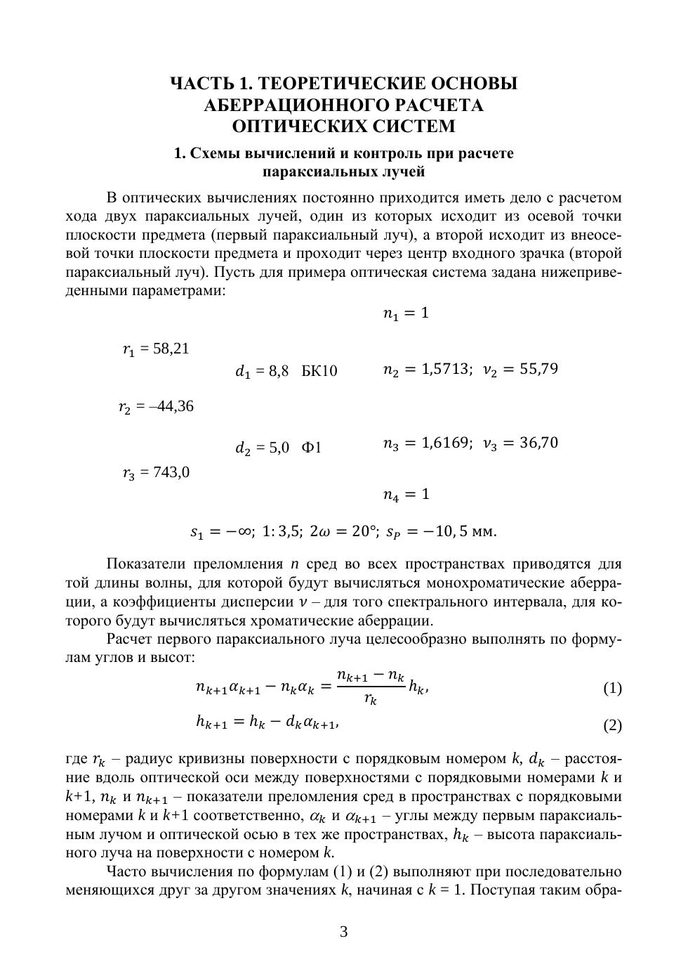 В учебном пособии приведены основные формулы, определяющие теоретическую основу при расчете оптических систем в области монохроматических аберраций 3-го порядка и хроматизма 1-го порядка. Изложена теория сложения аберраций отдельных компонентов сложной системы при вычислении ее аберраций в линейной, угловой и диоптрийной мере. Описаны методы габаритного и аберрационного расчетов ряда оптических систем, доведенных до численных примеров. На основе эйконала Шварцшильда изложена теория монохроматических аберраций высших порядков. Описаны виды отдельных аберраций 5-го порядка и способы их выделения. Пособие предназначено для студентов, обучающихся по направлению «Оптотехника» и специальности «Оптико-электронные приборы и системы». Может быть использовано в учебном процессе родственных направлений и специальностей, а также специалистами при разработке оптических систем на предприятиях.