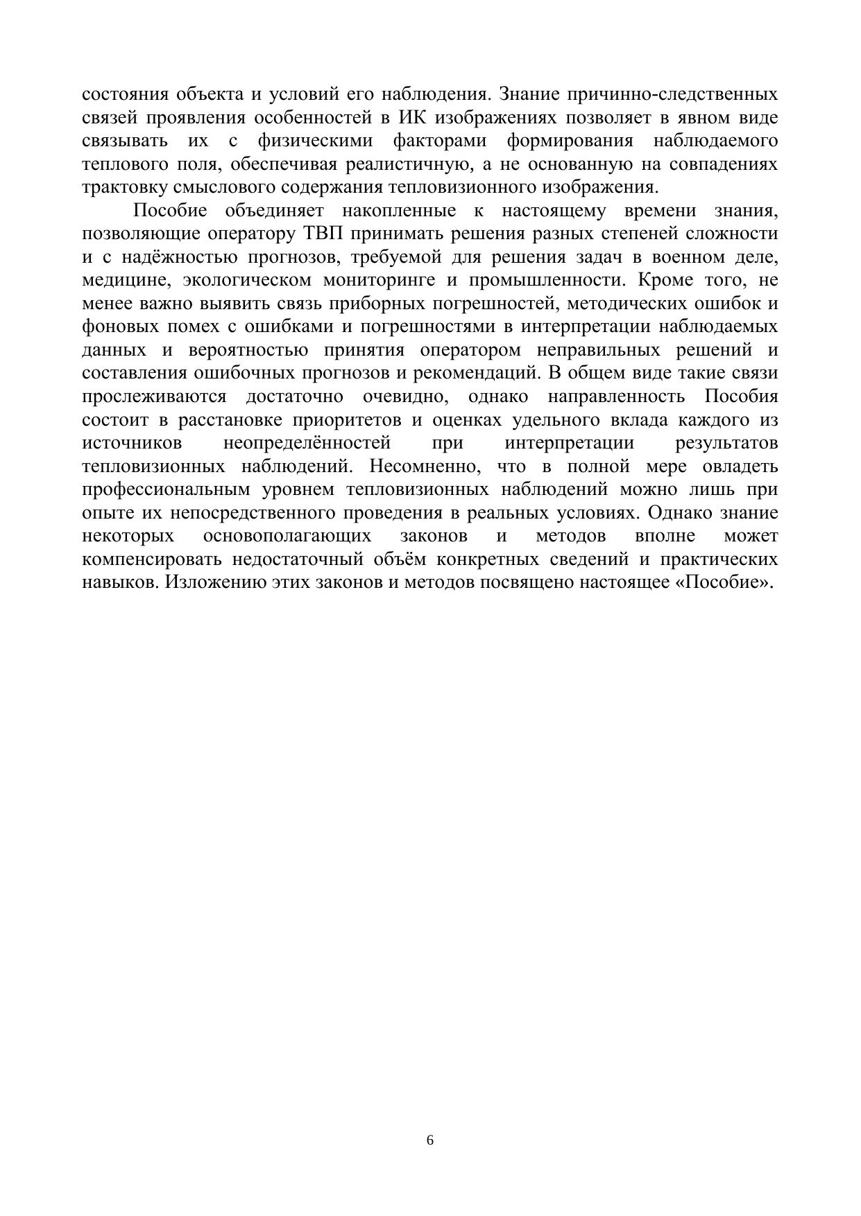 «Пособие» опирается на современный библиографический материал, посвящённый теоретическим аспектам построения оптико-электронных приборов и на нормативные документы, регламентирующие применение ИК приборов для наблюдения и диагностики природных и антропогенных объектов. Основная задача, которая ставится перед «Пособием» – служить связующим звеном между разработчиками ИК приборов дистанционного зондирования и непосредственными пользователями этих приборов, осуществляющими выявление смысловой информации из результатов тепловизионного наблюдения при решении конкретных задач разных ступеней сложности в военном деле, в медицине, экологическом мониторинге и в промышленности. Особое внимание уделено выявлению связи приборных погрешностей, методических ошибок и фоновых помех с ошибками и погрешностями в интерпретации наблюдаемых данных и вероятностью принятия оператором неправильных решений. В общем виде такие связи прослеживаются достаточно очевидно, однако профессиональная направленность «Пособия» состоит в расстановке приоритетов и оценках удельного вклада каждого из источников неопределённостей при интерпретации результатов тепловизионных наблюдений и, соответственно, обзоре методов и приёмов, уменьшающих эту неопределённость. Рекомендовано федеральным учебно-методическим объединением в системе