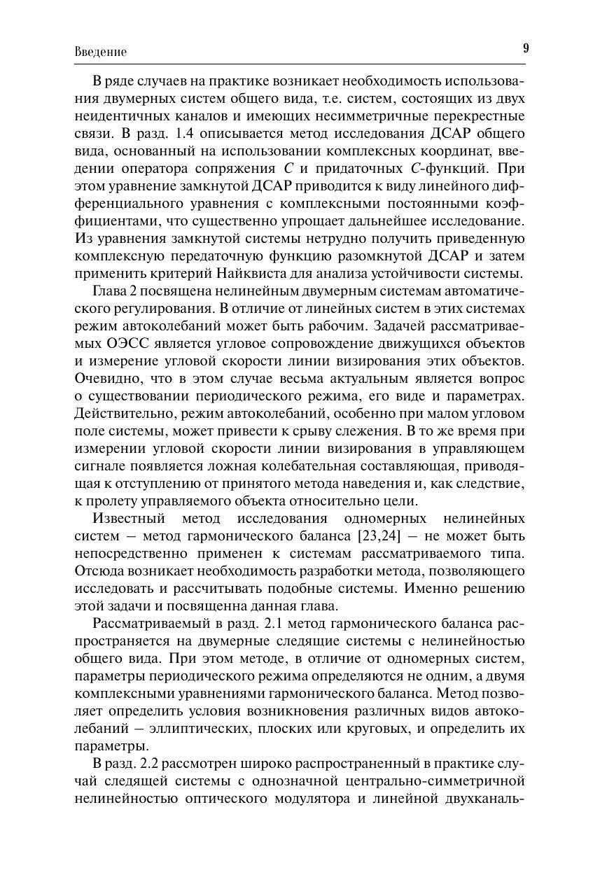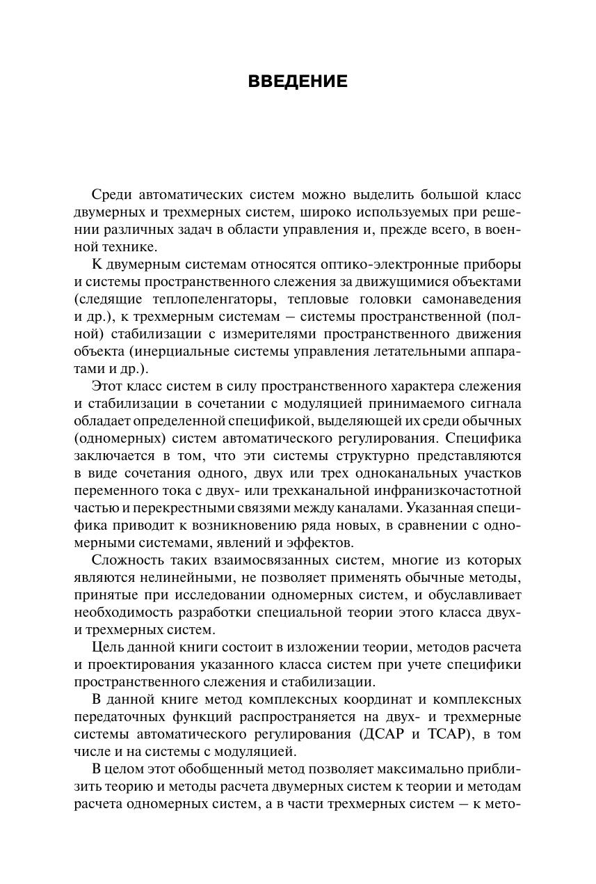 Изложены теория, методы расчета и проектирования линейных и нелинейных оптико-электронных систем углового пространственного сопровождения движущихся объектов (двумерных систем) и систем пространственной стабилизации движущихся объектов (трехмерных систем), широко используемых при решении различных задач в области управления, прежде всего в военной технике. Приведены методы анализа и синтеза, учитывающие специфику таких систем с модуляцией. Особое внимание уделено получению инженерных зависимостей, позволяющих обеспечить оптимальность характеристик систем. Для специалистов, занимающихся разработкой систем пространственного слежения (следящих теплопеленгаторов и др.) и систем пространственной стабилизации (инерциальных систем управления летательными аппаратами и др.). Может использоваться в учебном процессе соответствующих высших учебных заведений, подготавливающих студентов по направлению «Оптотехника» и специальности «Оптикоэлектронные приборы и системы».
